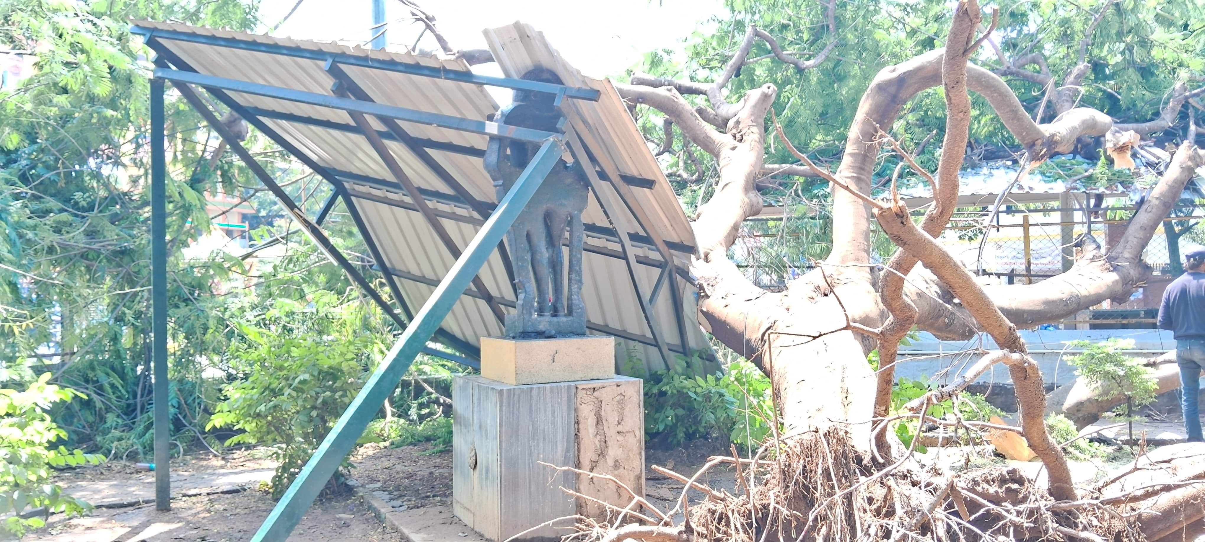 ಉರುಳಿದ ಮರ: ಶಡ್ಗೆ ಹಾನಿನಗರದ ಸರ್ವಜ್ಞ ಉದ್ಯಾನವನದಲ್ಲಿನ ಸರ್ವಜ್ಞ ಪುತ್ಥಳಿಕೆಗೆ ಅಳವಡಿಸಿದ್ದ ಶೀಟ್ಗಳ ಹೊದಿಕೆ ಮೇಲೆ ಹಿಂಭಾಗದ ಮರ ಉರುಳಿ ಬಿದ್ದು ಜಖಂಗೊಂಡಿದೆ. ಸ್ಥಳಕ್ಕಾಗಮಿಸಿದ ನಗರಸಭೆ ಅಧಿಕಾರಿಗಳು ನೆರಕ್ಕುರಳಿದ ಮರವನ್ನು ತೆರವುಗೊಳಿಸುವ ಮೂಲಕ ಸಾರ್ವಜನಿಕರ ಸಂಚಾರಕ್ಕೆ ಅನುವು ಮಾಡಿಕೊಟ್ಟರು.