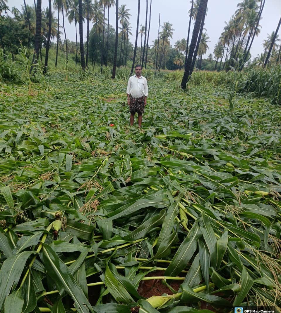 ಮಾಡದಕೆರೆ ಹೋಬಳಿ ನಾಕೀಕೆರೆ ಗ್ರಾಮದ ಬಸವರಾಜಪ್ಪ ಎಂಬುವವರು 1 ಎಕೆರೆ ಜಮೀನಿನಲ್ಲಿ ಬೆಳೆಯಲಾಗಿದ್ದ ಮೆಕ್ಕೆ ಜೋಳ ಸಂಪೂರ್ಣವಾಗಿ ನೆಲಕಚ್ಚಿರುವುದು.