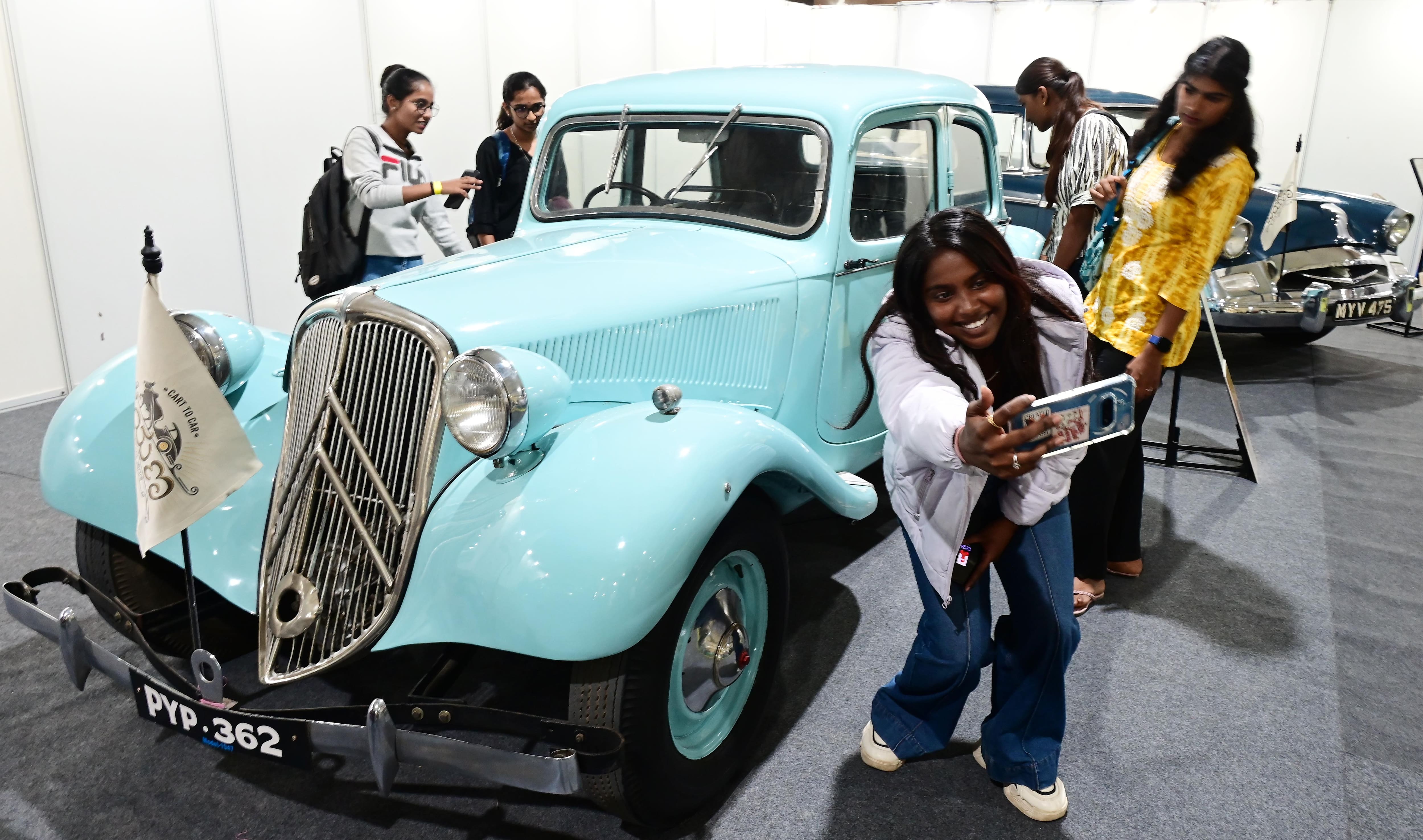 ವಿಂಟೇಜ್ ಕಾರನ್ನು ಕುತೂಹಲದಿಂದ ವೀಕ್ಷಿಸುತ್ತಿರುವ ಯುವತಿಯರು.