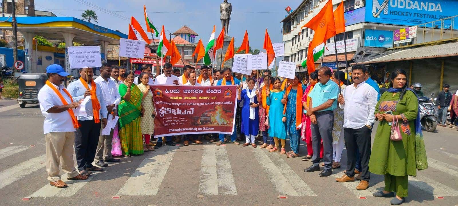 ಹಿಂದು ಜಾಗರಣ ವೇದಿಕೆ ವತಿಯಿಂದ ನಗರದ ಜನರಲ್ ತಿಮ್ಮಯ್ಯ ವೃತ್ತದಲ್ಲಿ ಪ್ರತಿಭಟನೆ ನಡೆಸಲಾಯಿತು.