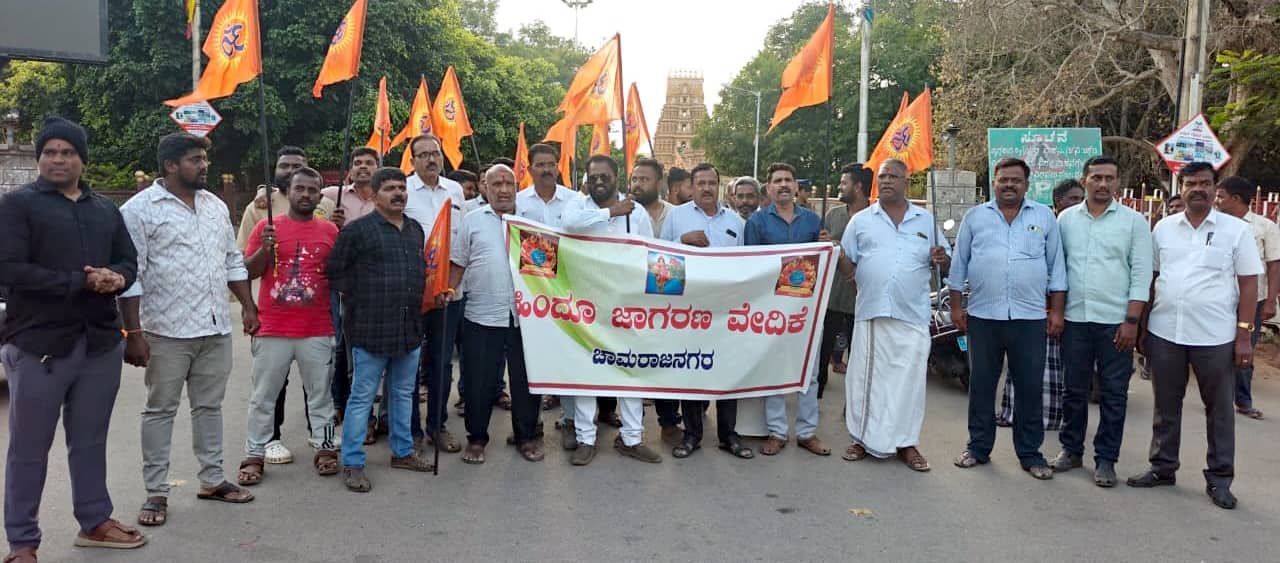 ನಗರದ ಚಾಮರಾಜೇಶ್ವರ ದೇವಸ್ಥಾನದ ಮುಂಭಾಗದಿಂದ ಪ್ರತಿಭಟನಾಕಾರರು ಮೆರವಣಿಗೆಯಲ್ಲಿ ಭುವನೇಶ್ವರಿ ವೃತ್ತಕ್ಕೆ ತೆರಳಿ ಮಾನವ ಸರಪಳಿ ಮಾಡಿ ಕಿಡಿಗೇಡಿಗಳ ವಿರುದ್ಧ ಆಕ್ರೋಶ ಹೊರಹಾಕಿದರು. ಈ ವೇಳೆ ಹಿಂದೂ ಜಾಗರಣಾ ವೇದಿಕೆಯ ಶಾಂತಕುಮಾರ್ ಮಾತನಾಡಿ, ಕಾಂಗ್ರೆಸ್ ಅಧಿಕಾರಕ್ಕೆ ಬಂದ ಮೇಲೆ ಹಿಂದುಗಳ ಹಬ್ಬಗಳ ಆಚರಣೆಗೆ ಅಡ್ಡಿಯಾಗಿದೆ. ಇತ್ತೀಚೆಗೆ ಹಲವೆಡೆ ಕಿಡಿಗೇಡಿಗಳು ಮೆರವಣಿಗೆಯಲ್ಲಿ ಕಲ್ಲು ತೂರಿರುವ ಘಟನೆಗಳು ನಡೆದಿದೆ. ಮೆರವಣಿಗೆಗೆ ಅಡ್ಡಿ ಪಡಿಸಿದ ವ್ಯಕ್ತಿಗಳ ಮೇಲೆ ಕಾನೂನು ಕ್ರಮವಹಿಸಿ ಘಟನೆಗೆ ಉತ್ತೇಜನ ನೀಡಿದ ಮೌಲಿಗಳನ್ನು ಪೋಲಿಸರು ವಶಕ್ಕೆ ಪಡೆಯಬೇಕು ಎಂದು ಒತ್ತಾಯಿಸಿದರು.ಪ್ರತಿಭಟನೆಯಲ್ಲಿ ಮರಾಠ ಸಮುದಾಯದ ಅಧ್ಯಕ್ಷ ವಂಕಟರಾವ್ ಸಾಠೆ, ವಿರಾಟ್ಶಿವು, ಬುಲೆಟ್ಚಂದ್ರು, ಚಂದ್ರಶೇಖರ ರಾವ್, ಕೂಸಣ್ಣ, ಪಾಪುರಂಗಸ್ವಾಮಿ, ಸುಂದರರಾಜ್, ಚಿದಂಬರ ಸೇರಿ ಹಲವರಿದ್ದರು.