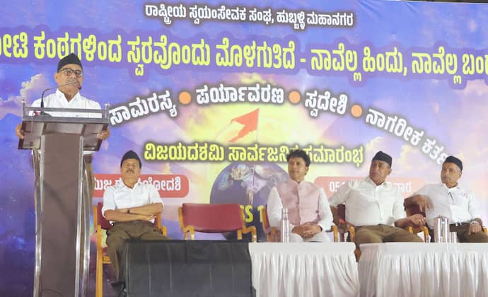 ಇಲ್ಲಿಯ ನೆಹರು ಮೈದಾನದಲ್ಲಿ ರಾಷ್ಟ್ರೀಯ ಸ್ವಯಂ ಸೇವಕ ಸಂಘದ ಹುಬ್ಬಳ್ಳಿ ಮಹಾನಗರ ಘಟಕದ ವತಿಯಿಂದ ಆರ್ಎಸ್ಎಸ್ ಶತಾಬ್ದಿ ವರ್ಷ ಹಾಗೂ ವಿಜಯದಶಮಿ ಅಂಗವಾಗಿ ಭಾನುವಾರ ನಡೆದ ಸಾರ್ವಜನಿಕ ಸಭೆಯಲ್ಲಿ ಮಾತನಾಡಿದರು.
