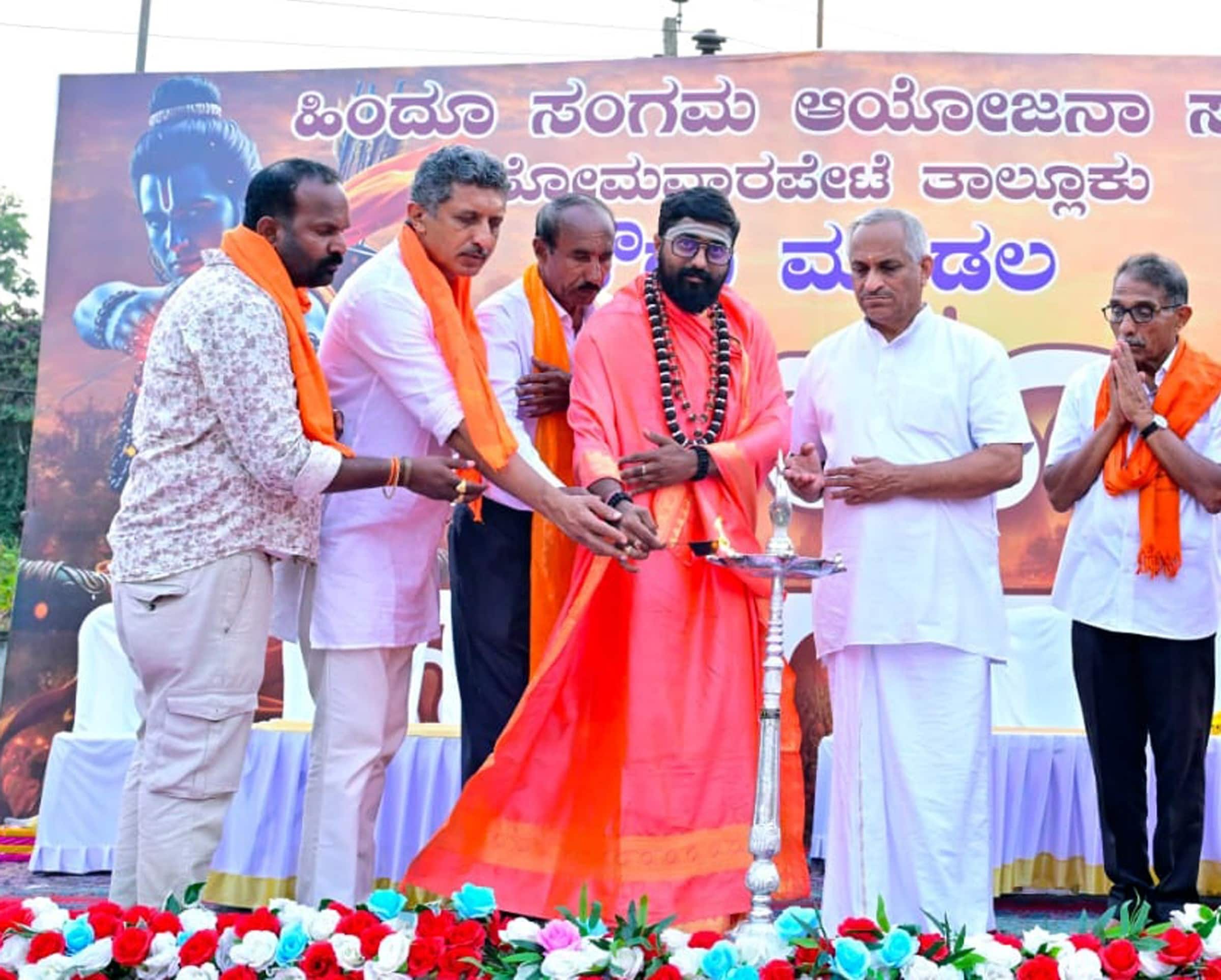 ಹಿಂದೂ ಸಂಗಮ ಇತರ ಧರ್ಮಗಳ ವಿರುದ್ಧದ ಹೋರಾಟವಲ್ಲ. ಹಿಂದೂಗಳ ಐಕ್ಯತೆ, ಒಗ್ಗಟ್ಟಿನ, ಸಂಘಟನೆ ಬಲ ಹೆಚ್ಚಿಸುವ ಮಂತ್ರವಾಗಿದೆ. ಭಾರತ ದೇಶ ತನ್ನದೇ ಆದ ವಿಶಿಷ್ಟ ಪರಂಪರೆಯನ್ನು ಹೊಂದಿದ್ದು ಈ ಕಾರಣದಿಂದಲೇ ಪ್ರಪಂಚಕ್ಕೆ ಭಾರತ ಧಾರ್ಮಿಕತೆಯ ಮಾದರಿ ರಾಷ್ಟ್ರವಾಗಿ ಹೊರಹೊಮ್ಮಿದೆ ಎಂದು ಬೆಂಗಳೂರು ಉತ್ತರ ಜಿಲ್ಲೆಯ ಸಂಘ ಪ್ರಚಾರಕ್ ಸುಧಾಕರ್ ಹೇಳಿದ್ದಾರೆ.ಇಲ್ಲಿನ ಚೌಡ್ಲು ಹಿಂದೂ ಸಂಗಮ ಆಯೋಜನ ಸಮಿತಿ ವತಿಯಿಂದ ನಡೆದ ಹಿಂದೂ ಸಂಗಮದಲ್ಲಿ ಪಾಲ್ಗೊಂಡು ಮಾತನಾಡಿದ ಅವರು, ಇಂದಿನ ಮಕ್ಕಳಿಗೆ ದೇಶಪ್ರೇಮದ ಪಾಠವನ್ನು ಪ್ರಾರಂಭಿಕ ಹಂತದಲ್ಲಿಯೇ ಕಲಿಸಿಕೊಡುವ ಮಹತ್ಕಾರ್ಯ ಪೋಷಕರಿಂದ ಆಗಬೇಕಿದೆ ಎಂದರು.ಯಸಳೂರು ತೆಂಕಲಗೂಡು ಬೃಹನ್ಮಠದ ಪೀಠಾಧ್ಯಕ್ಷ ಶ್ರೀ ಚೆನ್ನ ಸಿದ್ದೇಶ್ವರ ಶಿವಾಚಾರ್ಯ ಸ್ವಾಮೀಜಿ ಮಾತನಾಡಿ, ಹಿಂದೂ ರಾಷ್ಟ್ರದ ಏಕತೆಯ ಮನೋಭಾವನೆಯನ್ನು ಮಕ್ಕಳಲ್ಲಿ ಬಿತ್ತುವ ಕಾರ್ಯ ಆಗಬೇಕಿದೆ. ಭಾರತದ ಸ್ವಾತಂತ್ರ್ಯ ಮತ್ತು ಸನಾತನ ಧರ್ಮದ ವಿಚಾರಗಳನ್ನು ಮಕ್ಕಳಿಗೆ ತಿಳಿಸುವ ಕಾರ್ಯ ನಿರಂತರವಾಗಿ ನಡೆಯಬೇಕು ಎಂದರು.ಮಂಡಲ ಅಧ್ಯಕ್ಷ ಚಿಂತು, ಸಂಗಮ ಸಮಿತಿ ಪ್ರಮುಖರಾದ ಸನತ್, ಉದ್ಯಮಿ ಎಸ್.ಎಲ್.ಸೀತಾರಾಮ್, ಹಿರಿಯ ಸ್ವಯಂ ಸೇವಕರಾದ ಕಿಬ್ಬೆಟ್ಟ ಶೇಷಪ್ಪ ಮತ್ತಿತರರು ಇದ್ದರು.ಇಲ್ಲಿನ ಚೌಡ್ಲು ಹಿಂದೂ ಸಂಗಮ ಆಯೋಜನ ಸಮಿತಿ ವತಿಯಿಂದ ನಡೆದ ಹಿಂದೂ ಸಂಗಮದ ಶೋಭಾಯಾತ್ರೆ ಮೆರವಣಿಗೆ ಹಿಂದುತ್ವ ಬಲವರ್ಧನೆಯನ್ನು ಸಾಕ್ಷೀಕರಿಸಿತು.ಗ್ರಾಮದ ಮುಖ್ಯ ಬೀದಿಗಳಲ್ಲಿ ಸಂಚರಿಸಿ ಆಲೆಕಟ್ಟೆ ರಸ್ತೆಯ ಮೂಲಕ ಕೃಷಿ ಉತ್ಪನ್ನ ಮಾರುಕಟ್ಟೆ ಸಮಿತಿಯ ಪ್ರಾಂಗಣದ ಆವರಣದಲ್ಲಿ ಸಮಾವೇಶಗೊಂಡಿತು. ಮೆರವಣಿಗೆಯಲ್ಲಿ ಭಜನಾ ನೃತ್ಯ, ಚೆಂಡೆ ಮದ್ದಳೆ, ಛದ್ಮವೇಷಗಳು, ಶ್ರೀ ರಾಮನ ಘೋಷಣೆಗಳು, ಬಾಬಾ ಸಾಹೇಬ್ ಅಂಬೇಡ್ಕರ್ ರಥ ಯಾತ್ರೆ, ದೇಶ ಪ್ರೇಮ ಪ್ರತಿಬಿಂಬಿಸುವ ವಿವಿಧ ಕಲಾ ಕೃತಿಗಳು ಗಮನ ಸೆಳೆದವು.೦೫ಎಸ್ಪಿಟಿ೦೩:ಸೋಮವಾರಪೇಟೆ ಸಮೀಪ ಚೌಡ್ಲು ಹಿಂದೂ ಸಂಗಮ ವತಿಯಿಂದ ಆಲೆಕಟ್ಟೆ ರಸ್ತೆಯಲ್ಲಿರುವ ಕೃಷಿ ಉತ್ಪನ್ನ ಮಾರುಕಟ್ಟೆ ಸಮಿತಿ ಪ್ರಾಂಗಣದ ಆವರಣದಲ್ಲಿ ಹಿಂದೂ ಸಂಗಮ ಸಮಾವೇಶವನ್ನು ಗಣ್ಯರು ಉದ್ಘಾಟಿಸಿದರು.