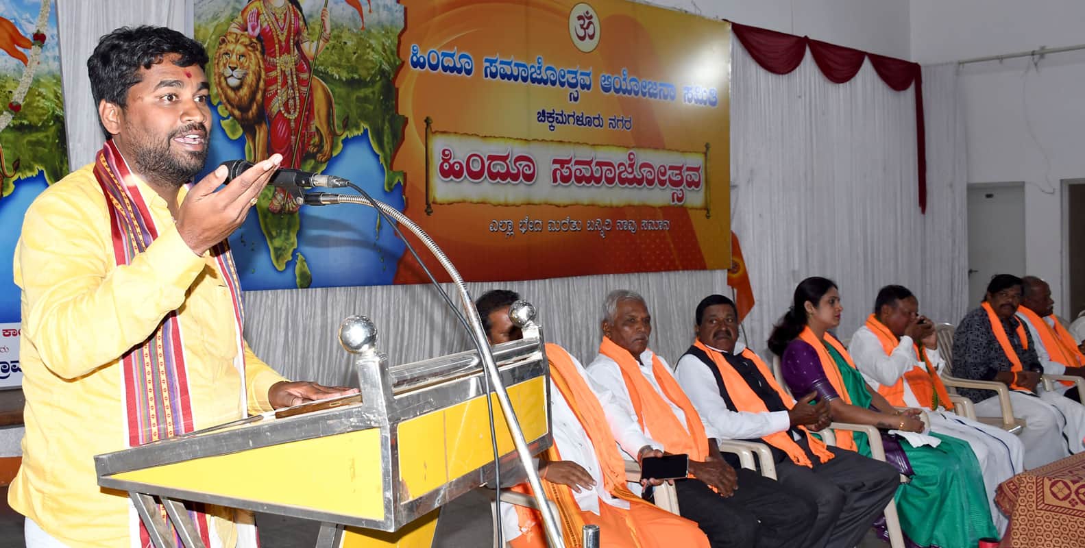 ಚಿಕ್ಕಮಗಳೂರಿನ ಗಾಯತ್ರಿದೇವಿ ಸಮುದಾಯ ಭವನದಲ್ಲಿ ಭಾನುವಾರ ನಡೆದ ಹಿಂದೂ ಸಮಾಜೋತ್ಸವ ಕಾರ್ಯಕ್ರಮದಲ್ಲಿ ಪ್ರಭಂಜನ್ ಸೂರ್ಯ ಮಾತನಾಡಿದರು.