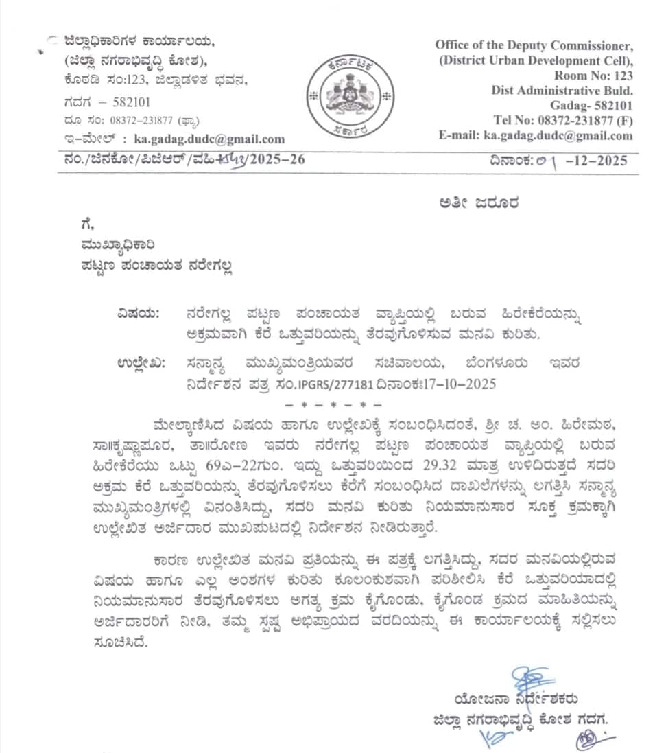 ಗದಗ: ಜಿಲ್ಲೆಯ ನರೇಗಲ್ಲ ಪಟ್ಟಣ ಪಂಚಾಯಿತಿ ವ್ಯಾಪ್ತಿಯಲ್ಲಿರುವ ಐತಿಹಾಸಿಕ ಹಿರೇಕೆರೆಯ ಒತ್ತುವರಿ ವಿವಾದಕ್ಕೆ ಸಂಬಂಧಿಸಿದಂತೆ ಮುಖ್ಯಮಂತ್ರಿಗಳ ಸಚಿವಾಲಯವು ಗದಗ ಜಿಲ್ಲಾಡಳಿತ(ಜಿಲ್ಲಾ ನಗರಾಭಿವೃದ್ಧಿ ಕೋಶ)ಕ್ಕೆ ತುರ್ತು ಕ್ರಮಕ್ಕೆ ನಿರ್ದೇಶನ ನೀಡಿದರೂ ಅಧಿಕಾರಿಗಳು ಮಾತ್ರ ಜಾಣಕುರುಡು ಪ್ರದರ್ಶನ ಮಾಡುತ್ತಿದ್ದಾರೆ.ಮುಖ್ಯಮಂತ್ರಿ ಕಾರ್ಯಾಲಯದಿಂದ ಬಂದಿರುವ ತುರ್ತು ಆದೇಶವನ್ನು ಉಲ್ಲೇಖಿಸಿ ಜಿಲ್ಲಾ ಯೋಜನಾ ನಿರ್ದೇಶಕರು ನರೇಗಲ್ಲ ಪಟ್ಟಣ ಪಂಚಾಯಿತಿ ಮುಖ್ಯಾಧಿಕಾರಿಗೆ ಡಿ. 1ರಂದು ಪತ್ರ ಬರೆದಿದ್ದು, ಅದರಲ್ಲಿ ಕೆರೆಯ ಬಹಳಷ್ಟು ಪ್ರದೇಶ ಒತ್ತುವರಿದಾರರ ಪಾಲಾಗಿದೆ ಎಂದು ಚ.ಅಂ. ಹಿರೇಮಠ ಎಂಬವರು ನೇರವಾಗಿ ಮುಖ್ಯಮಂತ್ರಿಗಳ ಕಚೇರಿಗೆ ಪತ್ರ ಬರೆದು ತಿಳಿಸಿದ್ದಾರೆ. ಮೂಲ ದಾಖಲೆ ಪತ್ರಗಳ ಸಮೇತ ನರೇಗಲ್ಲಿನ ಹಿರೇಕೆರೆಯ ಒಟ್ಟು ವಿಸ್ತೀರ್ಣ 69 ಎಕರೆ 22 ಗುಂಟೆ ಇದೆ. ಅಕ್ರಮ ಒತ್ತುವರಿ ಕಾರಣದಿಂದ ಪ್ರಸ್ತುತ ಕೇವಲ 29 ಎಕರೆ 32 ಗುಂಟೆ ಮಾತ್ರ ಉಳಿದಿದೆ. ಅಂದರೆ ಕೆರೆಯ ವಿಸ್ತೀರ್ಣದ ಅರ್ಧಕ್ಕಿಂತ ಹೆಚ್ಚು ಭಾಗವು(40 ಎಕರೆಗೂ ಹೆಚ್ಚು) ಕಬಳಿಕೆಯಾಗಿದೆ ಎಂಬ ಗಂಭೀರ ಆರೋಪ ಪತ್ರದಲ್ಲಿದೆ. ಈ ಪತ್ರವನ್ನು ಪುರಸ್ಕರಿಸಿರುವ ಸರ್ಕಾರ ಕ್ರಮಕ್ಕೆ ಸೂಚಿಸಿದ್ದು, ಕೂಡಲೇ ಕ್ರಮ ತೆಗೆದುಕೊಳ್ಳಿ ಎಂದು ಸೂಚಿಸಿದ್ದಾರೆ.ಪತ್ರ ಬರೆದು ಕೈತೊಳೆದುಕೊಂಡ ಜಿಲ್ಲಾಡಳಿತ: ಮುಖ್ಯಮಂತ್ರಿಗಳ ಸಚಿವಾಲಯದ ನಿರ್ದೇಶನ(ಸಂಖ್ಯೆ: ಐಪಿಜಿಆರ್ಎಸ್/277181 ದಿ: 17-10-2025) ಆಧರಿಸಿ, ಜಿಲ್ಲಾ ನಗರಾಭಿವೃದ್ಧಿ ಕೋಶದ ಯೋಜನಾ ನಿರ್ದೇಶಕರು, ನರೇಗಲ್ಲ ಪಟ್ಟಣ ಪಂಚಾಯಿತಿ ಮುಖ್ಯಾಧಿಕಾರಿಗೆ ಅರ್ಜಿದಾರರು ಸಲ್ಲಿಸಿರುವ ಕೆರೆಗೆ ಸಂಬಂಧಿಸಿದ ದಾಖಲೆಗಳು ಮತ್ತು ಒತ್ತುವರಿಯ ಎಲ್ಲ ಅಂಶಗಳನ್ನು ಸಮಗ್ರವಾಗಿ ಪರಿಶೀಲಿಸಿ, ಕೆರೆ ಒತ್ತುವರಿಯಾಗಿರುವುದು ದೃಢಪಟ್ಟರೆ, ಕೂಡಲೇ ನಿಯಮಾನುಸಾರ ತೆರವುಗೊಳಿಸಲು ಅಗತ್ಯ ಕಾನೂನು ಕ್ರಮಗಳನ್ನು ಕೈಗೊಳ್ಳುವುದು ಹಾಗೂ ಅರ್ಜಿದಾರರಿಗೆ ಕೈಗೊಂಡ ಕ್ರಮದ ಸ್ಪಷ್ಟ ಮಾಹಿತಿಯನ್ನು ನೀಡಬೇಕು ಎಂದು ಪತ್ರದಲ್ಲಿ ಉಲ್ಲೇಖಿಸಿ ಕೈತೊಳೆದುಕೊಂಡಿದೆ.ಈ ಆದೇಶದಿಂದಾಗಿ ನರೇಗಲ್ಲ ಹಿರೇಕೆರೆ ಒತ್ತುವರಿ ತೆರವು ಕಾರ್ಯಾಚರಣೆಗೆ ಚಾಲನೆ ದೊರೆತಂತಾಗಿದೆ. ಕೆರೆ ಸಂರಕ್ಷಣೆ ಮತ್ತು ಅಕ್ರಮ ತೆರವುಗೊಳಿಸುವ ನಿಟ್ಟಿನಲ್ಲಿ ಪಟ್ಟಣ ಪಂಚಾಯಿತಿ ಯಾವ ಕ್ರಮ ಕೈಗೊಳ್ಳುತ್ತದೆ ಎಂಬುದನ್ನು ಜಿಲ್ಲೆಯ ಜನರು ಕುತೂಹಲದಿಂದ ಎದುರು ನೋಡುತ್ತಿದ್ದಾರೆ.
