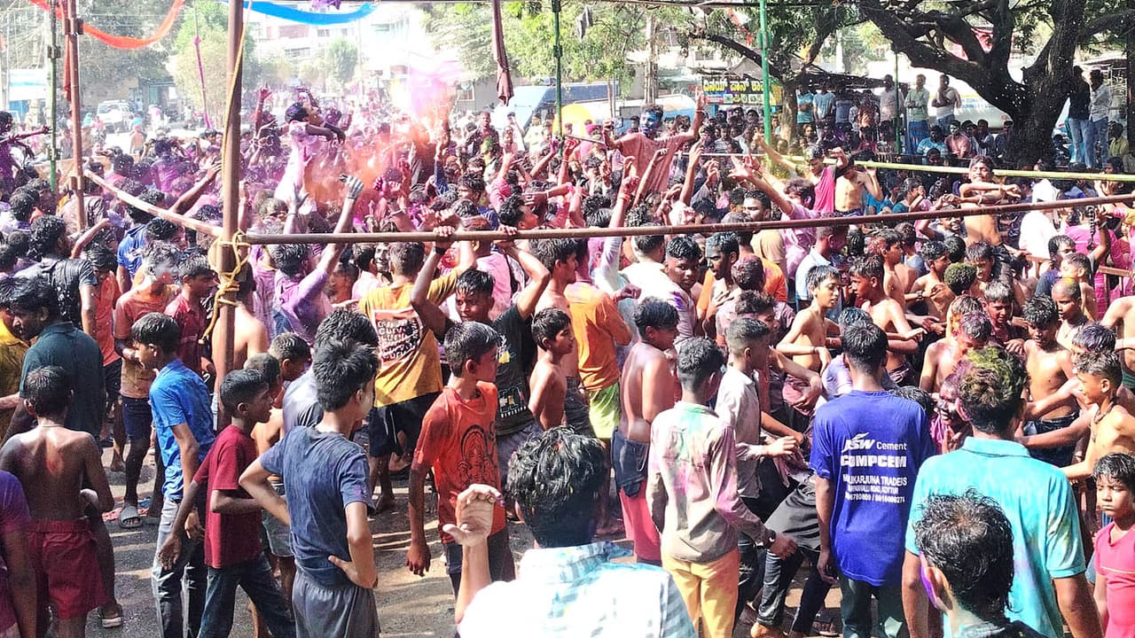 ಕಳೆಗುಂದಿದ ಹಬ್ಬ:ರೇನ್ ಡ್ಯಾನ್ಸ್ ಮೂಲಕ ನೃತ್ಯ ಮಾಡುತ್ತಾ ಪರಸ್ಪರ ಬಣ್ಣ ಎರಚಿ ಹೋಳಿ ಹಬ್ಬ ಆಚರಿಸಿದರೂ ಈ ಹಿಂದಿನ ವರ್ಷಗಳಿಗಿಂತ ಈ ಬಾರಿ ಹಬ್ಬ ಕಳೆಗುಂದಿದಂತಿತ್ತು. ದ್ವಿತೀಯ ಪಿಯು ಪರೀಕ್ಷೆ ಆರಂಭವಾಗಿದ್ದರಿಂದ ಹಾಗೂ ಇದೇ 18ರಿಂದ ಎಸ್ಸೆಸ್ಸೆಲ್ಸಿ ಪರೀಕ್ಷೆ ಇದ್ದುದರಿಂದ ಯುವಕರ ಸಂಖ್ಯೆ ಕಡಿಮೆ ಇತ್ತು. ಹೆಚ್ಚು ಚಿಕ್ಕಮಕ್ಕಳು ಹಾಗೂ 20 ವರ್ಷ ಮೇಲ್ಪಟ್ಟವರು ಸ್ವಲ್ಪ ಮಟ್ಟಿಗೆ ಪಾಲ್ಗೊಂಡರು.
