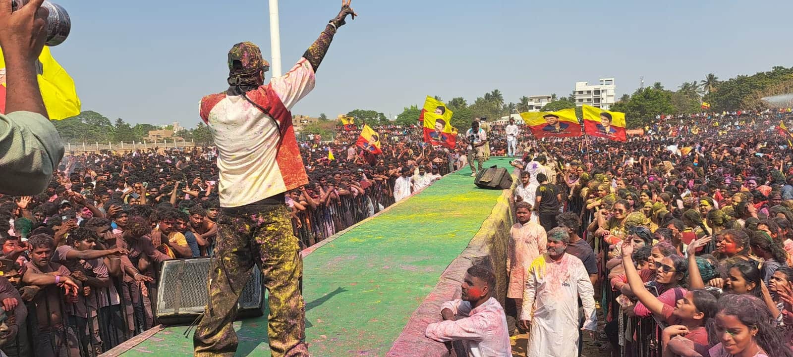 ಹೊಸಪೇಟೆ: ಶಾಸಕ ಎಚ್.ಆರ್. ಗವಿಯಪ್ಪ ಪುತ್ರರಾದ ಎಚ್.ಜಿ. ಗುರುದತ್ ಹಾಗೂ ಎಚ್.ಜಿ. ವಿರುಪಾಕ್ಷಿ ನೇತೃತ್ವದಲ್ಲಿ ನಗರದ ಡಾ. ಪುನೀತ್ ರಾಜಕುಮಾರ್ ಜಿಲ್ಲಾ ಕ್ರೀಡಾಂಗಣದಲ್ಲಿ ಬುಧವಾರ ಹಮ್ಮಿಕೊಂಡಿದ್ದ ಹೋಳಿ ಹಬ್ಬದಲ್ಲಿ ಸಾವಿರು ಜನರು ಭಾಗವಹಿಸಿ, ಅತ್ಯಂತ ಉತ್ಸುಕರಾಗಿ, ಸಡಗರ ಸಂಮ್ರದೊಂದಿಗೆ ಮತ್ತು ವರ್ಣರಂಜಿತವಾಗಿ ಹೋಳಿ ಹಬ್ಬ ಆಚರಿಸಿದರು.ಹೋಳಿಯ ಬಣ್ಣದಾಟದ ಜೊತೆಗೆ ಕನ್ನಡ ರ್ಯಾಪರ್ ರಾಹುಲ್ ಡಿಟೋ ಅವರ ತಂಡದಿಂದ ಡಿಜಿ ಹಾಡುಗಳನ್ನು ಹಾಡುಗಳಿಗೆ ನೆರೆದಿದ್ದ ಯುವ ಸಮೂಹದ ಯುವಕ-ಯುವತಿಯರು ಹುಚ್ಚೆದು ಕುಣಿಯುತ್ತಿದ್ದರು.