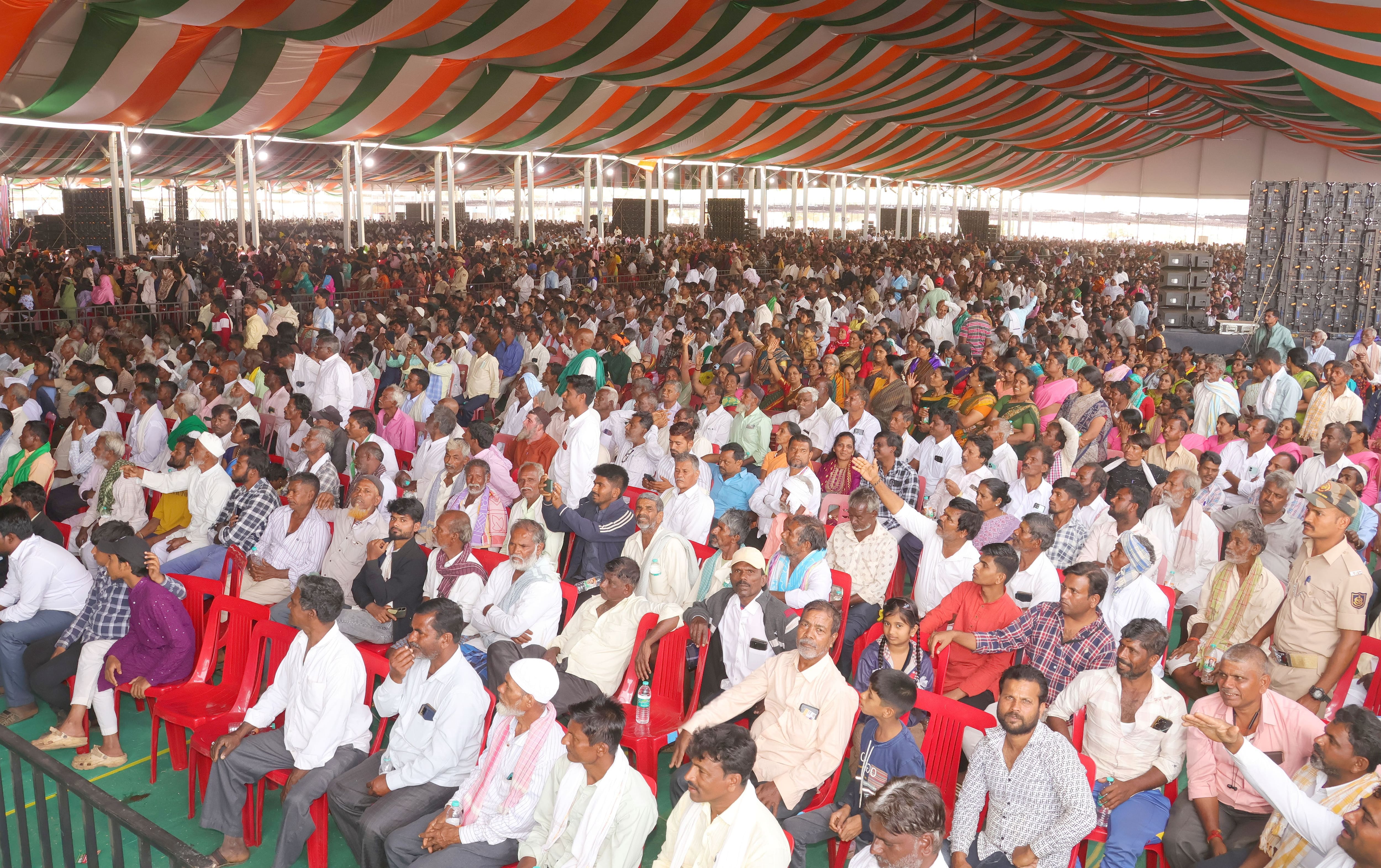 ಸರ್ಕಾರದ ಸಾಧನೆ ಪ್ರತಿಬಿಂಬಿಸುವ ಅತಿ ದೊಡ್ಡ ಕಾರ್ಯಕ್ರಮವಾಗಿದ್ದ ಮನೆಗಳ ಹಂಚಿಕೆ ಕಾರ್ಯಕ್ರಮಕ್ಕೆ ಜನರು ಸಾಗರದಂತೆ ಹರಿದು ಬರುತ್ತಿತ್ತು. 1000ಕ್ಕೂ ಅಧಿಕ ಬಸ್, 1500ಕ್ಕೂ ಅಧಿಕ ಟೆಂಪೊ, 8 ಸಾವಿರಕ್ಕೂ ಅಧಿಕ ಕಾರು ಸೇರಿದಂತೆ ವಿವಿಧ ವಾಹನಗಳ ಮೂಲಕ ಫಲಾನುಭವಿಗಳು, ಪಕ್ಷದ ಕಾರ್ಯಕರ್ತರು ಆಗಮಿಸಿದ್ದರು. 1.20 ಲಕ್ಷ ಆಸನ ಹಾಕಲಾಗಿತ್ತು. ಅದೆಲ್ಲವೂ ತುಂಬಿ ಹೊರಗೆ ಜನರು ನಿಂತು ವೀಕ್ಷಿಸುತ್ತಿದ್ದ ದೃಶ್ಯ ಕಂಡು ಬಂತು.ಡಿಕೆ ಅನುಪಸ್ಥಿತಿ..!