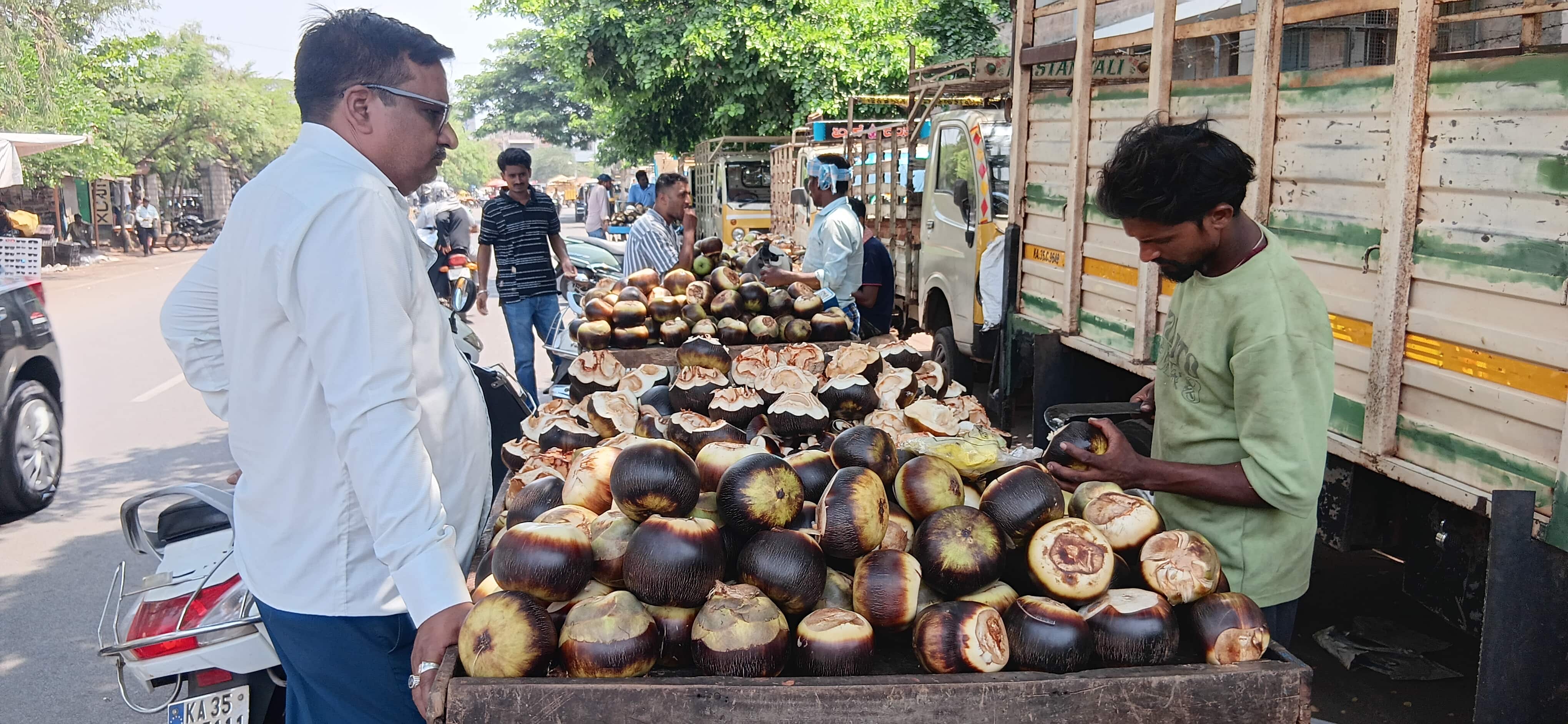 ನಗರದಲ್ಲಿ ತಾಳೆ ಹಣ್ಣಿಗೆ ಬೇಡಿಕೆ ಹೆಚ್ಚಿದೆ. ಬೆಲೆ ಲೆಕ್ಕಿಸದೇ ಜನರು ಖರೀದಿಗೆ ಮುಗಿ ಬಿದ್ದಿದ್ದಾರೆ.ಬೇಸಿಗೆಯಲ್ಲಿ ಬಾಯಾರಿಕೆ ನೀಗಿಸಿಕೊಳ್ಳಲು ಜನರು ತಂಪು ಪಾನೀಯ, ಎಳನೀರು, ಕಬ್ಬಿನಹಾಲು, ಕಲ್ಲಂಗಡಿ, ಮಜ್ಜಿಗೆ ಸೇರಿದಂತೆ ವಿವಿಧ ಹಣ್ಣಿನ ಜ್ಯೂಸ್ ಮೊರೆ ಹೋಗುವುದು ಸಾಮಾನ್ಯವಾಗಿದೆ. ಆದರೆ ಈ ಬಾರಿ ತಾಳೆ ಕೊಬ್ಬರಿ (ತಾಳೆಹಣ್ಣಿ)ನ ಬೇಡಿಕೆ ಹೆಚ್ಚಾಗಿದೆ.