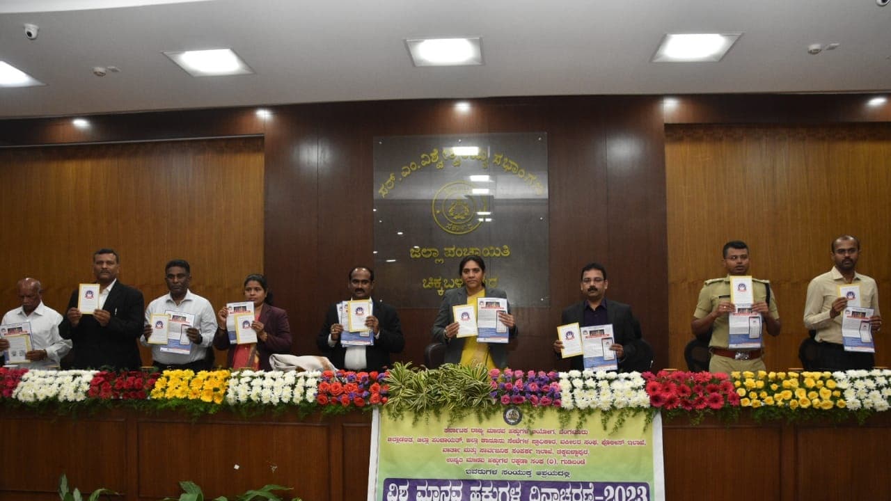 ಗುಡಿಬಂಡೆಯ ಉನ್ನತಿ ಮಾನವ ಹಕ್ಕುಗಳ ರಕ್ಷಣ ಸಂಘದ ಸಂಸ್ಥಾಪಕ ಅಧ್ಯಕ್ಷ ಜಿ.ವಿ. ವಿಶ್ವನಾಥ್ ಅವರು ಮಾನವ ಹಕ್ಕುಗಳ ಬಗ್ಗೆ ಉಪನ್ಯಾಸ ನೀಡಿದರು. ಕಾರ್ಯಕ್ರಮದಲ್ಲಿ ನ್ಯಾಯಾಧೀಶರು ಹಾಗೂ ಗಣ್ಯರು ಮಾನವ ಹಕ್ಕುಗಳ ಜಾಗೃತಿ ಕುರಿತು ರಾಜ್ಯ ಮಾನವ ಹಕ್ಕುಗಳ ಆಯೋಗ ಹೊರತಂದಿರುವ ಕಿರುಹೊತ್ತಿಗೆ ಹಾಗೂ ಕರಪತ್ರಗಳನ್ನು ಬಿಡುಗಡೆಗೊಳಿಸಿದರು. ಈ ವೇಳೆ ಹಿರಿಯ ಸಿವಿಲ್ ನ್ಯಾಯಾಧೀಶರು ಹಾಗೂ ಜಿಲ್ಲಾ ಕಾನೂನು ಸೇವೆಗಳ ಪ್ರಾಧಿಕಾರದ ಸದಸ್ಯ ಕಾರ್ಯದರ್ಶಿ ಎ.ಅರುಣಾ ಕುಮಾರಿ ಪ್ರತಿಜ್ಞಾವಿಧಿಯನ್ನು ಬೋಧಿಸಿದರು. ಜಿಪಂ ಉಪಕಾರ್ಯದರ್ಶಿ ಡಾ.ಎನ್. ಭಾಸ್ಕರ್, ಎಸಿ ಡಿ.ಎಚ್. ಅಶ್ವಿನ್, ಜಿಲ್ಲಾ ವಕೀಲರ ಸಂಘದ ಅಧ್ಯಕ್ಷ ಆರ್.ಶ್ರೀನಿವಾಸ್, ಪ್ರಧಾನ ಕಾರ್ಯದರ್ಶಿ ಎಸ್.ಎಂ.ಮುರಳಿ ಮೋಹನ್, ರಾಷ್ಟ್ರೀಯ ಮಾನವ ಹಕ್ಕುಗಳು ಜಿಲ್ಲಾ ಅಧ್ಯಕ್ಷ ಟಿ.ಆರ್.ಕೃಷ್ಣಪ್ಪ, ಸರ್ಕಾರಿ ಮಹಿಳಾ ಕಾಲೇಜಿನ ಪ್ರಾಂಶುಪಾಲ ಚಂದ್ರಯ್ಯ, ಕೆಂಪೇಗೌಡ ಕಾನೂನು ಕಾಲೇಜಿನ ಪ್ರಾಂಶುಪಾಲೆ ಶೋಭಾ ಹಾಗೂ ವಿದ್ಯಾರ್ಥಿಗಳು ಇದ್ದರು.ಸಿಕೆಬಿ-2 ಚಿಕ್ಕಬಳ್ಳಾಪುರ ನಗರದಲ್ಲಿ ನಡೆದ ಕಾರ್ಯಕ್ರಮದಲ್ಲಿ ರಾಜ್ಯ ಮಾನವ ಹಕ್ಕುಗಳ ಆಯೋಗ ಹೊರತಂದಿರುವ ಕಿರುಹೊತ್ತಿಗೆಯನ್ನು ಗಣ್ಯರು ಬಿಡುಗಡೆ ಮಾಡಿದರು.