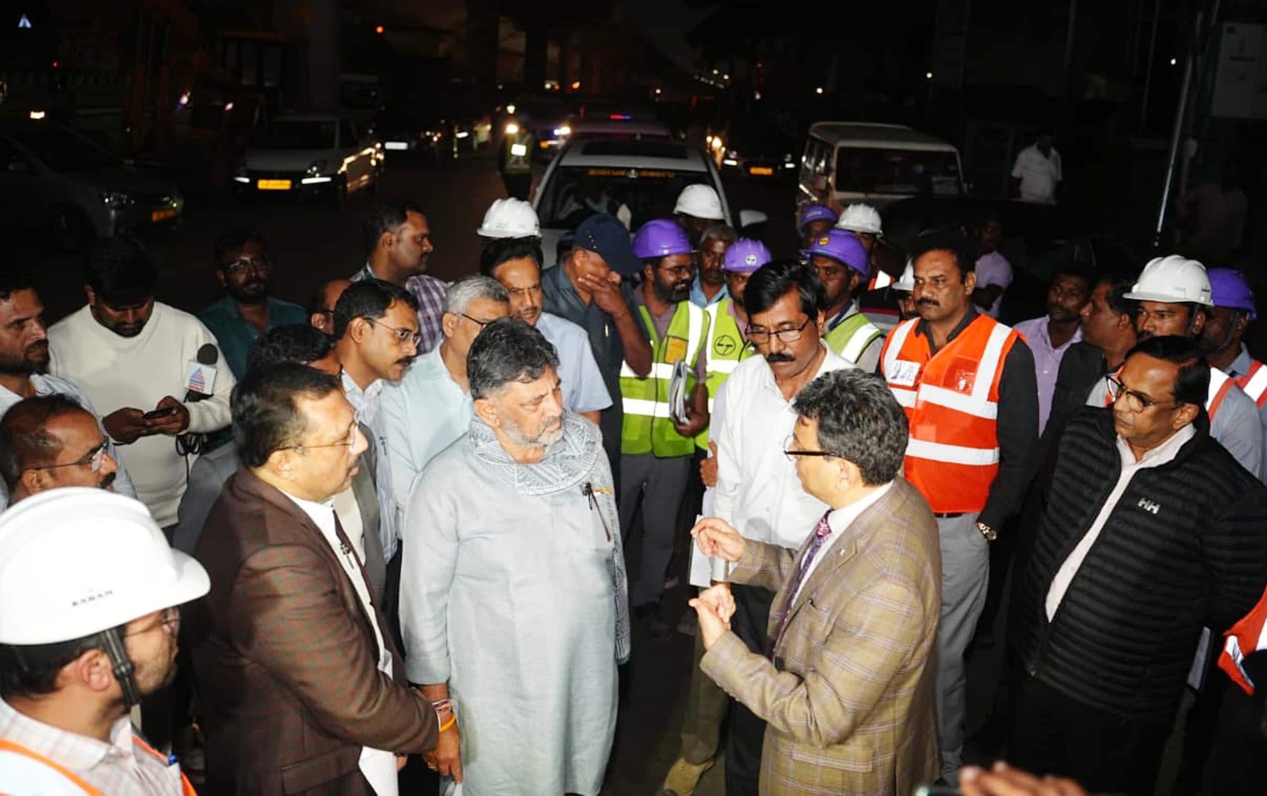 ಕೊಡಿಗೆಹಳ್ಳಿಯಲ್ಲಿ ನಡೆಯುತ್ತಿರುವ ನಮ್ಮ ಮೆಟ್ರೋ ಕಾಮಗಾರಿ ಪ್ರಗತಿ ಪರಿಶೀಲನೆ ವೇಳೆ ಡಿಸಿಎಂ ಡಿ.ಕೆ.ಶಿವಕುಮಾರ್ ಅಧಿಕಾರಿಗಳೊಂದಿಗೆ ಮಾತನಾಡಿದರು.
