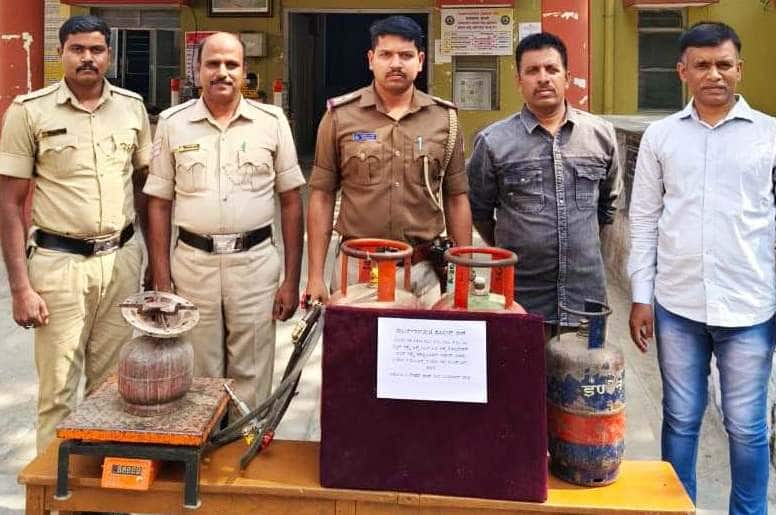 ವಶÀಪಡಿಸಿಕೊಂಡ ಸಿಲೆಂಡರ್ನೊಮದಿಗೆ ರಾಬರ್ಟ್ಸನ್ಪೇಟೆ ಪೊಲೀಸರು.
