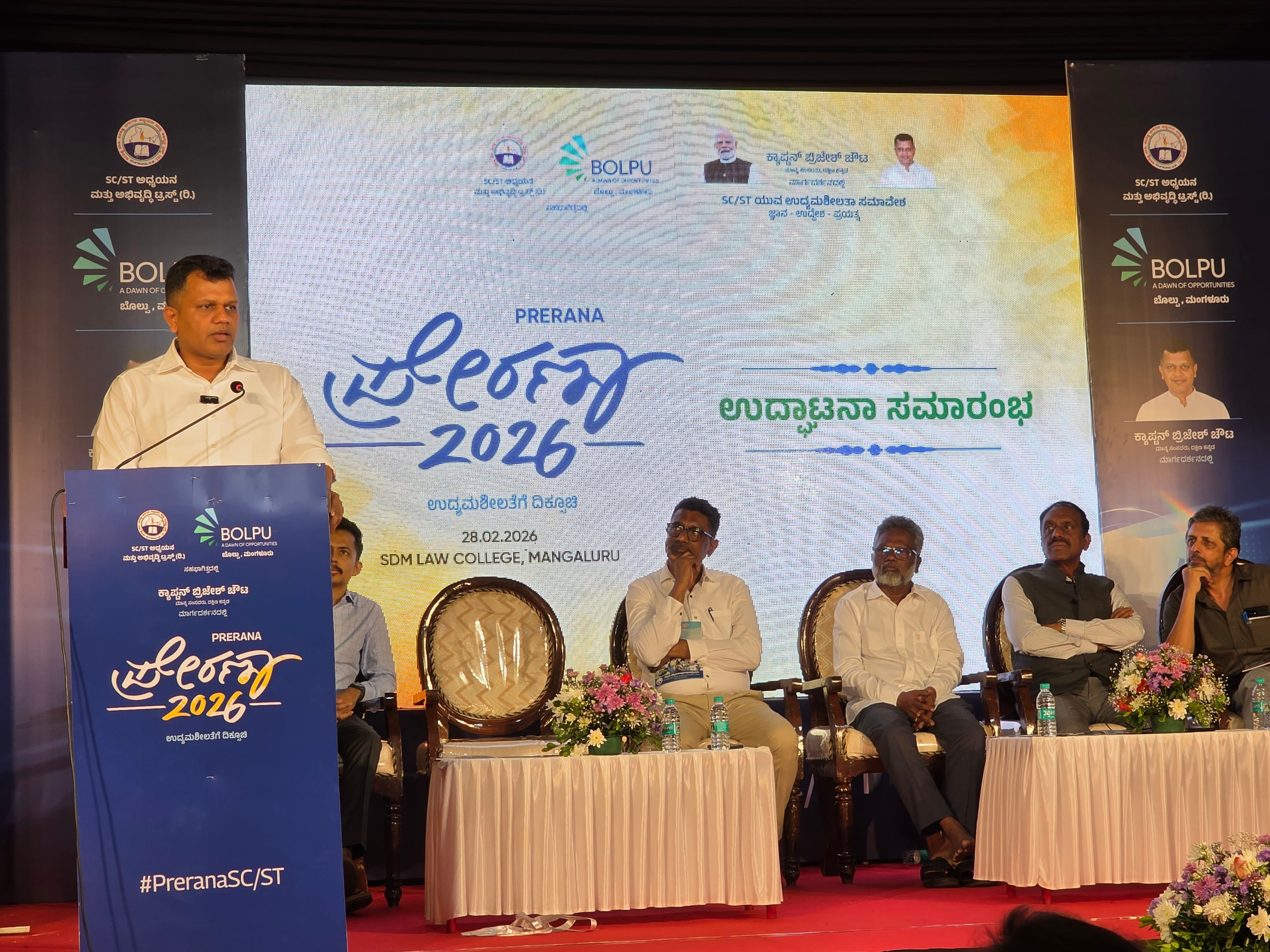 ಮಂಗಳೂರು: ಎಸ್ಸಿ ಎಸ್ಟಿ ಯುವ ಉದ್ದಿಮೆದಾರರಿಗೆ ನೆರವಾಗುವ ದಿಶೆಯಲ್ಲಿ ಕೇಂದ್ರ ಸರ್ಕಾರ ಇನ್ಕ್ಯುಬೇಷನ್ ಸೆಂಟರ್ಗಳನ್ನು ತೆರೆದು ಅಲ್ಲಿ ಯಶಸ್ವಿ ಉದ್ಯಮಿಗಳನ್ನು ರೂಪಿಸುವ ಕೆಲಸವನ್ನು ಮಾಡುತ್ತಿದೆ ಎಂದು ದ.ಕ. ಸಂಸದ ಕ್ಯಾ.ಬ್ರಿಜೇಶ್ ಚೌಟ ಹೇಳಿದ್ದಾರೆ. ಎಸ್ಸಿ ಎಸ್ಟಿ ಅಧ್ಯಯನ ಮತ್ತು ಅಭಿವೃದ್ಧಿ ಟ್ರಸ್ಟ್ ಹಾಗೂ ಬೊಲ್ಪು ಮಂಗಳೂರು ಸಹಭಾಗಿತ್ವದಲ್ಲಿ ಶನಿವಾರ ಇಲ್ಲಿನ ಎಸ್ಡಿಎಂ ಕಾನೂನು ವಿದ್ಯಾಲಯದಲ್ಲಿ ನಡೆದ ‘ಪ್ರೇರಣಾ-2026’ ಎಸ್ಸಿ-ಎಸ್ಟಿ(ಪರಿಶಿಷ್ಟ ಜಾತಿ- ಪರಿಶಿಷ್ಟ ಪಂಗಡ) ಯುವ ಉದ್ಯಮಶೀಲತಾ ಸಮಾವೇಶದಲ್ಲಿ ಅಧ್ಯಕ್ಷತೆ ವಹಿಸಿ ಅವರು ಮಾತನಾಡಿದರು.