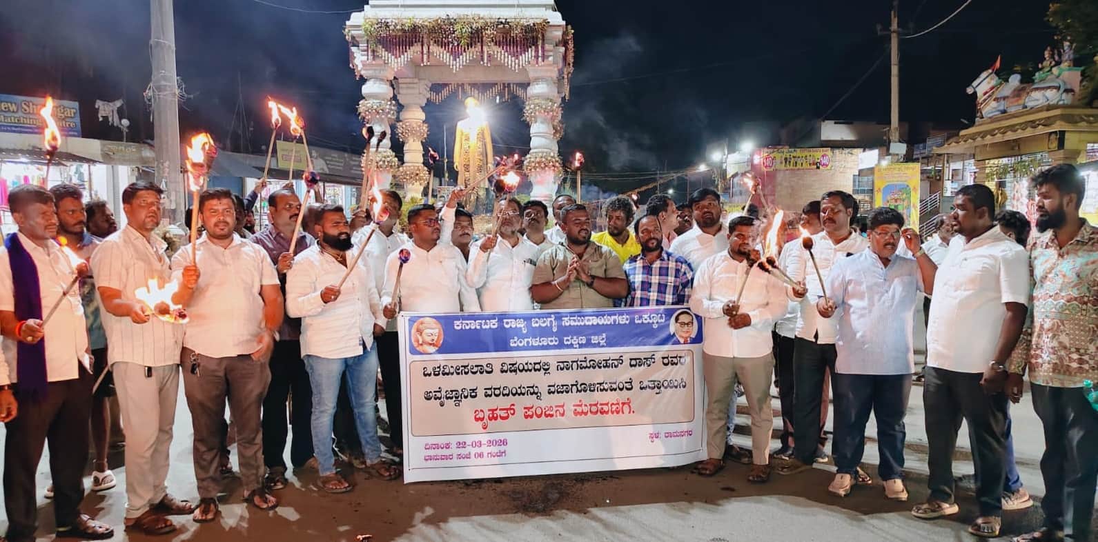 23ಕೆಆರ್ ಎಂಎನ್ 1.ಜೆಪಿಜಿರಾಮನಗರದಲ್ಲಿ ಕರ್ನಾಟಕ ಬಲಗೈ ಸಮುದಾಯಗಳ ಒಕ್ಕೂಟದ ಪದಾಧಿಕಾರಿಗಳು ಪಂಜಿನ ಮೆರವಣಿಗೆ ನಡೆಸಿದರು.