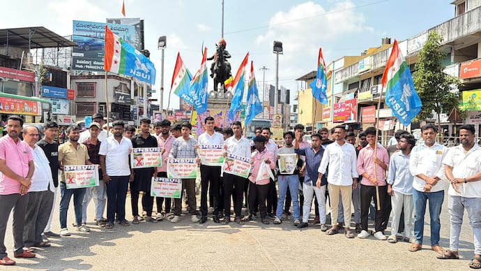 ರಾಷ್ಟ್ರಗೀತೆ ಬ್ರಿಟೀಷರ ಸ್ವಾಗತಕ್ಕೆ ರಚಿಸಿದ್ದ ಗೀತೆ ಎಂದು ಹೇಳಿ ರಾಷ್ಟ್ರಗೀತೆಗೆ ಅಪಮಾನ ಮಾಡಿರುವ ಸಂಸದ ವಿಶ್ವೇಶ್ವರ ಹೆಗಡೆ ಕಾಗೇರಿ ಅವರನ್ನು ಕೂಡಲೇ ಸಂಸದ ಸ್ಥಾನದಿಂದ ವಜಾಗೊಳಿಸಬೇಕೆಂದು ಆಗ್ರಹಿಸಿ ನಗರದ ಶಿವಪ್ಪನಾಯಕ ವೃತ್ತದಲ್ಲಿ ಶುಕ್ರವಾರ ಎನ್ಎಸ್ಯುಐ ವತಿಯಿಂದ ಪ್ರತಿಭಟನೆ ನಡೆಸಲಾಯಿತು.