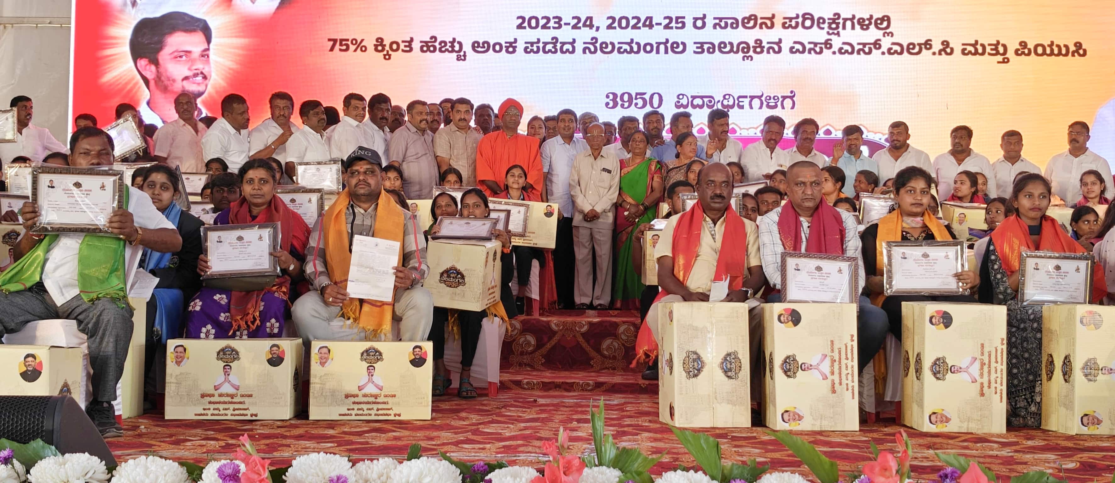 (ಫೋಟೋ ಕ್ಯಾಫ್ಞನ್)ನೆಲಮಂಗಲದ ಡಾ.ಬಿ.ಆರ್.ಆಂಬೇಡ್ಕರ್ ಕ್ರೀಡಾಂಗಣದಲ್ಲಿ ಶಾಸಕ ಶ್ರೀನಿವಾಸ್ ನೇತೃತ್ವದ ನೆಲಮಂಗಲ ಉತ್ಸವದ ಪ್ರಯುಕ್ತ 2023-24 ಹಾಗೂ 2024-25ರ ಸಾಲಿನ ಪರೀಕ್ಷೆಯಲ್ಲಿ ಶೇ.75ರಷ್ಟು ಅಂಕ ಪಡೆದ ಎಸ್ಸೆಸ್ಸೆಲ್ಸಿ ಹಾಗೂ ಪಿಯುಸಿ ವಿದ್ಯಾರ್ಥಿಗಳಿಗೆ ಉನ್ನತ ಶಿಕ್ಷಣ ಸಚಿವ ಎಂ.ಸಿ.ಸುಧಾಕರ್, ಬಮೂಲ್ ಅಧ್ಯಕ್ಷ ಡಿ.ಕೆ.ಸುರೇಶ್ ಪ್ರತಿಭಾ ಪುರಸ್ಕಾರ ವಿತರಿಸಿದರು.