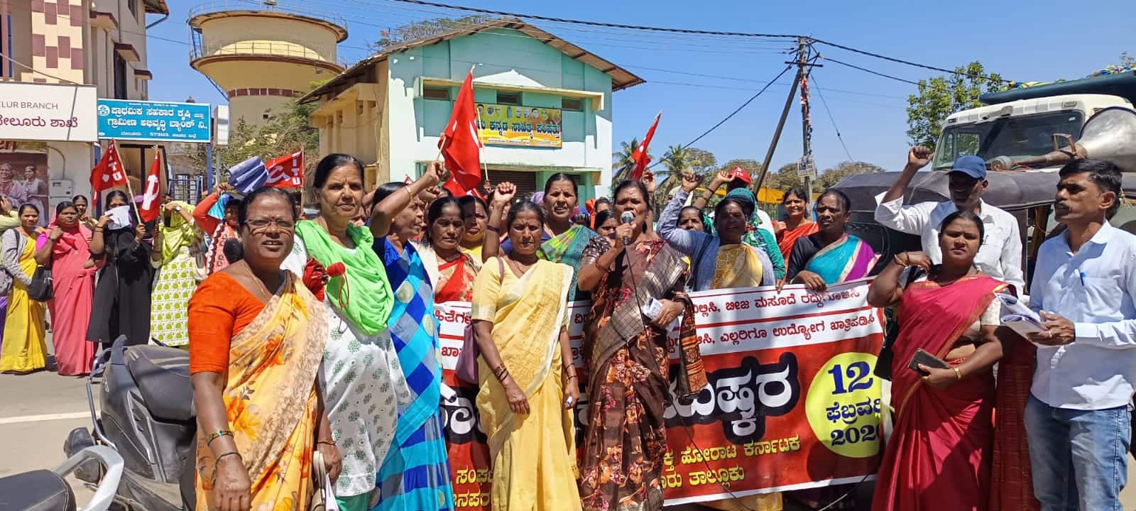 ಕೇಂದ್ರ ಹಾಗೂ ರಾಜ್ಯ ಸರ್ಕಾರ ಜಾರಿಗೆ ತಂದಿರುವ ಕಾರ್ಮಿಕ ವಿರೋಧಿ ನೀತಿಗಳು ಹಾಗೂ ನೂತನ ನಾಲ್ಕು ಕಾರ್ಮಿಕ ಸಂಹಿತೆಗಳನ್ನು ರದ್ದುಪಡಿಸುವಂತೆ ಒತ್ತಾಯಿಸಿ, ಅಖಿಲ ಭಾರತ ಸಾರ್ವತ್ರಿಕ ಮುಷ್ಕರದ ಅಂಗವಾಗಿ ಪಟ್ಟಣದಲ್ಲಿ ವಿವಿಧ ಸಂಘಟನೆಗಳ ನೇತೃತ್ವದಲ್ಲಿ ಬೃಹತ್ ಪ್ರತಿಭಟನೆ ನಡೆಸಲಾಯಿತು.ಪಟ್ಟಣದ ಬಸವೇಶ್ವರ ವೃತ್ತದಿಂದ ಮೆರವಣಿಗೆ ಹೊರಟ ಅಂಗನವಾಡಿ, ಆಶಾ ಕಾರ್ಯಕರ್ತೆಯರು, ಬಿಸಿಯೂಟ ನೌಕರರು ಹಾಗೂ ವಿವಿಧ ದಲಿತ ಮತ್ತು ಕನ್ನಡ ಪರ ಸಂಘಟನೆಗಳ ಕಾರ್ಯಕರ್ತರು ಕೇಂದ್ರ ಸರ್ಕಾರದ ವಿರುದ್ಧ ಘೋಷಣೆ ಕೂಗುತ್ತಾ ಅಂಚೆಕಚೇರಿ ಮುಂಭಾಗ ಜಮಾಯಿಸಿ ಮುತ್ತಿಗೆ ಹಾಕಿದರು. ಪ್ರತಿಭಟನೆಯನ್ನು ಉದ್ದೇಶಿಸಿ ಮಾತನಾಡಿದ ಬಿಸಿಯೂಟ ನೌಕರರ ಸಂಘದ ಅಧ್ಯಕ್ಷೆ ಮಂಜುಳಾ, ಕೇಂದ್ರ ಸರ್ಕಾರವು ಕಾರ್ಮಿಕರ ಹಿತಕಾಪಾಡುವ 29 ಕಾಯ್ದೆಗಳನ್ನು ರದ್ದುಮಾಡಿ, ಮಾಲಿಕರ ಪರವಾದ 4 ಹೊಸ ಸಂಹಿತೆಗಳನ್ನು ಜಾರಿಗೆ ತಂದಿದೆ. ಇದನ್ನು ರಾಜ್ಯ ಸರ್ಕಾರವೂ ಬೆಂಬಲಿಸಿರುವುದು ಖಂಡನೀಯ. ಇದರಿಂದ ಕಾರ್ಖಾನೆಗಳು, ಸ್ಕೀಮ್ ನೌಕರರು, ಮತ್ತು ಗ್ರಾಮ ಪಂಚಾಯಿತಿ ನೌಕರರಿಗೆ ತೀವ್ರ ತೊಂದರೆಯಾಗಲಿದ್ದು, ಖಾಸಗೀಕರಣಕ್ಕೆ ಹಾದಿ ಮಾಡಿಕೊಟ್ಟಂತಾಗಿದೆ ಎಂದು ಆಕ್ರೋಶ ವ್ಯಕ್ತಪಡಿಸಿದರು.ಅಂಗನವಾಡಿ ಮತ್ತು ಬಿಸಿಯೂಟ ನೌಕರರನ್ನು ಸರ್ಕಾರಗಳು ಬೀದಿಗೆ ತಳ್ಳುತ್ತಿವೆ. ಕೇಂದ್ರ ಸರ್ಕಾರ ಅಂಗನವಾಡಿ ನೌಕರರಿಗೆ ಕೇವಲ 2000-4000 ರು. ಹಾಗೂ ಬಿಸಿಯೂಟ ನೌಕರರಿಗೆ ಅತ್ಯಲ್ಪ ಗೌರವಧನ ನೀಡುವ ಮೂಲಕ ಶೋಷಣೆ ಮಾಡುತ್ತಿದೆ. ಕಾರ್ಮಿಕ ವಿರೋಧಿ ಕೋಡ್ಗಳನ್ನು ವಾಪಸ್ ಪಡೆಯುವವರೆಗೂ ನಮ್ಮ ಹೋರಾಟ ನಿಲ್ಲುವುದಿಲ್ಲ ಎಂದು ಎಚ್ಚರಿಸಿದರು.ಅಂಗನವಾಡಿ ನೌಕರರ ಸಂಘದ ಅಧ್ಯಕ್ಷೆ ಕಾಮಾಕ್ಷಿ ರಾಜ್ ಮಾತನಾಡಿ, ಕೇಂದ್ರ ಹಾಗೂ ರಾಜ್ಯ ಸರ್ಕಾರಗಳ ವಿರುದ್ಧ ಹರಿಹಾಯ್ದರು. ಕೇಂದ್ರ ಸರ್ಕಾರವು ಕಾರ್ಮಿಕರ ಪರವಿದ್ದ 29 ಕಾನೂನುಗಳನ್ನು ತಿದ್ದುಪಡಿ ಮಾಡಿ, 4 ಹೊಸ ಸಂಹಿತೆಗಳನ್ನು ಜಾರಿಗೆ ತಂದಿದೆ. ಹಿಂದೆ ನಾವು ಹೋರಾಟ ಮಾಡಿದಾಗ ಈ ಪ್ರಕ್ರಿಯೆಯನ್ನು ತಡೆಹಿಡಿಯಲಾಗಿತ್ತು. ಆದರೆ, ಈಗ ಕೇಂದ್ರ ಸರ್ಕಾರ ಏಕಾಏಕಿ ಸಂಹಿತೆಗಳನ್ನು ಜಾರಿಗೆ ತರುತ್ತಿದ್ದು, ರಾಜ್ಯ ಸರ್ಕಾರವೂ ಅದನ್ನು ಅನುಸರಿಸುತ್ತಿದೆ ಎಂದು ಆರೋಪಿಸಿದರು. ದೇಶಾದ್ಯಂತ ಎಲ್ಲಾ ಕಾರ್ಮಿಕ ಸಂಘಟನೆಗಳು ಒಗ್ಗೂಡಿ ಈ ಹೋರಾಟ ಮಾಡುತ್ತಿವೆ. ಸರ್ಕಾರ ಕೂಡಲೇ ಈ ಕಾರ್ಮಿಕ ವಿರೋಧಿ ನೀತಿಗಳನ್ನು ವಾಪಸ್ ಪಡೆಯಬೇಕು. ಇಲ್ಲದಿದ್ದರೆ ಮುಂದಿನ ದಿನಗಳಲ್ಲಿ ಉಗ್ರ ಹೋರಾಟ ನಡೆಸಲು ಕಾರ್ಮಿಕರು ಸಜ್ಜಾಗಿದ್ದೇವೆ ಎಂದು ಸರ್ಕಾರಕ್ಕೆ ಎಚ್ಚರಿಕೆ ನೀಡಿದರು. ಪ್ರತಿಭಟನೆಯಲ್ಲಿ 12 ಕ್ಕೂ ಹೆಚ್ಚು ಸಂಘಟನೆಗಳು ಭಾಗವಹಿಸಿದ್ದು ಬೇಲೂರು ಮಹಿಳಾ ಒಕ್ಕೂಟದ ಅಧ್ಯಕ್ಷ ಭಾರತೀಗೌಡ, ಗ್ರಾಮ ಪಂಚಾಯತಿ ನೌಕರರ ಸಂಘದ ಅಧ್ಯಕ್ಷ ಈರಯ್ಯ, ಸಿಐಟಿಯುನ ಇಂದ್ರಮ್ಮ, ಬಿಸಿಊಟ ಉಪಾಧ್ಯಕ್ಷೆ ಮಹಾದೇವಿ, ಗ್ರಾಮ ಪಂಚಾಯಿತಿ ನೌಕರರ ಸಂಘದ ಪ್ರಧಾನ ಕಾರ್ಯದರ್ಶಿ ಗಣೇಶ್, ವೇದಾವತಿ, ಇತರರು ಇದ್ದರು.ಖಾಸಗೀಕರಣಕ್ಕೆ ಹಾದಿ ಮಾಡಿಕೊಟ್ಟಂತಾಗಿದೆ