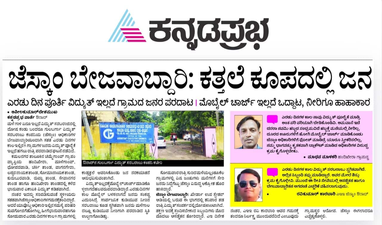 ಕಳೆದ ಎರಡು ವಾರಗಳಿಂದ ಜೆಸ್ಕಾಂ ಅಧಿಕಾರಿಗಳ ಅವಾಂತರ, ನಿರ್ಲಕ್ಷ್ಯ, ಬೇಜವಾಬ್ದಾರಿ ಹಾಗೂ ಕರ್ತವ್ಯ ನಿಯಮಾವಳಿಗಳ ಉಲ್ಲಂಘನೆ ಕುರಿತು ಸಮಗ್ರವಾಗಿ ಸರಣಿ ವರದಿಗಳ ಮೂಲಕ ಜೆಸ್ಕಾಂ ಹಿರಿಯ ಅಧಿಕಾರಿಗಳ ಗಮನ ಸೆಳೆಯಲಾಗಿತ್ತು.ಡೊಂಗರಗಾಂವ್- ವಾಗನಗೇರಾ ಭಾಗದಲ್ಲಿ ವಿದ್ಯುತ್ ದೋಷವಾಗಿ ಮೂರು ದಿನಗಳ ಕಾಲ ಚಿಮ್ಮೆಗಾಂವ್ ಗ್ರಾಪಂ ವ್ಯಾಪ್ತಿಯ 9 ಗ್ರಾಮಗಳು ಕತ್ತಲೆ ಕೂಪದಲ್ಲಿರುವದನ್ನು ವಿವರವಾಗಿ ''''''''ಕನ್ನಡಪ್ರಭ'''''''' ಪ್ರಕಟಿಸಿದ್ದಕ್ಕೆ ತಕ್ಷಣ ಸ್ಥಳಕ್ಕೆ ಭೇಟಿ ನೀಡಿದ ಜೆಸ್ಕಾಂ ಇಇ ರಮೇಶ ಪಾಟೀಲ್ ಅವರು ಪರಿಸ್ಥಿತಿ ಅವಲೋಕನ ನಡೆಸಿ ಅಂದಾಜು ಒಟ್ಟು 7 ಕಿ.ಮೀ. ಉದ್ದದ ನಿರಂತರ ಜ್ಯೋತಿ ಯೋಜನೆಯ ವಿದ್ಯುತ್ ಕಂಬಗಳ ಮೇಲಿನ ಇನ್ಸುಲೇಟರ್ಗಳನ್ನು ಸಮರೋಪಾದಿಯಲ್ಲಿ ಎರಡು ದಿನದಲ್ಲಿಯೇ ಬದಲಾವಣೆ ಮಾಡಿ ಆ ಭಾಗದ ವಿದ್ಯುತ್ ಕಣ್ಣಾ ಮುಚ್ಚಾಲೆಗೆ ಶಾಶ್ವತ ಪರಿಹಾರ ನೀಡಿದ್ದಾರೆ.