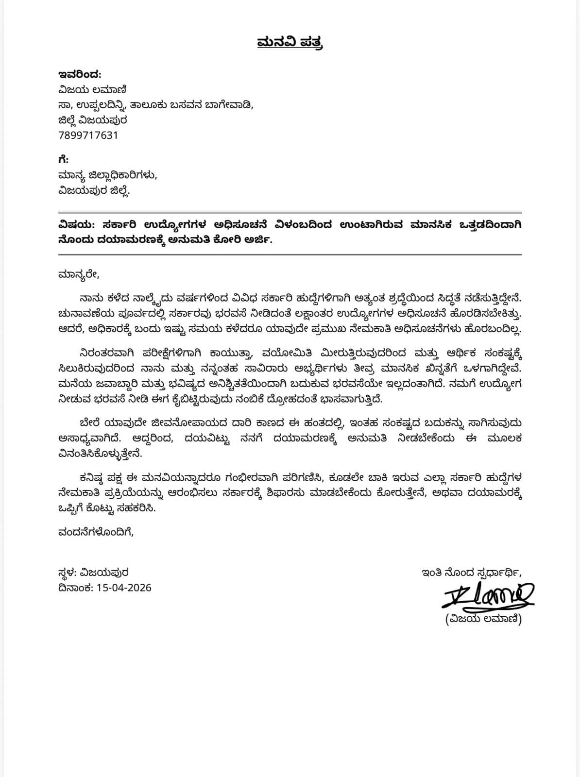 ರಾಜ್ಯದಲ್ಲಿ 2.84 ಲಕ್ಷ ಸರ್ಕಾರಿ ಹುದ್ದೆಗಳು ಖಾಲಿ ಇದ್ದು, ಸರ್ಕಾರ ನೀಡಿದ ಭರವಸೆಯಂತೆ ಇಲ್ಲಿಯವರೆಗೆ ಲಕ್ಷಾಂತರ ಉದ್ಯೋಗಗಳ ಭರ್ತಿಗೆ ಅಧಿಸೂಚನೆ ಹೊರಡಿಸಬೇಕಿತ್ತು. ನಮ್ಮಂತಹ ಲಕ್ಷಾಂತರ ಯುವಕರ ವಯೋಮಿತಿ ಮೀರುತ್ತಿದೆ. ಈಗ ಮನೆ ಜವಾಬ್ದಾರಿ ಮತ್ತು ಭವಿಷ್ಯದ ಅನಿಶ್ಚಿತತೆಯಿಂದ ಬದುಕುವ ಭರವಸೆಯೇ ಕಳೆದುಹೋಗುತ್ತಿದೆ. ಜೀವನೋಪಾಯದ ದಾರಿ ಕಾಣದ ನನಗೆ ಬದುಕು ಸಾಗಿಸುವುದು ಅಸಾಧ್ಯವಾಗಿದ್ದು, ದಯವಿಟ್ಟು ದಯಾಮರಣಕ್ಕೆ ಅನುಮತಿ ನೀಡಬೇಕು ಎಂದು ವಿಜಯಪುರ ಜಿಲ್ಲೆ ಬಸವನಬಾಗೇವಾಡಿ ತಾಲೂಕಿನ ಉಪ್ಪಲದಿನ್ನ ಗ್ರಾಮದ ವಿಜಯ ಲಮಾಣಿ ಜಿಲ್ಲಾಧಿಕಾರಿಗೆ ಪತ್ರ ಬರೆದಿದ್ದಾರೆ.ಬಿಕಾಂ ಪದವೀಧರರಾಗಿರುವ ವಿಜಯ ಲಮಾಣಿ 2020ರಲ್ಲಿಯೇ ಪದವಿ ಮುಗಿಸಿದರು. 2021ರಲ್ಲಿ ಭಾರತೀಯ ಸೇನೆಗೆ ನೇಮಕಗೊಂಡಿದ್ದರು. ಆದರೆ ಅಗ್ನಿವೀರ ಯೋಜನೆ ಜಾರಿ ಹಿನ್ನೆಲೆಯಲ್ಲಿ ಆ ಅಧಿಸೂಚನೆಯೇ ರದ್ದುಗೊಂಡಿತು. ಆನಂತರದಲ್ಲಿ ಪಿಎಸ್ಐ, ಪೊಲೀಸ್ ಪೇದೆ ಹುದ್ದೆಗೆ ಯತ್ನಿಸಿ 2 ಅಂಕಗಳಲ್ಲಿ ಅನುತ್ತೀರ್ಣಗೊಂಡಿದ್ದರು. ಆನಂತರ ಅವರಿವರ ಬಳಿ ಸಾಲ ಪಡೆದು ಓದು ಮುಂದುವರಿಸಿದ ಅವರು ನೌಕರಿ ಸಿಗುವ ವಿಶ್ವಾಸದಲ್ಲಿದ್ದಾರೆ. ಆದರೆ, ಹುದ್ದೆ ಭರ್ತಿ ಆಗದ್ದರಿಂದ ನಿರಾಸೆಗೊಂಡಿದ್ದಾರೆ. ಅವರಿಗೆ ತಂದೆ ಇಲ್ಲ. ಸಹೋದರ ನಾನಪ್ಪ ಅವರಿಗೆ ಎರಡೂ ಕಾಲಿಲ್ಲ. ಇನ್ನೊಬ್ಬ ಸಹೋದರ ಕೃಷಿಕಾರ್ಮಿಕ. ಈಗಲೂ ಅವರ ದುಡಿಮೆಯಲ್ಲಿಯೇ ಬದುಕುತ್ತಿರುವ ಇವರು ನೇಮಕಾತಿ ವಿಳಂಬದಿಂದ ಕುಗ್ಗಿ ಹೋಗಿದ್ದಾರೆ.