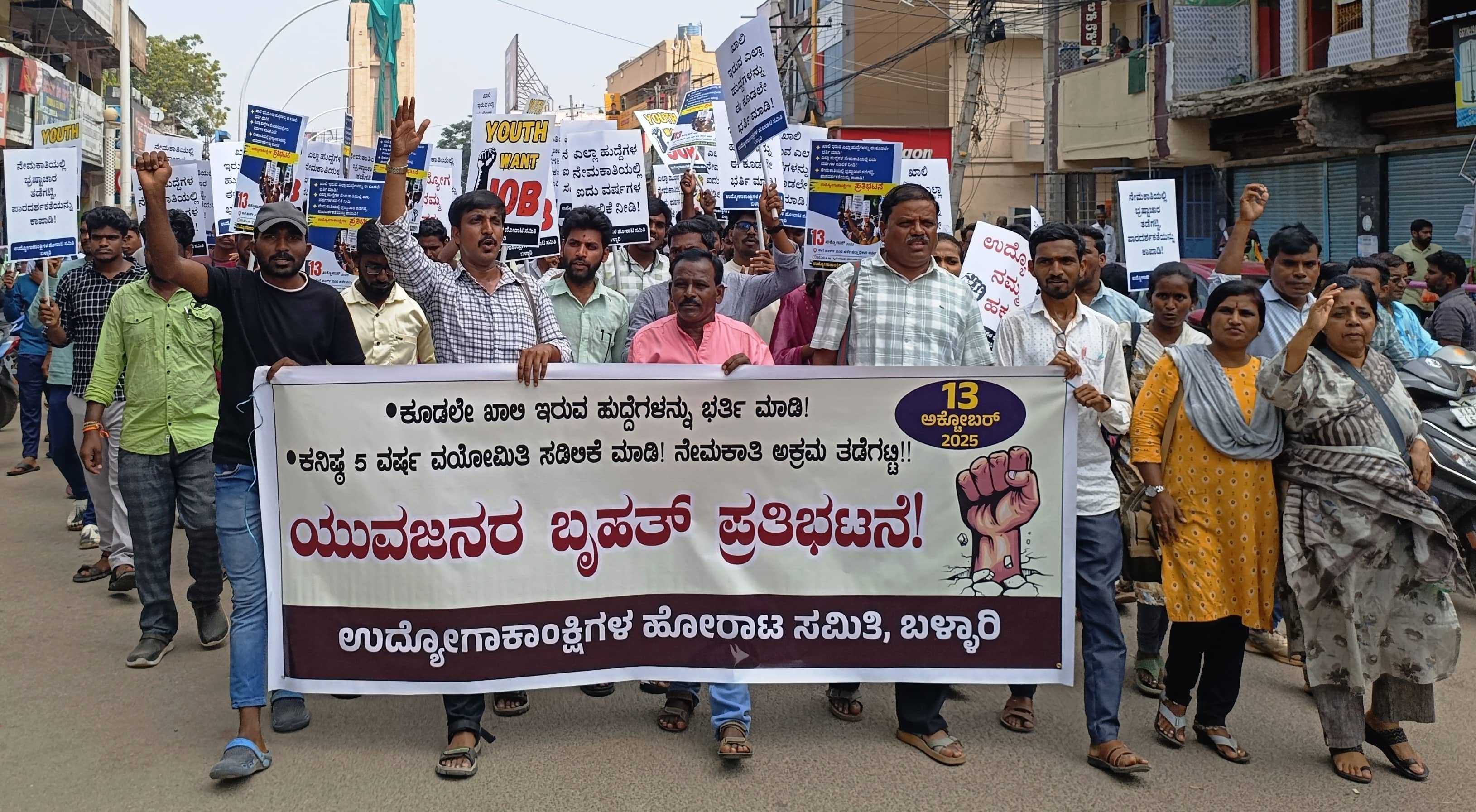 ಬಳ್ಳಾರಿ: ರಾಜ್ಯದಲ್ಲಿ ಖಾಲಿ ಇರುವ 2.84 ಲಕ್ಷಕ್ಕೂ ಹೆಚ್ಚು ಹುದ್ದೆಗಳನ್ನು ಭರ್ತಿ ಮಾಡಬೇಕು ಎಂದು ಒತ್ತಾಯಿಸಿ ಉದ್ಯೋಗಾಕಾಂಕ್ಷಿಗಳ ಹೋರಾಟ ಸಮಿತಿಯಿಂದ ನಗರದಲ್ಲಿ ಸೋಮವಾರ ನೂರಾರು ಯುವಕರು ಪ್ರತಿಭಟನಾ ಮೆರವಣಿಗೆ ನಡೆಸಿ, ರಾಜ್ಯ ಸರ್ಕಾರದ ವಿರುದ್ಧ ಆಕ್ರೋಶ ವ್ಯಕ್ತಪಡಿಸಿದರು.