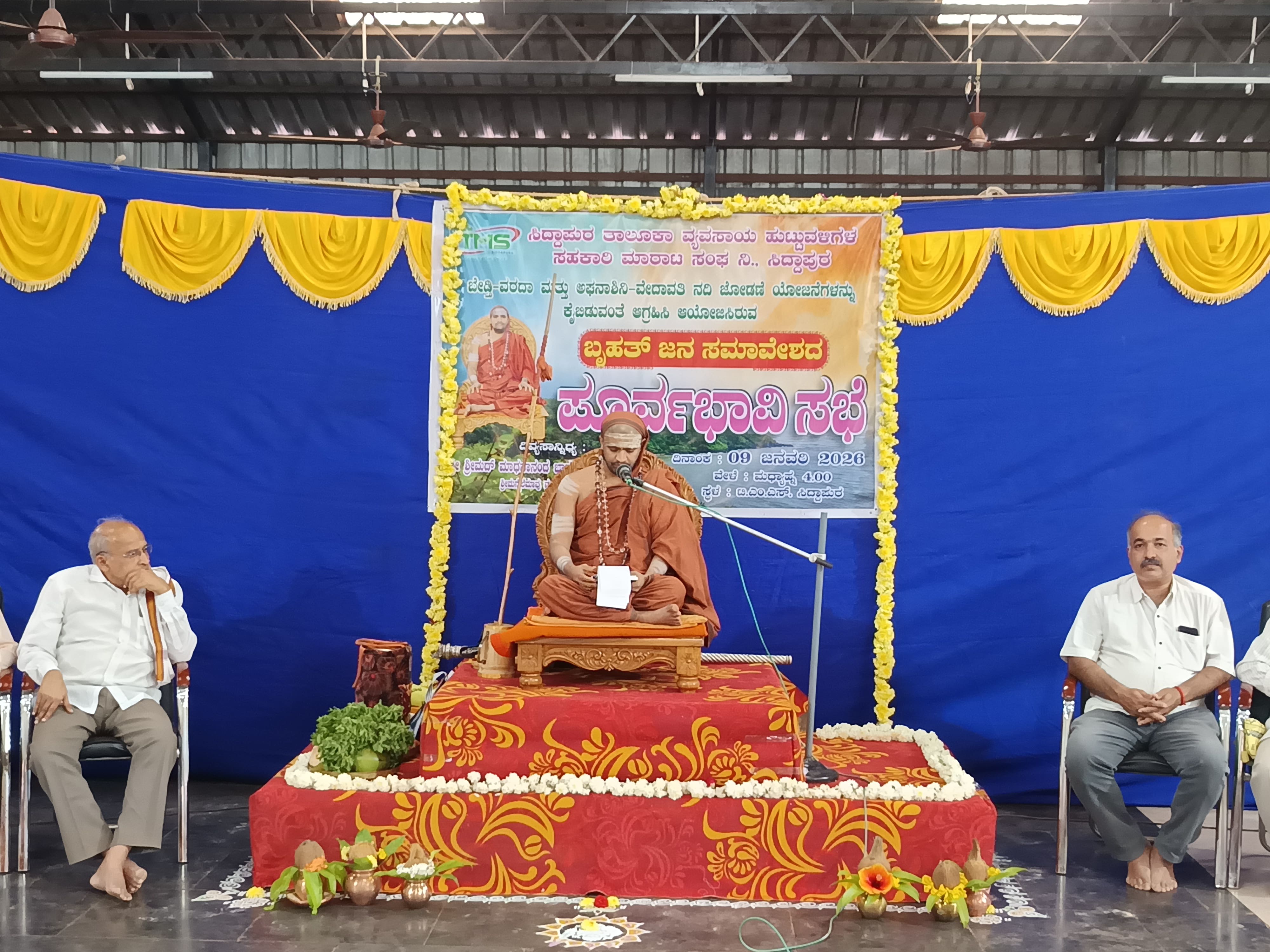 ಸಿದ್ದಾಪುರ ಪಟ್ಟಣದ ತಾಲೂಕು ಮಾರ್ಕೆಟಿಂಗ್ ಸೊಸೈಟಿ ಸಭಾಂಗಣದಲ್ಲಿ ಆಯೋಜಿಸಿದ್ದ ಬೇಡ್ತಿ, ವರದಾ, ಅಘನಾಶಿನಿ ಮತ್ತು ವೇದಾವತಿ ನದಿ ಜೋಡಣೆ ಕೈ ಬಿಡುವಂತೆ ಆಗ್ರಹಿಸಿ ಜ. ೧೧ರಂದು ಶಿರಸಿಯಲ್ಲಿ ಆಯೋಜಿಸಿರುವ ಬೃಹತ್ ಜನ ಸಮಾವೇಶದ ನದಿ ಜೋಡಣೆ ವಿರೋಧಿ ಹೋರಾಟದ ಪೂರ್ವಸಿದ್ಧತಾ ಸಭೆಯಲ್ಲಿ ನೆಲೆಮಾವು ಮಠದ ಶ್ರೀ ಮಾಧವಾನಂದ ಭಾರತೀ ಸ್ವಾಮಿಗಳು ಪಾಲ್ಗೊಂಡಿದ್ದರು.