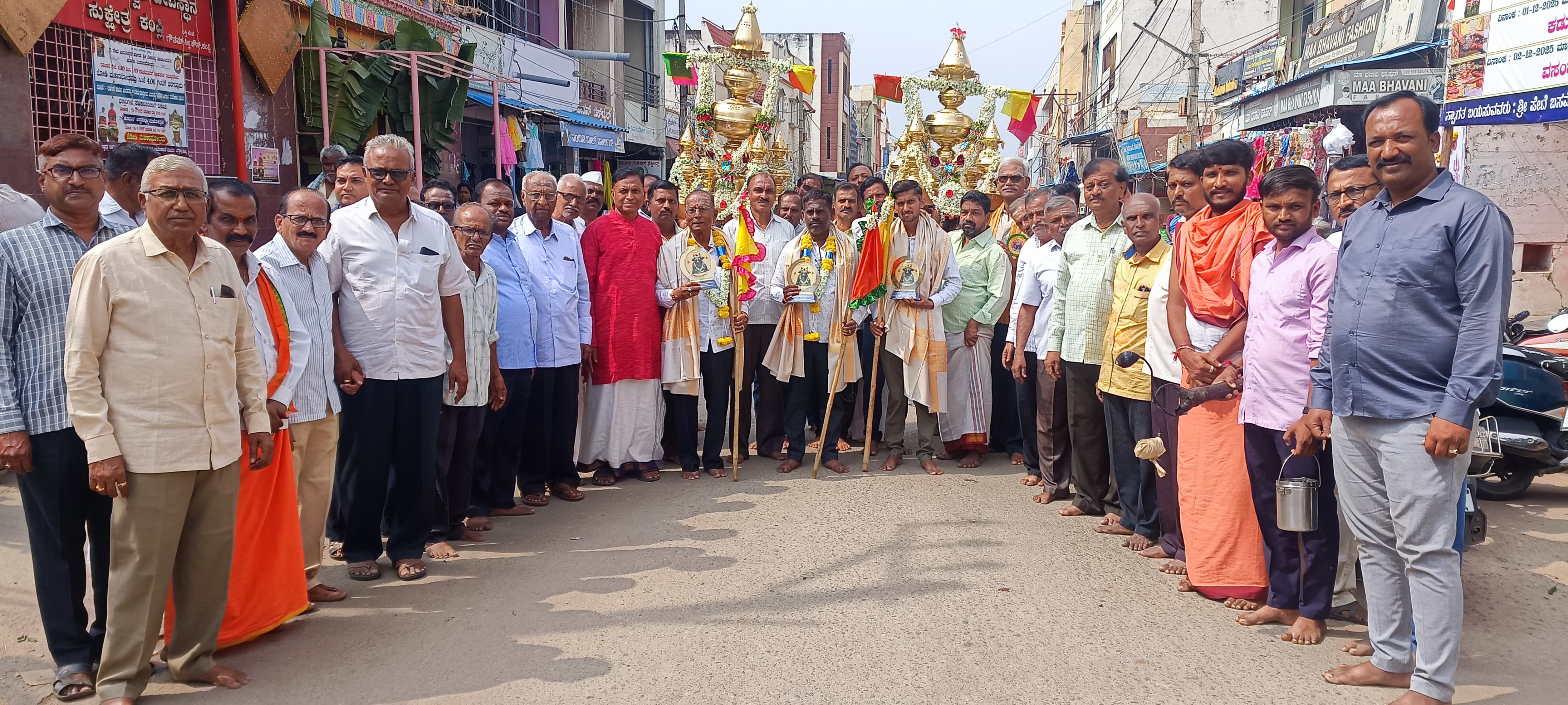 ಧಾರ್ಮಿಕ ಮಂತ್ರೋಚ್ಚಾರಣೆಯ ನಡುವೆ ಕಳಸಗಳಿಗೆ ಪೂಜೆ ಸಲ್ಲಿಸಿ, ಮೆರವಣಿಗೆಯಿಂದ ರಥಗಳ ಬಳಿಗೆ ಸಾಗಿಸಲಾಯಿತು.