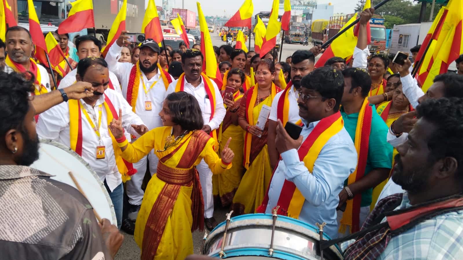 ಜಾಗೃತಿ ವೇದಿಕೆ ಹಮ್ಮಿಕೊಂಡಿದ್ದ ಅತ್ತಿಬೆಲೆ ಗಡಿಗೆ ಕಾಲ್ನಡಿಗೆ ಜಾಥಾದಲ್ಲಿ ತಮಟೆ ಸದ್ದಿಗೆ ಕನ್ನಡ ಪರ ಕಾರ್ಯಕರ್ತರು ಹೆಜ್ಜೆ ಹಾಕಿ ಕುಣಿದು ನಲಿದು ಸಂಭ್ರಮಿಸಿದರು. ಶಾಸಕ ಬಿ. ಶಿವಣ್ಣ, ಮಂಜುನಾಥ್ ದೇವಾ, ಪಟಾಪಟ್ ಪ್ರಕಾಶ್ ಮತ್ತಿತರರು ಇದ್ದಾರೆ.