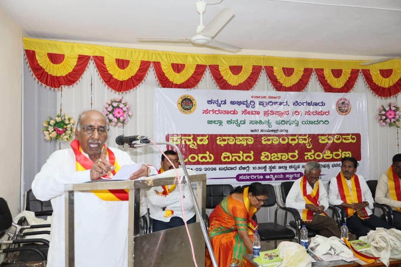 5ವೈಡಿಆರ್1 : ಯಾದಗಿರಿ ಜಿಲ್ಲಾ ಕಸಾಪ ಸಭಾಂಗಣದಲ್ಲಿ ಕನ್ನಡ ಭಾಷಾ ಬಾಂಧವ್ಯ ಕುರಿತು ಒಂದು ದಿನದ ವಿಚಾರ ಸಂಕಿರಣ ಕಾರ್ಯಕ್ರಮವನ್ನು ಹಿರಿಯ ಸಾಹಿತಿ ಶಾಂತಪ್ಪ ಬೂದಿಹಾಳ ಸುರಪುರ ಉದ್ಘಾಟಿಸಿ, ಮಾತನಾಡಿದರು.-