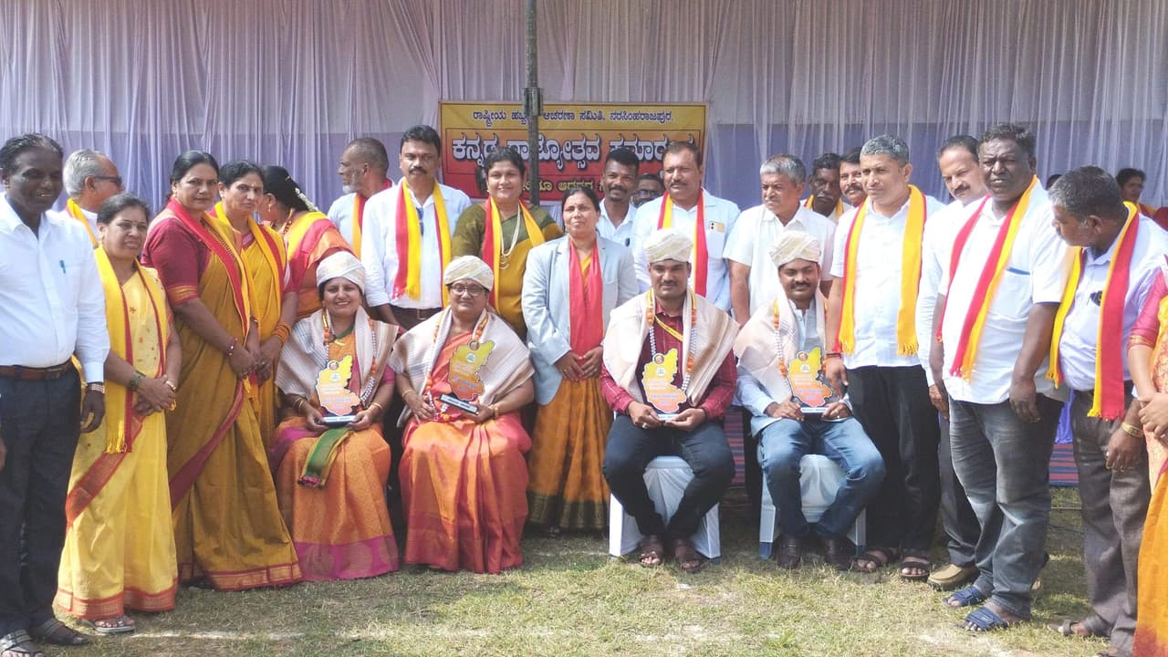 ವಿವಿಧ ಶಾಲೆಯ ಶಿಕ್ಷಕರಾದ ಶ್ರೀಕಾಂತ್, ರಮೇಶನಾಯ್ಕ, ವೀಣಾ ಹಾಗೂ ರಾಜೇಶ್ವರಿ ಅವರನ್ನು ಸನ್ಮಾನಿಸಲಾಯಿತು. ಇದಕ್ಕೂ ಮೊದಲು ಪಟ್ಟಣದ ಅಂಬೇಡ್ಕರ್ ವೃತ್ತದಿಂದ ಕುವೆಂಪು ಕ್ರೀಡಾಂಗಣದವರೆಗೆ ಭುವನೇಶ್ವರಿ ಸ್ತಬ್ದ ಚಿತ್ರ, 100 ಮೀಟರ್ ಕನ್ನಡದ ಭಾವುಟದೊಂದಿಗೆ ಮೆರವಣಿಗೆ ನಡೆಯಿತು. ಕುವೆಂಪು ಕ್ರೀಡಾಂಗಣದಲ್ಲಿ ಪೊಲೀಸ್, ಹೋಂ ಗಾರ್ಡ್ಸಗಳಿಂದ ಹಾಗೂ ವಿವಿಧ ಶಾಲೆಯ ಮಕ್ಕಳಿಂದ ಆಕರ್ಷಕ ಪಥ ಸಂಚಲನ ನಡೆಯಿತು.ಪಪಂ ಅಧ್ಯಕ್ಷೆ ಸುರೈಯಾಭಾನು, ಮುಖ್ಯ ಅತಿಥಿಗಳಾಗಿ ಕಸಾಪ ಮಹಿಳಾ ಘಟಕದ ಅಧ್ಯಕ್ಷೆ ಭಾಗ್ಯನಂಜುಂಡ ಸ್ವಾಮಿ, ಕರವೇ ಮಹಿಳಾ ಘಟಕದ ಅಧ್ಯಕ್ಷೆ ಪ್ರೇಮಾ ಶ್ರೀನಿವಾಸ್, ಪಪಂ ಸದಸ್ಯರಾದ ಜುಬೇದ, ಮುನಾವರ್ ಪಾಷಾ, ಮುಕಂದ, ವಾಸೀಂ, ಪಪಂ ನಾಮಿನಿ ಸದಸ್ಯರು, ಕ್ಷೇತ್ರ ಶಿಕ್ಷಣಾಧಿಕಾರಿ ಕೆ.ಆರ್.ಪುಷ್ಪಾ, ಎಪಿಎಂಸಿ ನಿರ್ದೇಶಕ ಎಚ್.ಎಂ.ಶಿವಣ್ಣ, ತಾ.ಬಗರ್ ಹುಕಂ ಸಮಿತಿ ಅಧ್ಯಕ್ಷ ಇ.ಸಿ,ಜೋಯಿ, ಡಿಎಸ್ಎಸ್ ಮುಖಂಡರಾದ ವಾಲ್ಮೀಕಿ ಶ್ರೀನಿವಾಸ್, ಡಿ.ರಾಮು, ಭವಾನಿ, ಶೆಟ್ಟಿಕೊಪ್ಪ ಮಹೇಶ್, ಭದ್ರಾ ಸಹಕಾರ ಸಂಘದ ಉಪಾಧ್ಯಕ್ಷ ಬಿಳಾಲುಮನೆ ಉಪೇಂದ್ರ ಮತ್ತಿತರರು ಇದ್ದರು.