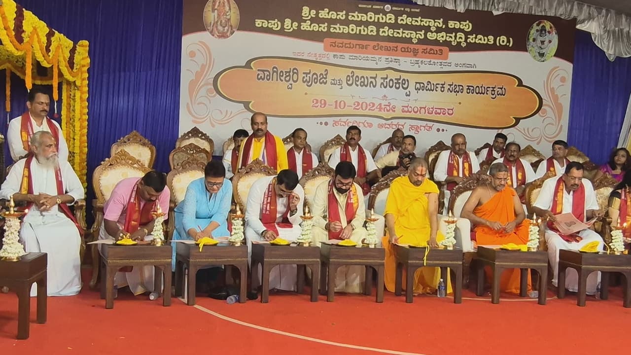ಕಾಪು ಶಾಸಕ ಸುರೇಶ್ ಶೆಟ್ಟಿ ಅಧ್ಯಕ್ಷತೆ ವಹಿಸಿದ್ದರು. ಕಾಪು ಹೊಸ ಮಾರಿಗುಡಿ ಅಭಿವೃದ್ಧಿ ಸಮಿತಿ ಅಧ್ಯಕ್ಷ ಕೆ. ವಾಸುದೇವ ಶೆಟ್ಟಿ, ಉಪಾಧ್ಯಕ್ಷ ಮನೋಹರ್ ಶೆಟ್ಟಿ, ನವದುರ್ಗಾ ಲೇಖನ ಯಜ್ಞ ಸಮಿತಿ ಅಧ್ಯಕ್ಷ ರಘುಪತಿ ಭಟ್, ಕಾರ್ಯಾಧ್ಯಕ್ಷ ಕೃಷ್ಣಪ್ರಸಾದ್ ಅಡ್ಯಂತಾಯ, ಪ್ರಮುಖರಾದ ಉದಯ್ ಕುಮಾರ್ ಶೆಟ್ಟಿ ಮುನಿಯಾಲು, ಉಪಾಧ್ಯಕ್ಷರಾದ ಹರಿಯಪ್ಪ ಕೋಟ್ಯಾನ್, ಡಾ. ವಿದ್ಯಾ ಶಂಕರ್ ಶೆಟ್ಟಿ, ಅಶೋಕ್ ಶೆಟ್ಟಿ, ಪ್ರಧಾನ ಕಾರ್ಯದರ್ಶಿ ಯೋಗೀಶ್ ಶೆಟ್ಟಿ ಬಾಲಾಜಿ, ಕೋಶಾಧಿಕಾರಿ ಕೆ.ವಿಶ್ವನಾಥ್, ಹುಬ್ಬಳ್ಳಿ- ಧಾರವಾಡ ಸಮಿತಿ ಕಾರ್ಯಾಧ್ಯಕ್ಷ ಸುಗ್ಗಿ ಸುಧಾಕರ್ ಶೆಟ್ಟಿ, ಲೇಖನ ಯಜ್ಞ ಸಮಿತಿ ಮಂಗಳೂರು ಸಮಿತಿ ಅಧ್ಯಕ್ಷ ಚಂದ್ರಹಾಸ್ ಶೆಟ್ಟಿ, ಸಂಘಟನಾ ಕಾರ್ಯದರ್ಶಿ ಸಂದೀಪ್ ಮಂಜ, ಸಂಚಾಲಕರಾದ ಸುವರ್ಧನ್ ನಾಯಕ್, ವಿವಿಧ ಕ್ಷೇತ್ರದ ಗಣ್ಯರು ಹಾಗೂ ಸಮಿತಿ ಸದ್ಯಸರು ಉಪಸ್ಥಿತರಿದ್ದರು.