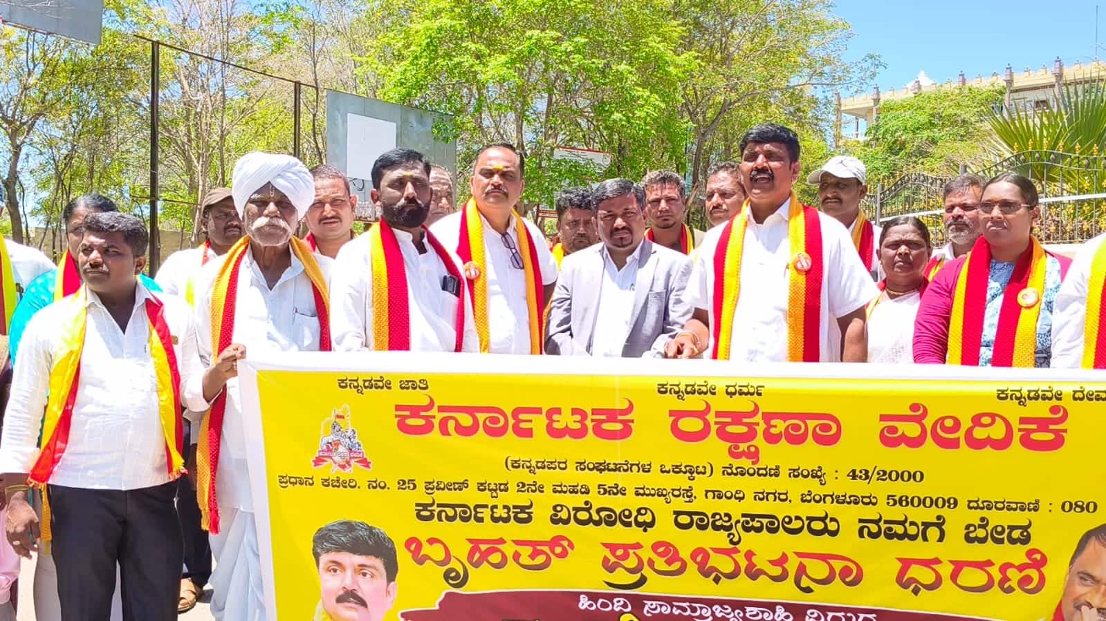 ಹಿಂದಿ ಸಾಮ್ರಾಜ್ಯಶಾಹಿಗಳ ಪರವಾಗಿ ವರ್ತಿಸುತ್ತಾ, ಕರ್ನಾಟಕ ವಿರೋಧಿ ಧೋರಣೆ ತಳೆದಿರುವ ರಾಜ್ಯಪಾಲ ಥಾವರ್ಚಂದ್ ಗೆಹಲೋತ್ ಅವರನ್ನು ಕೇಂದ್ರ ಸರ್ಕಾರ ಕೂಡಲೇ ಹಿಂದಕ್ಕೆ ಕರೆಸಿಕೊಳ್ಳಬೇಕೆಂದು ಒತ್ತಾಯಿಸಿ ಕರ್ನಾಟಕ ರಕ್ಷಣಾ ವೇದಿಕೆ (ನಾರಾಯಣಗೌಡ್ರ ಬಣ) ಜಿಲ್ಲಾ ಘಟಕದ ಮುಖಂಡರು ಮಂಗಳವಾರ ಪ್ರತಿಭಟನೆ ನಡೆಸಿದರು.