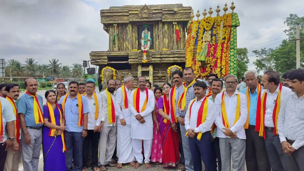 ಜಾನಪದ ತಂಡಗಳ ಆಕರ್ಷಕ ಮೆರವಣಿಗೆಯೊಂದಿಗೆ ತಾಲೂಕಿನ ಸೋಮನಹಳ್ಳಿ, ಮದ್ದೂರು ಪಟ್ಟಣ್ಣಕ್ಕೆ ಆಗಮಿಸಿದ ರಥಯಾತ್ರೆ ವೇಳೆ ವಿವಿಧ ಕನ್ನಡಪರ ಸಂಘಟನೆಗಳ ಪದಾಧಿಕಾರಿಗಳು ಹಾಗೂ ಸಾರ್ವಜನಿಕರು ಕೆಂಪು ಹಳದಿ ಸಾಲು ಧರಿಸಿಕೊಂಡು ಕೈಯಲ್ಲಿ ನಾಡಧ್ವಜ ಹಿಡಿದು ರಥದ ಹೆಜ್ಜೆ ಹಾಕಿದರು.