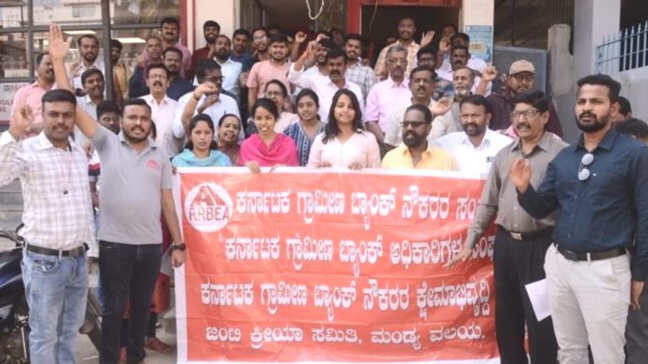 ಬಡ್ತಿ ನಿಯಮಾವಳಿಗಳನ್ನು ಶೀಘ್ರವೇ ಪುನರ್ ವಿಮರ್ಶಿಸಬೇಕು. ಪ್ರೇರಕ ಬ್ಯಾಂಕುಗಳಲ್ಲಿನ ಸಿಬ್ಬಂದಿ ಸೇವಾ ನಿಯಮಗಳು, ಬಡ್ತಿ ಪ್ರಕ್ರಿಯೆ ನಿಯಮಗಳು, ಪಿಂಚಣಿ ನಿಯಮಗಳು, ಅನುಕಂಪ ಆಧಾರಿತ ನೇಮಕಾತಿ ನಿಯಮಗಳು, ಕಂಪ್ಯೂಟರ್ ಇಂಕ್ರಿಮೆಂಟ್ ನಿಯಮಗಳ ಜೊತೆಗೆ ಪ್ರೇರಕ ಬ್ಯಾಂಕುಗಳಲ್ಲಿರುವ ವೇತನ ಶ್ರೇಣಿ ಮತ್ತು ಇತರೆ ಸೌಲಭ್ಯಗಳನ್ನು ನಮ್ಮ ಬ್ಯಾಂಕ್ ಉದ್ಯೋಗಿಗಳಿಗೂ ಯಥಾವತ್ತಾಗಿ ವಿಸ್ತರಿಸಬೇಕು ಎಂದು ಒತ್ತಾಯಿಸಿದರು.ಗ್ರಾಮೀಣ ಬ್ಯಾಂಕುಗಳಲ್ಲಿರುವ ಎಲ್ಲ ದಿನಗೂಲಿ, ಹೊರಗುತ್ತಿಗೆ ನೌಕರರನ್ನು ಒಂದು ಬಾರಿ ಸರ್ವೋಚ್ಛ ನ್ಯಾಯಾಲಯದ ಆದೇಶದಂತೆ ಖಾಯಂಗೊಳಿಸಬೇಕು. ಎಲ್ಲ ತರಹದ ವಿಮಾ ಸರಕುಗಳ ಮಾರಾಟವನ್ನು ರದ್ದುಪಡಿಸಬೇಕು ಎಂದು ಆಗ್ರಹಿಸಿದರು. ಪ್ರತಿಭಟನೆಯಲ್ಲಿ ನೌಕರರ ಸಂಘದ ಅಧ್ಯಕ್ಷ ಆರ್.ವಸಂತ್ ಕುಮಾರ್, ಜಂಟಿ ಕಾರ್ಯದರ್ಶಿ ಎಚ್.ಸಿ.ನಾ ಗರಾಜು, ಉಮಾ ಶಂಕರ್, ಪುಟ್ಟಸ್ವಾಮಿ, ಸತ್ಯಾನಂದ ಸ್ವಾಮಿ, ದಿನೇಶ್, ಸತ್ಯ, ಮಹದೇವಸ್ವಾಮಿ, ಬಿಂದಿಯಾ, ಮದನಿಕ, ಸುನಿತಾ ಮಣಿ, ಉಮಾದೇವಿ ಭಾಗವಹಿಸಿದ್ದರು.