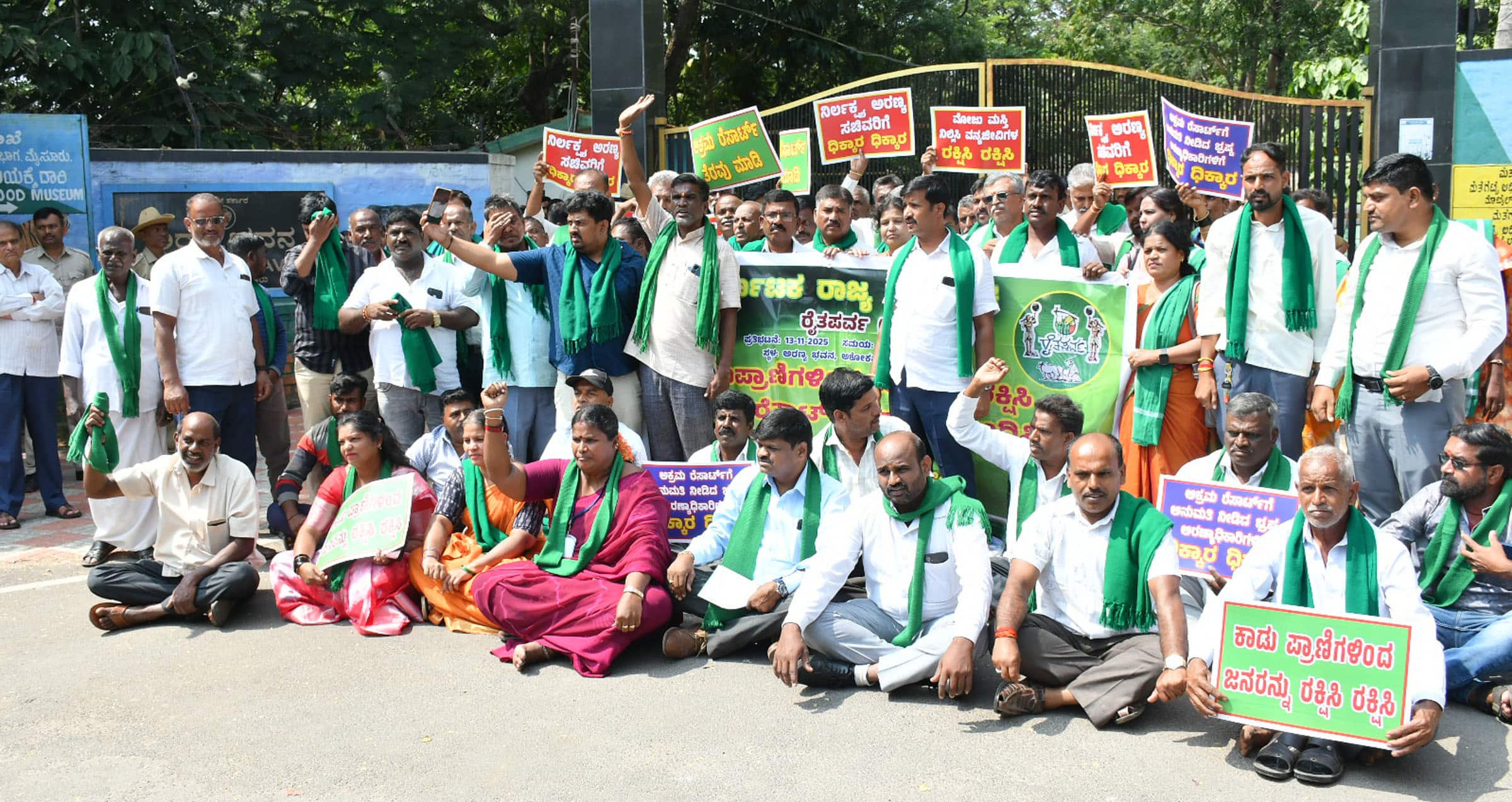 ಒಂದು ತಿಂಗಳ ಅವಧಿಯಲ್ಲಿ ಹುಲಿ ದಾಳಿಗೆ ಮೂವರು ಜೀವ ಕಳೆದುಕೊಂಡು, ಓರ್ವ ರೈತ ಸಾವು ಬದುಕಿನ ನಡುವೆ ಹೋರಾಟ ನಡೆಸುತ್ತಿದ್ದಾರೆ. ಇದನ್ನು ತಡೆಯುವಲ್ಲಿ ವಿಫಲವಾದ ಅರಣ್ಯಾಧಿಕಾರಿಗಳ ವಿರುದ್ಧ ಘೋಷಣೆ ಕೂಗುತ್ತ ನೂರಾರು ರೈತರು ಅರಣ್ಯ ಭವನಕ್ಕೆ ಮುತ್ತಿಗೆ ಹಾಕಲು ಯತ್ನಿಸಿದರು.ಈ ವೇಳೆ ಪೊಲೀಸರು ಗೇಟನ್ನು ಮುಚ್ಚಿ, ಬ್ಯಾರಿಕೇಡ್ ಗಳನ್ನು ಹಾಕಿ ಪ್ರತಿಭಟನಾಕಾರರನ್ನು ತಡೆದರು. ಇದರಿಂದ ಪ್ರತಿಭಟನಾಕಾರರು ಪೊಲೀಸರೊಂದಿಗೆ ಮಾತಿನ ಚಕಮಕಿ ಉಂಟಾಯಿತು. ಒಳ ಬಿಡುವಂತೆ ಒತ್ತಾಯಿಸಿದರೂ ಪೊಲೀಸರು ಅವಕಾಶ ನೀಡಲಿಲ್ಲ. ಇದರಿಂದ ಘೋಷಣೆಗಳನ್ನು ಕೂಗಿ ಆಕ್ರೋಶ ವ್ಯಕ್ತಪಡಿಸಿ, ಗೇಟಿನ ಮುಂಭಾಗವೇ ಪ್ರತಿಭಟಿಸಿದರು.