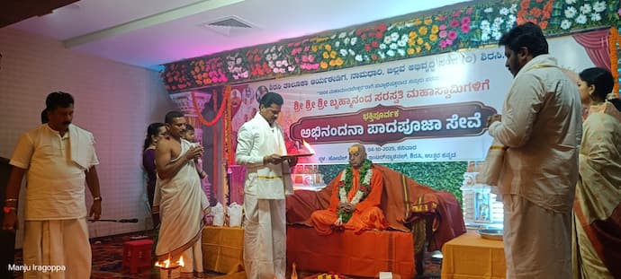 ಶಾಸಕ ಹಾಗೂ ಆರ್ಯ ಈಡಿಗ, ನಾಮಧಾರಿ, ಬಿಲ್ಲವ ಅಭಿವೃದ್ಧಿ ಸಂಘದ ಅಧ್ಯಕ್ಷ ಭೀಮಣ್ಣ ನಾಯ್ಕ ಮಾತನಾಡಿ, ಹಿಂದೂ ಧಾರ್ಮಿಕ ಪರಂಪರೆಯಲ್ಲಿ ಗುರು ಮತ್ತು ದೇವರ ಆಶೀರ್ವಾದದಿಂದ ಹೆಜ್ಜೆ ಇಟ್ಟಾಗ ಎಲ್ಲ ಕೆಲಸ ಈಡೇರುತ್ತದೆ. ಅಲ್ಲದೇ ಗುರಿ ತಲುಪಲು ಸಾಧ್ಯವಾಗುತ್ತದೆ. 1008 ಮಹಾ ಮಂಡಲೇಶ್ವರರಾಗಿ ಪಟ್ಟಾಭಿಷಕ್ತರಾದ ಬೃಹ್ಮಾನಂದ ಸ್ವಾಮೀಜಿಯ ಪಾದಪೂಜೆ ಮಾಡಿ ಎಂಬ ಸಂಕಲ್ಪ ಇಟ್ಟುಕೊಳ್ಳಲಾಗಿತ್ತು. ಅದು ಈಗ ಸಾಕಾರಗೊಂಡಿದೆ ಎಂದರು.ಸ್ಕೊಡ್ವೆಸ್ ಸಂಸ್ಥೆಯ ಕಾರ್ಯನಿರ್ವಾಹಕ ನಿರ್ದೇಶಕ ಡಾ. ವೆಂಕಟೇಶ ನಾಯ್ಕ ಪ್ರಾಸ್ತಾವಿಕ ಮಾತನಾಡಿ, ಉತ್ತರ ಕನ್ನಡ ಜಿಲ್ಲೆಯಲ್ಲಿ 4 ಲಕ್ಷ ಜನಸಂಖ್ಯೆ ಹೊಂದಿರುವ ಸಮುದಾಯದ ಸಂಘಟನೆಗಾಗಿ, ಸಮಾಜಕ್ಕೆ ಸಂಸ್ಕಾರ ನೀಡುತ್ತಾ ಮಾರ್ಗದರ್ಶನವನ್ನು ಶ್ರೀಗಳು ನೀಡುತ್ತಿದ್ದಾರೆ. ಧಾರ್ಮಿಕ, ಸಾಂಸ್ಕೃತಿಕ, ಸಾಮಾಜಿಕವಾಗಿ ಅಭಿವೃದ್ಧಿಯಾಗಬೇಕು ಎಂಬ ದೃಷ್ಟಿಕೋನದಿಂದ ವಿವಿಧ ಕಾರ್ಯಚಟುವಟಿಕೆಗಳನ್ನು ಶ್ರೀಗಳ ಮಾರ್ಗದರ್ಶನದಲ್ಲಿ ಹಮ್ಮಿಕೊಳ್ಳಲಾಗುತ್ತಿದೆ. ನಾರಾಯಣ ಗುರುನಗರದಲ್ಲಿ ಭವ್ಯ ಸಮುದಾಯ ಭವನಕ್ಕೆ ಭೂಮಿ ಪೂಜೆ ನೆರವೇರಿಸಲಾಗಿದೆ. ಸಮಾಜದ ಸಂಘಟನೆ, ಸಾಂಸ್ಕೃತಿಕ ಧಾರ್ಮಿಕ ಸಂಸ್ಕೃತಿ ಬರಬೇಕು. ಭವಿಷ್ಯತ್ತಿನ ವಿಚಾರಕ್ಕಾಗಿ ಒಂದಾಗಬೇಕು ಶ್ರೀಗಳ ಆಶಯದಂತೆ ನಾವೆಲ್ಲರೂ ಕಾರ್ಯನಿರ್ವಹಿಸಬೇಕಿದೆ ಎಂದರು.
