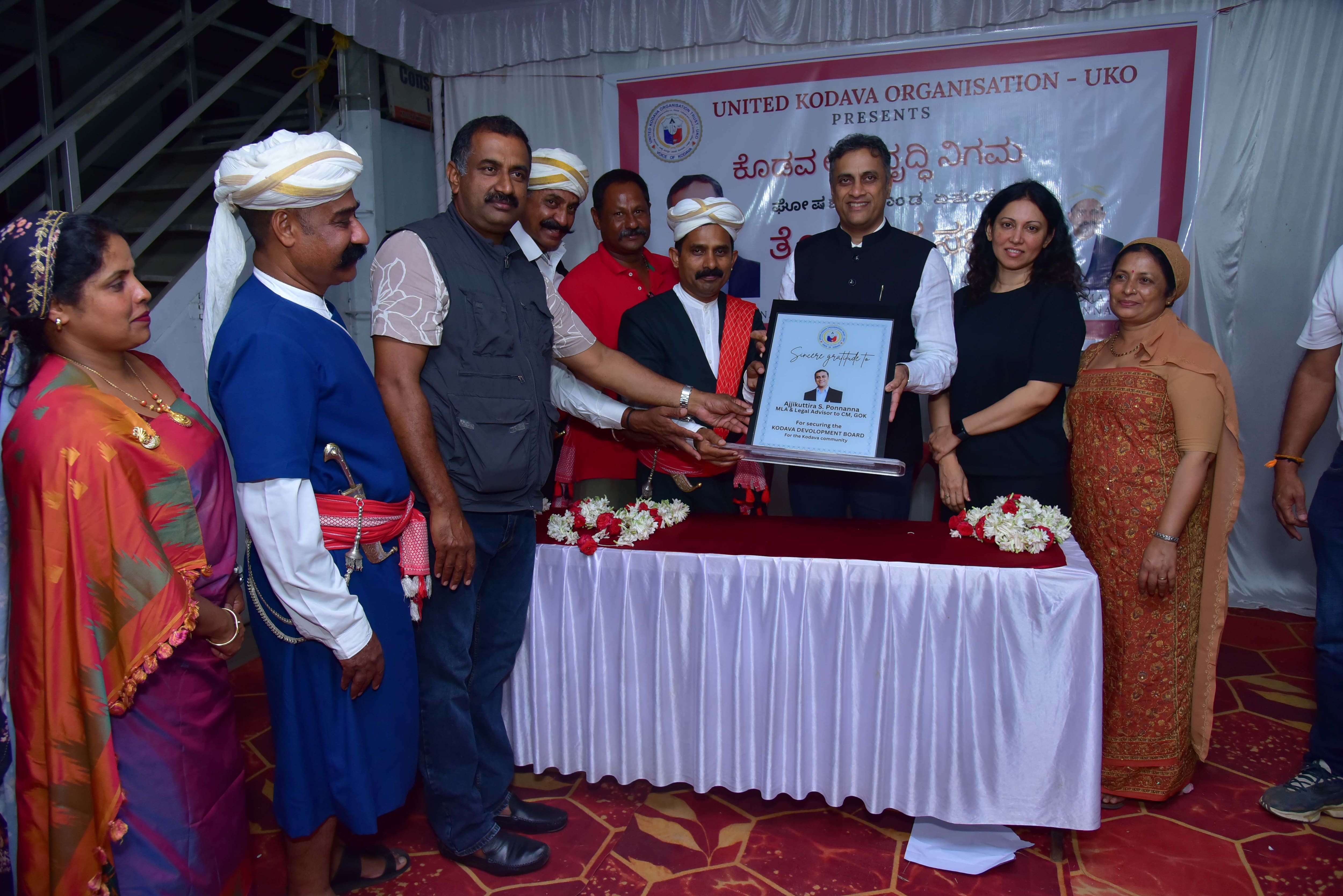ಕೊಡವ ಅಭಿವೃದ್ಧಿ ನಿಗಮದ ಅರಿವಾಯಿತು: ಸನ್ಮಾನ ಸ್ವೀಕರಿಸಿ ಮಾತನಾಡಿದ ಶಾಸಕ ಪೊನ್ನಣ್ಣ, ಯುಕೊ ಸಂಘಟನೆಯ ಮೂಲಕ ಮೊದಲಿಗೆ ಕೊಡವ ಅಭಿವೃದ್ಧಿ ನಿಗಮದ ಅರಿವಾಯಿತು. ಆ ನಂತರ ನನ್ನ ಚುನಾವಣಾ ಪ್ರಣಾಳಿಕೆಯಲ್ಲಿ ಘೋಷಿಸಲಾಗಿತ್ತು, ಅದರಂತೆ ಇದೀಗ ಕೊಡವ ಅಭಿವೃದ್ಧಿ ನಿಗಮ ಸ್ಥಾಪಿಸುವ ಕುರಿತ ನನ್ನ ಭರವಸೆಯನ್ನು ಈಡೇರಿಸಿದ್ದೇನೆ ಎಂದು ಹೇಳಿದರು. ಮುಖ್ಯಮಂತ್ರಿಗಳು ನನ್ನ ಮೇಲೆ ವಿಶ್ವಾಸವಿಟ್ಟು ಕೊಡವ ಅಭಿವೃದ್ದಿ ನಿಗಮ ಸ್ಥಾಪಿಸಲು ಒಪ್ಪಿಗೆ ನೀಡಿದರು. ಇದೀಗ ಕೊಡವ ಅಭಿವೃದ್ಧಿ ನಿಗಮವು ಕಂಪೆನಿ ಕಾಯ್ದೆಯನುಸಾರ ನೋಂದಣಿಯಾಗಿದ್ದು, ಶೀಘ್ರದಲ್ಲೇ ಸೂಕ್ತ ಅನುದಾನ ಮೀಸಲಿಟ್ಟು ಆಡಳಿತ ಮಂಡಳಿ ರಚನಾ ಪ್ರಕ್ರಿಯೆಯೂ ಪೂರ್ಣಗೊಳ್ಳಲಿದೆ ಎಂದು ತಿಳಿಸಿದರು. ವೇದಿಕೆಯಲ್ಲಿ, ಮೂರ್ನಾಡ್ ಕೊಡವ ಸಮಾಜದ ಅಧ್ಯಕ್ಷರಾದ ತೇಲಪಂಡ ಸುಬ್ಬಯ್ಯ, ಕೊಲ್ಲೀರ ಉಮೇಶ್ ಉಪಸ್ಥಿತರಿದ್ದರು. ಕಳ್ಳಿಚಂಡ ರಾಬಿನ್ ಸುಬ್ಬಯ್ಯ ಸ್ವಾಗತಿಸಿ ಚೆಪ್ಪುಡಿರ ಸುಜು ಕರುಂಬಯ್ಯ ವಂದಿಸಿದರು.ಕಾರ್ಯಕ್ರಮದಲ್ಲಿ, ಕರ್ನಾಟಕ ಕೊಡವ ಸಾಹಿತ್ಯ ಅಖಾಡೆಮಿ ಸದಸ್ಯ ಚೊಟ್ಟೆಯಂಡ ಸಂಜು ಕಾವೇರಪ್ಪ, ಅಪ್ಪಾರಂಡ ವೇಣು ಪೊನ್ನಪ್ಪ, ಕಳ್ಳಿಚಂಡ ರತನ್, ಅಳಮೇಂಗಡ ಮೋಟಯ್ಯ, ಪಳಂಗಿಯಂಡ ದರ್ಶನ್, ಚಂಗುಲಂಡ ಅಯ್ಯಪ್ಪ, ಜಮ್ಮಡ ಗಣೇಶ್, ತೀತಿರ ಕುಟ್ಟಪ್ಪ, ಮುಂಡಂಡ ಅರುಣ್, ಮುಕ್ತಾಟಿರ ರಾಬಿನ್, ಚಂಗಂಡ ಸೂರಜ್, ನೆರ್ಪಂಡ ಪ್ರತೀಕ್ ಪೊನ್ನಣ್ಣ, ನೂರೆರ ಜೀವನ್, ಕೊಲ್ಲೀರ ಗಯಾ, ಕಾವಡಿಚಂಡ ದೀಪಕ್, ಕಾಟಿಮಾಡ ಗಿರಿ, ನೆಲ್ಲಮಕ್ಕಡ ಮಾದಯ್ಯ, ಮಚ್ಚಾಮಾಡ ರಮೇಶ್, ಅರುಣ್, ಬಾದುಮಂಡ ವಿಷ್ಣು, ಕಡೇಮಾಡ ತಿಮ್ಮಯ್ಯ, ಕೊಪ್ಪೀರ ದಿವಿನ್, ಕಾಯಪಂಡ ಬೋಪಣ್ಣ, ಮಾಣಿಪಂಡ ಅಯ್ಯಪ್ಪ, ಚೆಪ್ಪುಡಿರ ಪ್ರತಿಮ, ಕಳ್ಳಿಚಂಡ ದೀನ, ಬಳ್ಳಚೆಟ್ಟಿರ ಮೈನ, ಕುಂಜಿಲಂಡ ಗ್ರೇಸಿ, ಪಾಂಡಂಡ ಸ್ವಾತಿ, ಕಾವಡಿಚಂಡ ಪವಿತ್ರ ಹಾಗು ಇತರರು ಉಪಸ್ಥಿತರಿದ್ದರು.