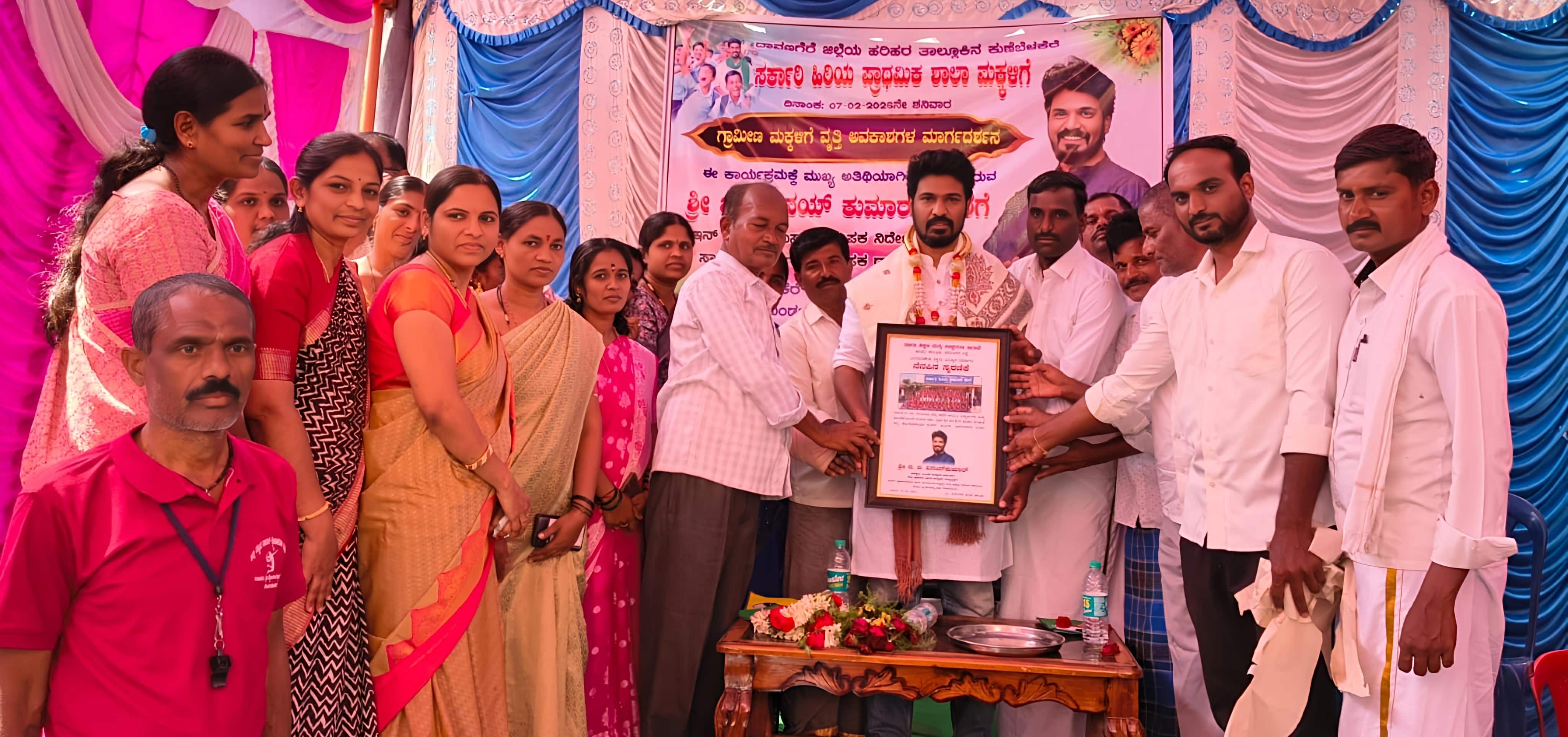 -07HRR.05:ಹರಿಹರ ತಾಲೂಕಿನ ಕುಣಿಬೆಳಕೆರೆ ಸರ್ಕಾರಿ ಹಿರಿಯ ಪ್ರಾಥಮಿಕ ಹಾಗೂ ಗ್ರಾಮೀಣ ಪ್ರದೇಶ ಮಕ್ಕಳಿಗೆ ಏರ್ಪಡಿಸಿದ್ದ ವೃತ್ತಿ ಅವಕಾಶಗಳ ಮಾರ್ಗದರ್ಶನ ಕಾರ್ಯಕ್ರಮದಲ್ಲಿ ವಿನಯ್ ಕುಮಾರ್ ಅವರನ್ನು ಗೌರವಿಸಲಾಯಿತು.