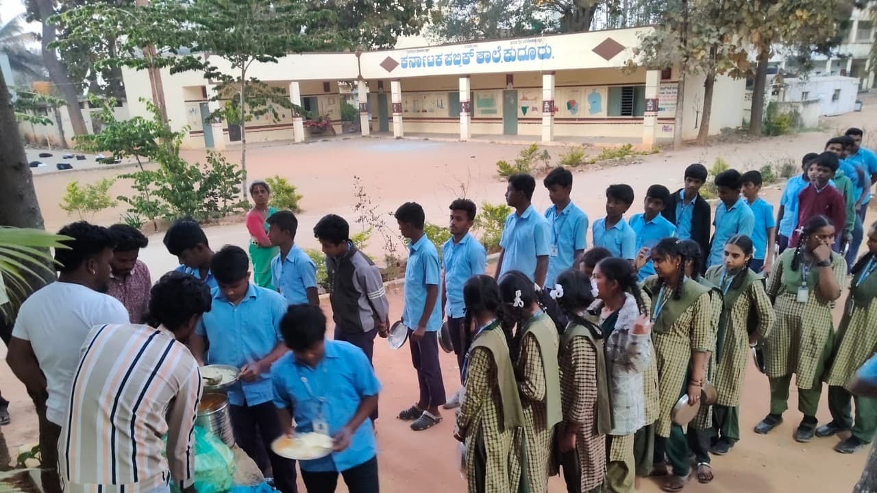 ಕುದೂರು: ಇದೊಂದು ಸರ್ಕಾರಿ ಶಾಲೆ. ಹತ್ತನೇ ತರಗತಿ ಓದುವ ಮಕ್ಕಳನ್ನು ರಾತ್ರಿ 8 ಗಂಟೆ ತನಕ ಶಾಲೆಯಲ್ಲಿಟ್ಟುಕೊಂಡು, ವಿಶೇಷ ತರಬೇತಿ ನೀಡುತ್ತಾರೆ. ಸಂಜೆ ವೇಳೆಗೆ ಮಕ್ಕಳಿಗೆ ಹಸಿವಾಗಿರುತ್ತದೆ ಎಂದು ಹಳೇ ವಿದ್ಯಾರ್ಥಿಗಳ ಸಹಾಯದಿಂದ ತಿಂಡಿ ವ್ಯವಸ್ಥೆ ಮಾಡಲಾಗಿದೆ