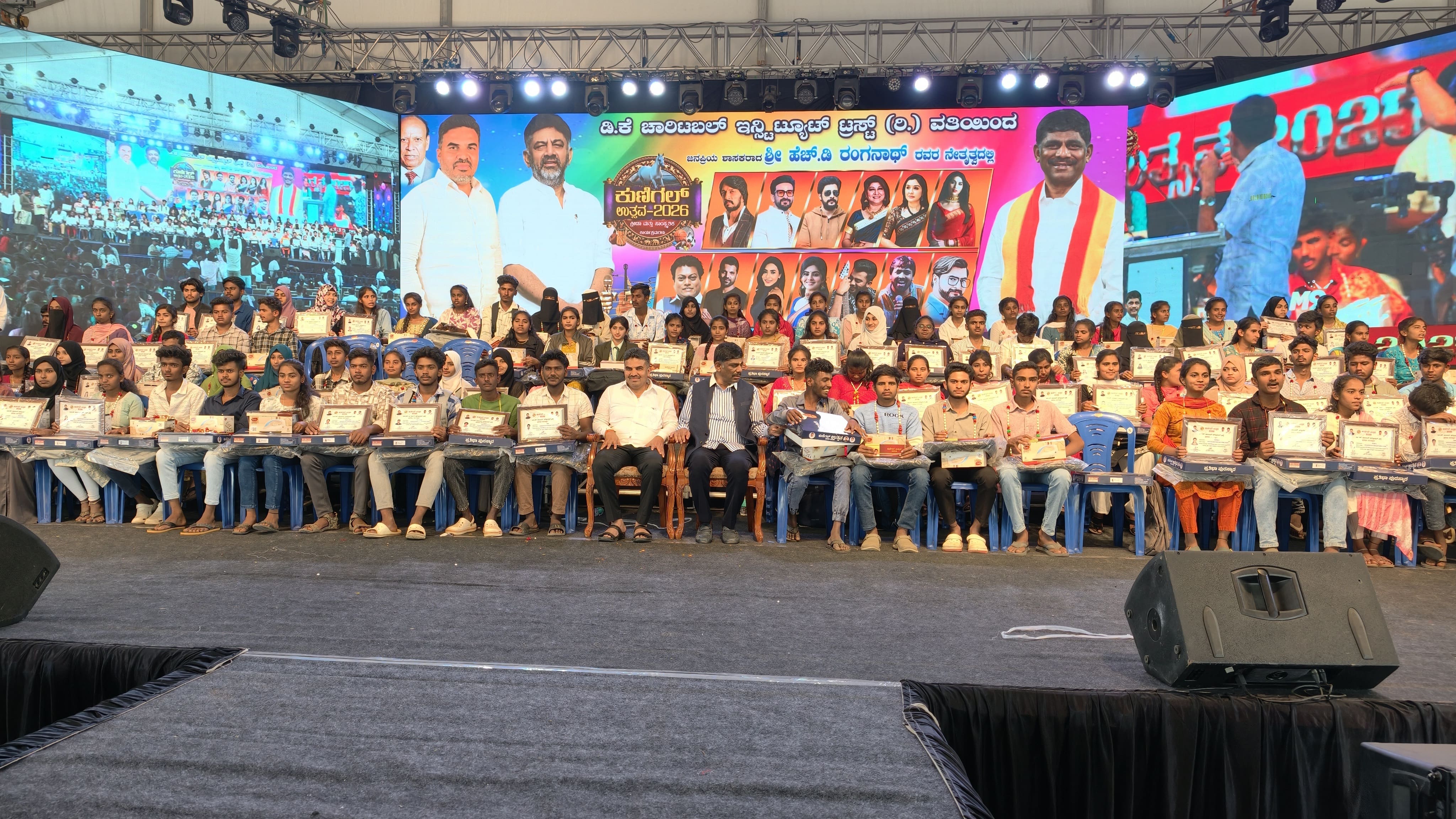 ತಾಲೂಕಿನ ವಿವಿಧ ಭಾಗಗಳಲ್ಲಿನ ಹಲವಾರು ವಿಶೇಷ ಸಾಂಸ್ಕೃತಿಕ ಧಾರ್ಮಿಕ ಹಾಗೂ ಕ್ರೀಡೆ ಕಾರ್ಯಕ್ರಮ ಸೇರಿದಂತೆ ಹಲವಾರು ರಂಗಗಳಲ್ಲಿ ಪ್ರತಿಭಾವಂತರನ್ನು ಗುರುತಿಸಿ ಪ್ರೋತ್ಸಾಹಿಸುವ ಕೆಲಸವನ್ನು ಡಿಕೆಎಸ್ ಚಾರಿ ಟಬಲ್ ಟ್ರಸ್ಟ್ ವತಿಯಿಂದ ಕುಣಿಗಲ್ ಶಾಸಕರ ನೇತೃತ್ವದಲ್ಲಿ ಮಾಡಲಾಗುತ್ತಿದೆ. ಇದು ನಿಮ್ಮ ಗ್ರಾಮದಂತೆ ಪ್ರತಿ ಗ್ರಾಮದಲ್ಲಿ ಆಚರಿಸುವ ಹಬ್ಬ ಅಲ್ಲ ಕುಣಿಗಲ್ ತಾಲೂಕಿನ ಎಲ್ಲಾ ಜನಾಂಗದವರು ವಿದ್ಯಾರ್ಥಿಗಳು ಸೇರಿದಂತೆ ಪ್ರತಿಯೊಬ್ಬರೂ ಕೂಡ ಈ ಆಚರಣೆಯನ್ನು ಆಚರಿಸುವ ಕಾರ್ಯಕ್ರಮ ಆಗಿದೆ. ರೈತರ ಮಕ್ಕಳು ಆತ್ಮವಿಶ್ವಾಸವನ್ನು ಕಳೆದುಕೊಳ್ಳಬಾರದು ಉತ್ತಮ ಸಾಧನೆ ಹಾಗೂ ಬುದ್ಧಿವಂತಿಕೆಯಿಂದ ತಮ್ಮ ಕ್ಷೇತ್ರದಲ್ಲಿ ಸ್ಪರ್ಧಾತ್ಮಕ ಪರಿಣಾಮಗಳನ್ನು ಎದುರಿಸುವ ಪ್ರಯತ್ನ ಆಗಬೇಕು ಎಂದರು. ಸಚಿವ ರಾಮಲಿಂಗಾರೆಡ್ಡಿ ಮಾತನಾಡಿ ಡಿ ಕೆ ಸೋದರರು ಉತ್ತಮವಾದ ಕಾರ್ಯಕ್ರಮವನ್ನು ಮಾಡುತ್ತಿದ್ದಾರೆ ಶಾಸಕ ಡಾ ರಂಗನಾಥ್ ಕೂಡ ಅವರ ಹಾದಿಯಲ್ಲಿ ರಾಜಕೀಯ ಕ್ಷೇತ್ರದ ಜೊತೆಗೆ ಸೇವೆಯನ್ನು ಕೂಡ ತೊಡಗಿಸಿಕೊಂಡು ಉತ್ತಮ ರಾಜಕಾರಣಿ ಎಂಬುದನ್ನ ಪ್ರತಿಬಿಂಬಿಸಿದ್ದಾರೆ ಅವರ ಭವಿಷ್ಯ ಉತ್ತಮವಾಗಿರಲಿ ಎಂದು ಹಾರೈಸಿದರು. ಕಾರ್ಯಕ್ರಮದಲ್ಲಿ ಶಾಸಕ ಡಾ. ರಂಗನಾಥ್ ಸೇರಿದಂತೆ ಅನೇಕರಿದ್ದರು.