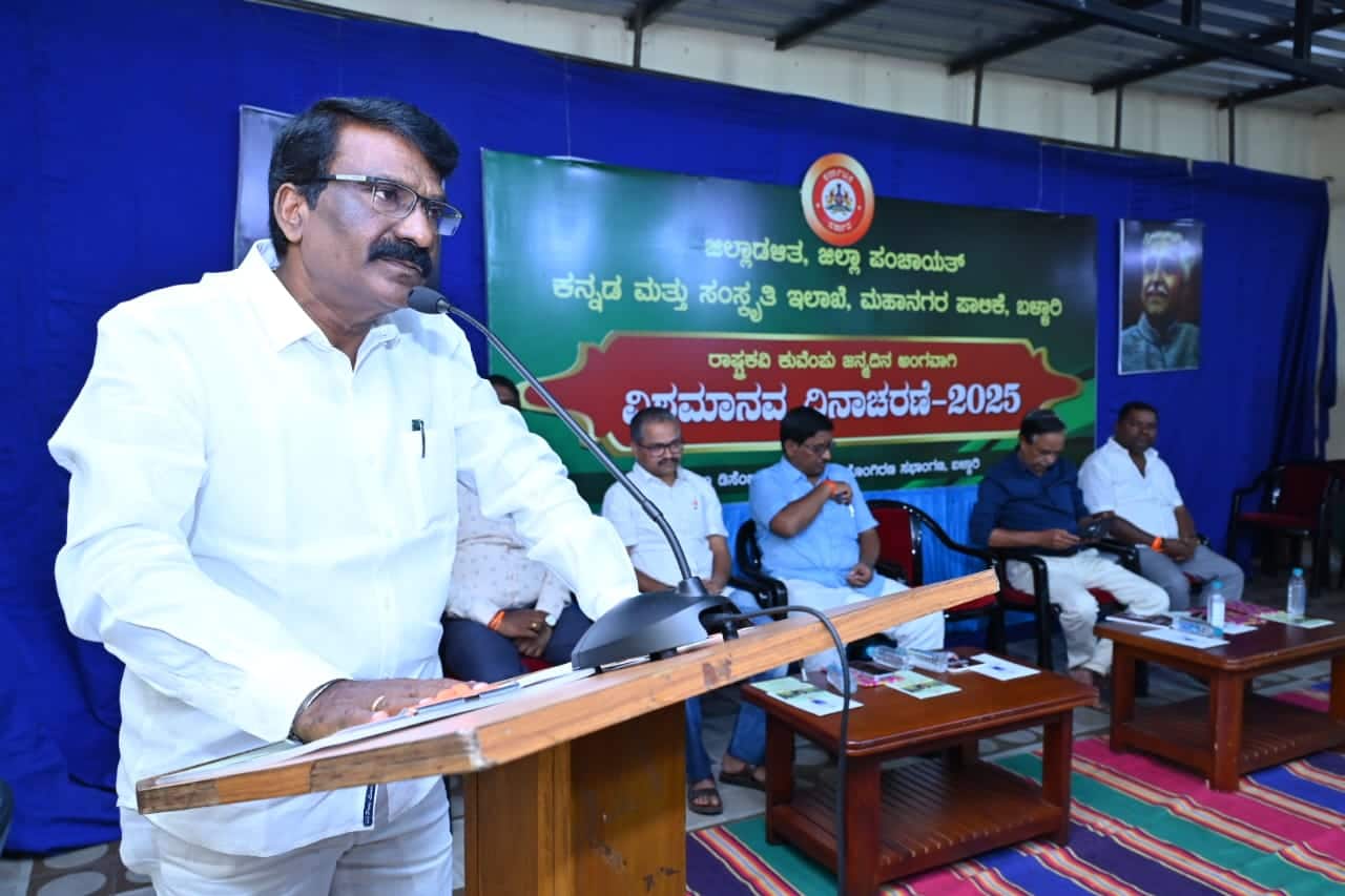 ಬಳ್ಳಾರಿ: ಜ್ಞಾನಪೀಠ ಪ್ರಶಸ್ತಿ ಪುರಸ್ಕೃತರಾದ ರಾಷ್ಟ್ರಕವಿ ಕುವೆಂಪು ವಿಶ್ವ ಮಾನವ ಸಂದೇಶ ಸಾರುವ ಮೂಲಕ ಕನ್ನಡ ಸಾಹಿತ್ಯ ಲೋಕದ ಅದಮ್ಯ ಚೇತನವಾಗಿದ್ದರು ಎಂದು ಡಾ.ಬಾಬು ಜಗಜೀವನ ರಾಮ್ ಚರ್ಮ ಕೈಗಾರಿಕಾ ಅಭಿವೃದ್ಧಿ ನಿಗಮದ ಅಧ್ಯಕ್ಷ ಮುಂಡರಗಿ ನಾಗರಾಜ ತಿಳಿಸಿದರು.