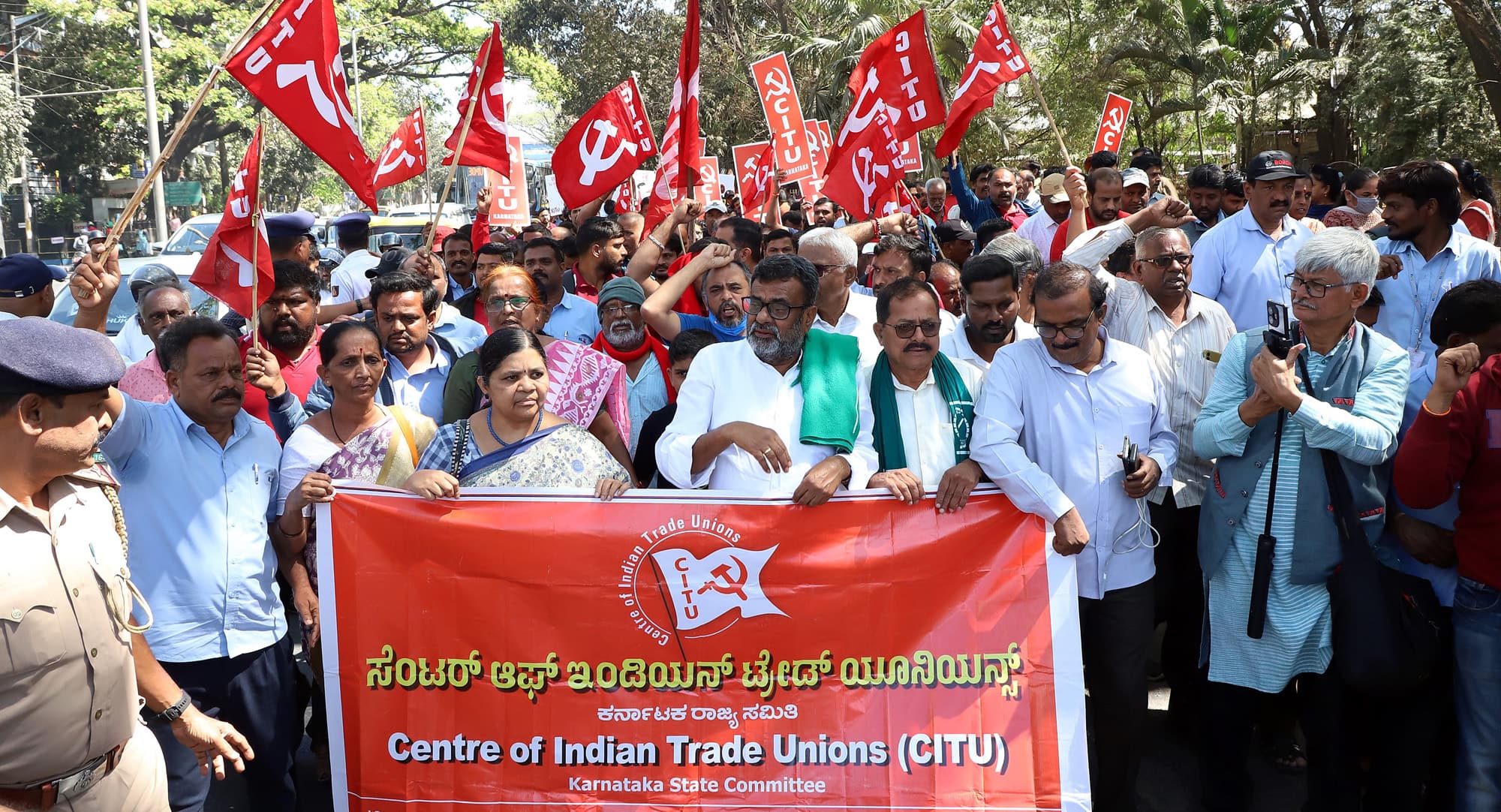 ಆದರೆ, ಟೌನ್ ಹಾಲ್ ಬಳಿ ಯಾವುದೇ ಪ್ರತಿಭಟನೆಗೆ ಅವಕಾಶವಿಲ್ಲ ಎಂದು ಪೊಲೀಸರು ಮೊದಲೇ ತಿಳಿಸಿದ್ದರು. ಹೆಚ್ಚಿನವರು ಸೇರುತ್ತಿರುವುದು ಕಂಡು ಪೊಲೀಸರು ಹೋರಾಟಗಾರರನ್ನು ವಶಕ್ಕೆ ಪಡೆಯಲು ಮುಂದಾದರು. ಈ ಹಂತದಲ್ಲಿ ತಳ್ಳಾಟ, ನೂಕಾಟ ವಾಗ್ವಾದಗಳು ನಡೆದವು. ಸುಮಾರು ಐದಾರು ಬಿಎಂಟಿಸಿ ಬಸ್ಸುಗಳಲ್ಲಿ 500ಕ್ಕೂ ಹೆಚ್ಚು ಜನರನ್ನು ಆಡುಗೋಡಿ ಸಿಎಆರ್ ಕವಾಯತು ಮೈದಾನಕ್ಕೆ ಕರೆದೊಯ್ದು ಮಧ್ಯಾಹ್ನ ಬಿಡುಗಡೆ ಮಾಡಿದರು.4 ಲೇಬರ್ ಕೋಡ್ ರದ್ದುಗೊಳಿಸಬೇಕು, ನರೇಗಾ ಯೋಜನೆಯನ್ನು ಪುನರ್ ಸ್ಥಾಪಿಸಿ, ವಿ.ಜಿ ರಾಮ್ ಜಿ ಕಾಯ್ದೆ ರದ್ದುಗೊಳಿಸಬೇಕು, ಭೂ ಸ್ವಾಧೀನ ಕಾಯ್ದೆಯನ್ನು ಹಿಂಪಡೆಯುವಂತೆ ಕೇಂದ್ರ ಹಾಗೂ ರಾಜ್ಯ ಸರ್ಕಾರದ ವಿರುದ್ಧ ಪ್ರತಿಭಟನಕಾರರು ಆಕ್ರೋಶ ವ್ಯಕ್ತಪಡಿಸಿದಿರು. ಕೇಂದ್ರ ಮತ್ತು ರಾಜ್ಯ ಸರ್ಕಾರಗಳು ತಂದಿರುವ ಭೂಸುಧಾರಣಾ, ಎಪಿಎಂಸಿ, ಜಾನುವಾರು ಸಂರಕ್ಷಣಾ ತಿದ್ದುಪಡಿ ಕಾಯ್ದೆಗಳನ್ನು ಹಿಂಪಡೆಯಬೇಕು, ವಿದ್ಯುಚ್ಛಕ್ತಿ ಖಾಸಗೀಕರಣ ಮಾಡುವುದನ್ನು ನಿಲ್ಲಿಸಬೇಕು. ಬೀಜ ಮಸೂದೆ ಕಾಯ್ದೆ ಹಿಂಪಡೆಯಬೇಕು ಎಂದು ಮನವಿ ಮಾಡಿದರು. ಪ್ರಮುಖರಾದ ಜಿ.ಆರ್.ಶಿವಶಂಕರ್, ಲಕ್ಷ್ಮಿ ವೆಂಕಟೇಶ್, ಶಾಮಣ್ಣ ರೆಡ್ಡಿ, ವಿಜಯ ಭಾಸ್ಕರ್, ಅತ್ಯಾನಂದ, ಜಯಮ್ಮ ಅಮ್ಜದ್, ವರಲಕ್ಷ್ಮಿ , ಆರ್.ವಿ.ಹರೀಶ್ ನಾಗನಾಥ್, ಕೆ.ವಿ.ಭಟ್ ಸೇರಿ ಹಲವರಿದ್ದರು.