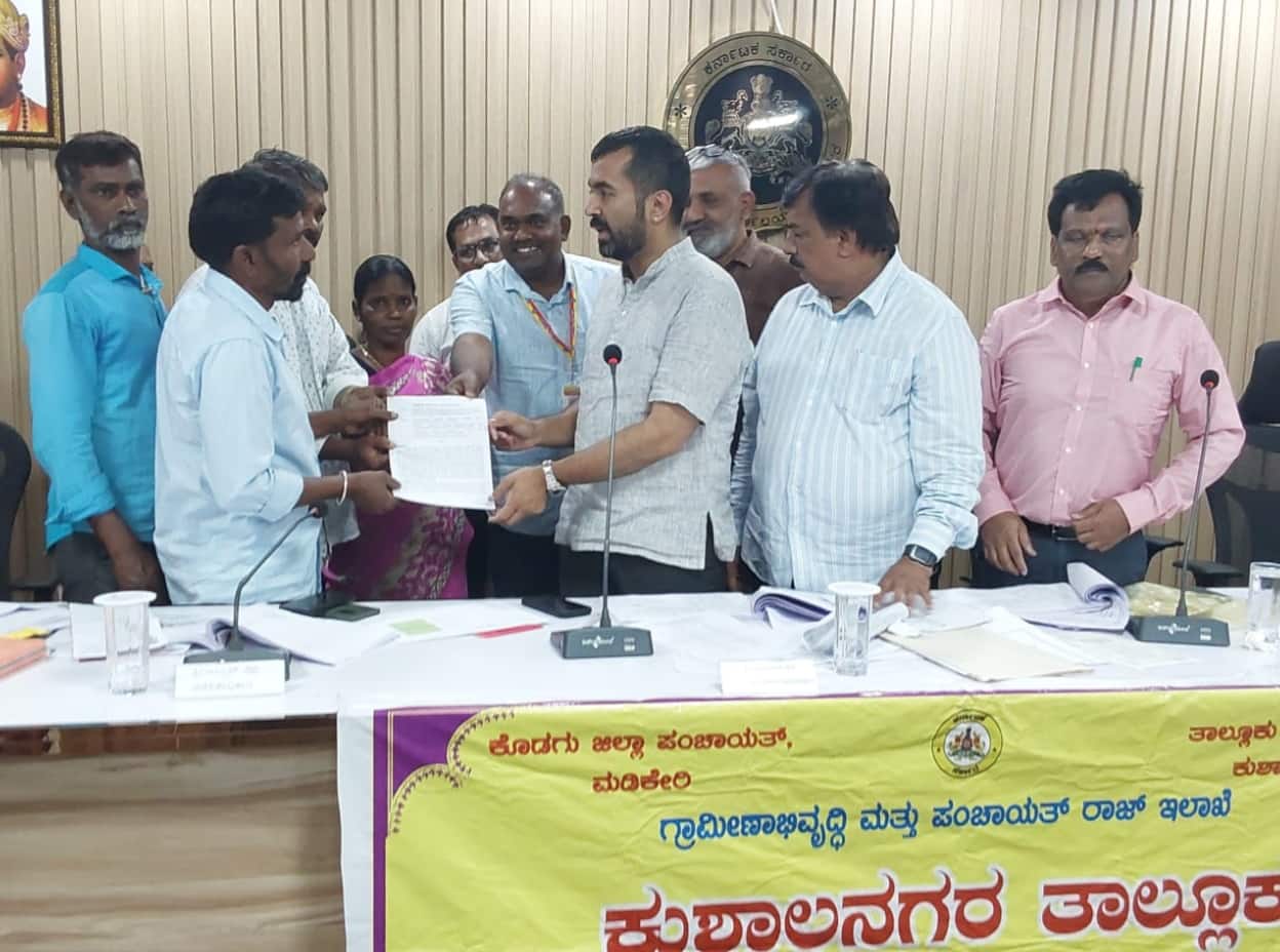 ಕುಶಾಲನಗರ ಪುರಸಭೆಯ ಪೌರ ಕಾರ್ಮಿಕರಿಗೆ ವಸತಿ ಗೃಹಗಳ ನಿರ್ಮಾಣಕ್ಕೆ ಅಗತ್ಯವಿರುವ ಒಂದು ಎಕರೆ ಜಾಗದ ಹಕ್ಕುಪತ್ರ ಆದೇಶ ಪ್ರತಿಯನ್ನು ಮಡಿಕೇರಿ ಕ್ಷೇತ್ರ ಶಾಸಕರು ಪೌರ ಕಾರ್ಮಿಕರ ಸಂಘದ ಪದಾಧಿಕಾರಿಗಳಿಗೆ ಹಸ್ತಾಂತರ ಮಾಡಿದರು.
