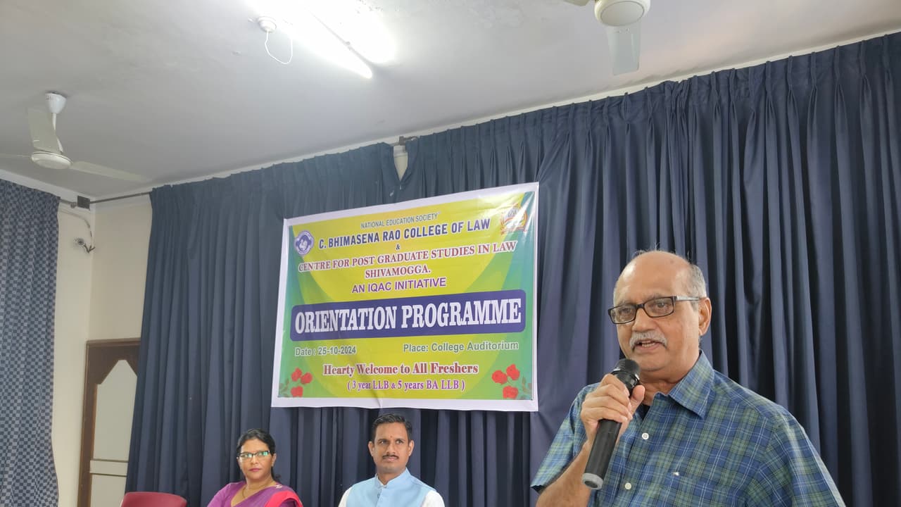 ಶಿವಮೊಗ್ಗದ ನಗರದ ಸಿ.ಭೀಮಸೇನರಾವ್ ಕಾನೂನು ಮಹಾವಿದ್ಯಾಲಯದಲ್ಲಿ ಶುಕ್ರವಾರ ಆಯೋಜಿಸಿದ್ದ ಕಾನೂನು ವಿದ್ಯಾರ್ಥಿಗಳಿಗಾಗಿ ಏರ್ಪಡಿಸಿದ್ದ ಅಭಿವಿನ್ಯಾಸ (ಓರಿಯಂಟೇಷನ್) ಕಾರ್ಯಕ್ರಮದಲ್ಲಿ ರಾಷ್ಟ್ರೀಯ ಶಿಕ್ಷಣ ಸಮಿತಿ ಕಾರ್ಯದರ್ಶಿ ಎಸ್.ಎನ್.ನಾಗರಾಜ ಮಾತನಾಡಿದರು.