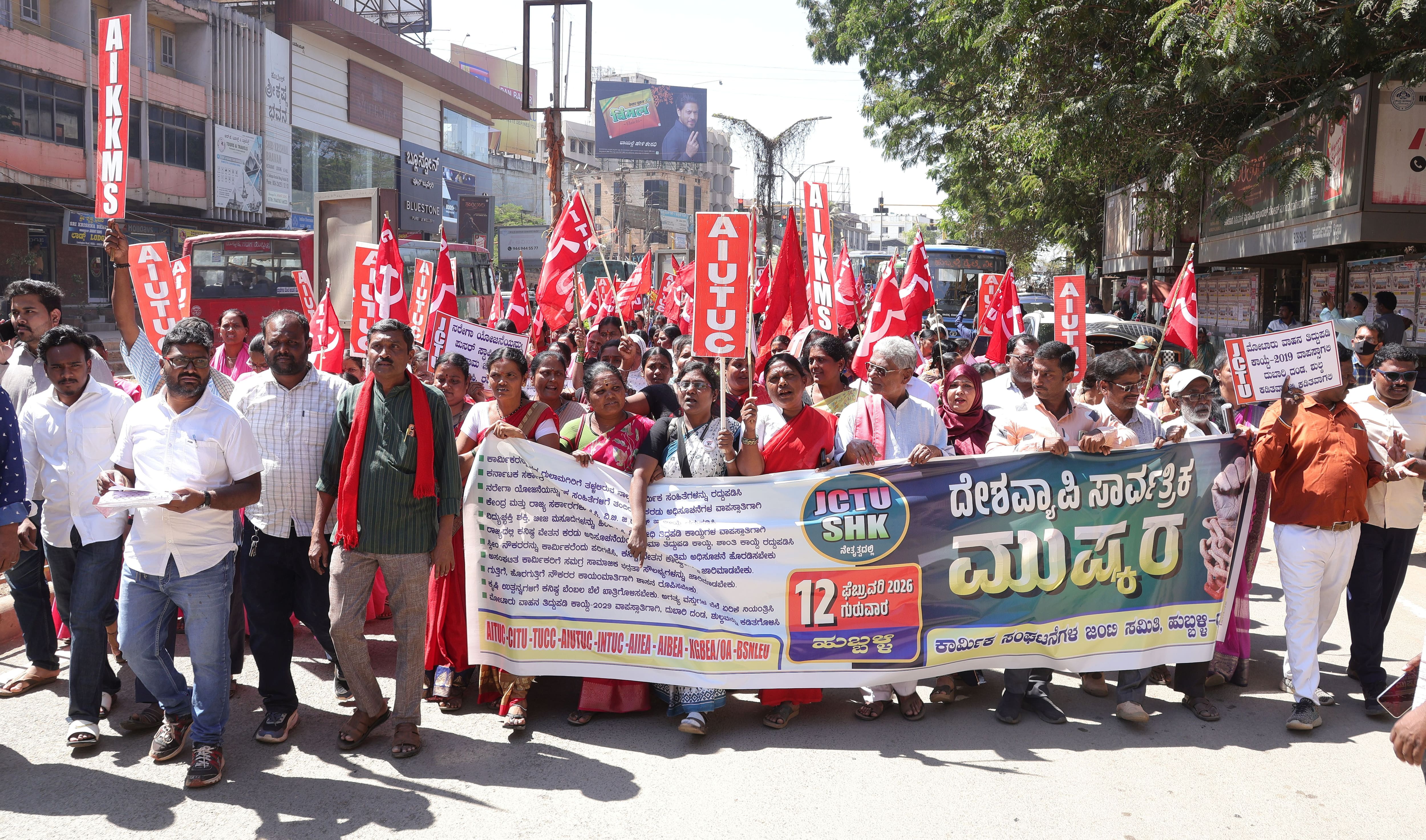 ಈ ವೇಳೆ ಮಾತನಾಡಿದ ಸಿಐಟಿಯು ಮಹೇಶ ಪತ್ತಾರ, ವ್ಯಾಪಾರ ಸುಲಭೀಕರಣ, ಯೂನಿಯನ್ ಮುಕ್ತ ವಾತಾವರಣ ನಿರ್ಮಿಸಲು 29 ಕಾರ್ಮಿಕ ಕಾನೂನು ರದ್ದುಗೊಳಿಸಿ 4 ಸಂಹಿತೆ ಜಾರಿ ಮಾಡಿರುವುದು ಆರ್ಥಿಕ ದಾಳಿ ಮಾತ್ರವಲ್ಲದೇ, ರಾಜಕೀಯ ದಾಳಿಯೂ ಆಗಿದೆ. ಕಾರ್ಮಿಕ ಮಿತಿ ಹೆಚ್ಚಳದಿಂದ ಶೇ. 90ರಷ್ಟು ಕಾರ್ಮಿಕರಿಗೆ ಇಎಸ್ಐ, ಪಿಎಫ್, ಗ್ರ್ಯಾಚುಟಿ, ಬೋನಸ್ ಹಕ್ಕುಗಳಿಂದ ಹೊರಗುಳಿಯುತ್ತಾರೆ. ಹೀಗಾಗಿ ಈ ಸಂಹಿತೆಗಳನ್ನು ರದ್ದುಗೊಳಿಸಬೇಕೆಂದು ಒತ್ತಾಯಿಸಿದರು.ರೈತರು ಬೆಳೆದ ಬೆಳೆಗಳಿಗೆ ಬೆಂಬಲ ಬೆಲೆ ನೀಡದೇ, ಕಂಪನಿ ಕೃಷಿಯನ್ನು ಉತ್ತೇಜಿಸಿ ಬಲವಂತರ ಭೂಸ್ವಾಧೀನ ಕಾಯ್ದೆಗೆ ತಿದ್ದುಪಡಿ ತಂದು ರೈತರ ಭೂಮಿ ವಶಪಡಿಸಿಕೊಳ್ಳಲಾಗುತ್ತಿದೆ. ಇದರಿಂದ ರೈತರು, ಕೂಲಿಕಾರರು ನಿರುದ್ಯೋಗಿಗಳಾಗಲಿದ್ದಾರೆ ಎಂದು ಕಿಡಿಕಾರಿದರು.