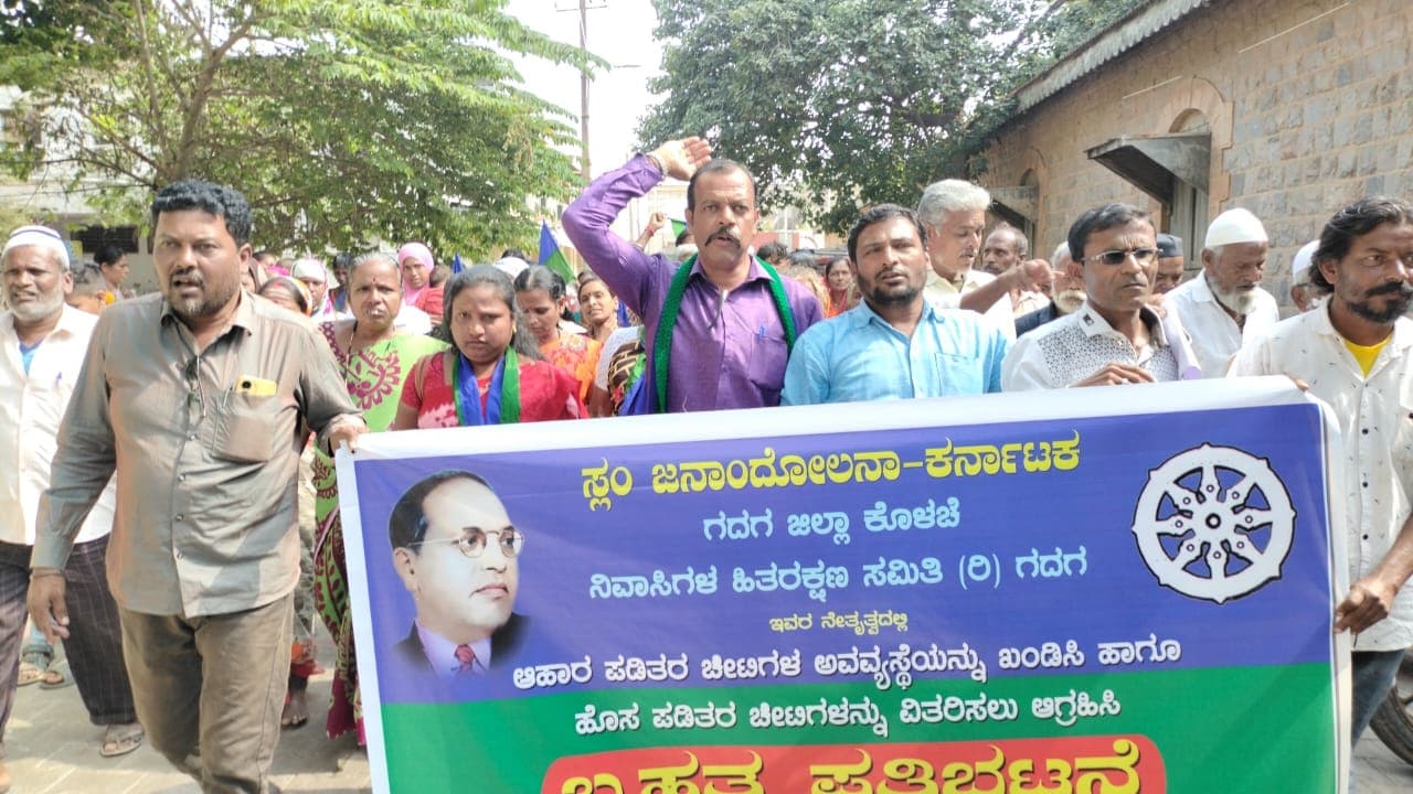 ರಾಜ್ಯ ಸರ್ಕಾರ ಜಾರಿಗೆ ತಂದಿರುವ ಅನ್ನಭಾಗ್ಯ ಯೋಜನೆಯಡಿಯಲ್ಲಿ ಫಲಾನುಭವಿಗಳಿಗೆ ನೇರ ಹಣ ವರ್ಗಾವಣೆಯಲ್ಲಿ ಆಗುತ್ತಿರುವ ತೊಂದರೆ ಹಾಗೂ ಹೊಸ ಪಡಿತರ ಚೀಟಿಗಳ ವಿತರಣೆಯಲ್ಲಿ ಆಗುತ್ತಿರುವ ವಿಳಂಬ ಮತ್ತು ಗೊಂದಲವನ್ನು ಸರಿಪಡಿಸಲು ಆಗ್ರಹಿಸಿ ಸೋಮವಾರ ಸ್ಲಂ ಜನಾಂದೋಲನ ಜಿಲ್ಲಾ ಸಮಿತಿಯ ನೇತೃತ್ವದಲ್ಲಿ ಸ್ಲಂ ನಿವಾಸಿಗಳು ಗಾಂಧಿ ವೃತ್ತದಿಂದ ಪ್ರತಿಭಟನಾ ಮೆರವಣಿಗೆ ನಡೆಸಿ ಆಹಾರ ಇಲಾಖೆಗೆ ಮುತ್ತಿಗೆ ಹಾಕಿ ಪ್ರತಿಭಟನೆ ನಡೆಸಿದರು.