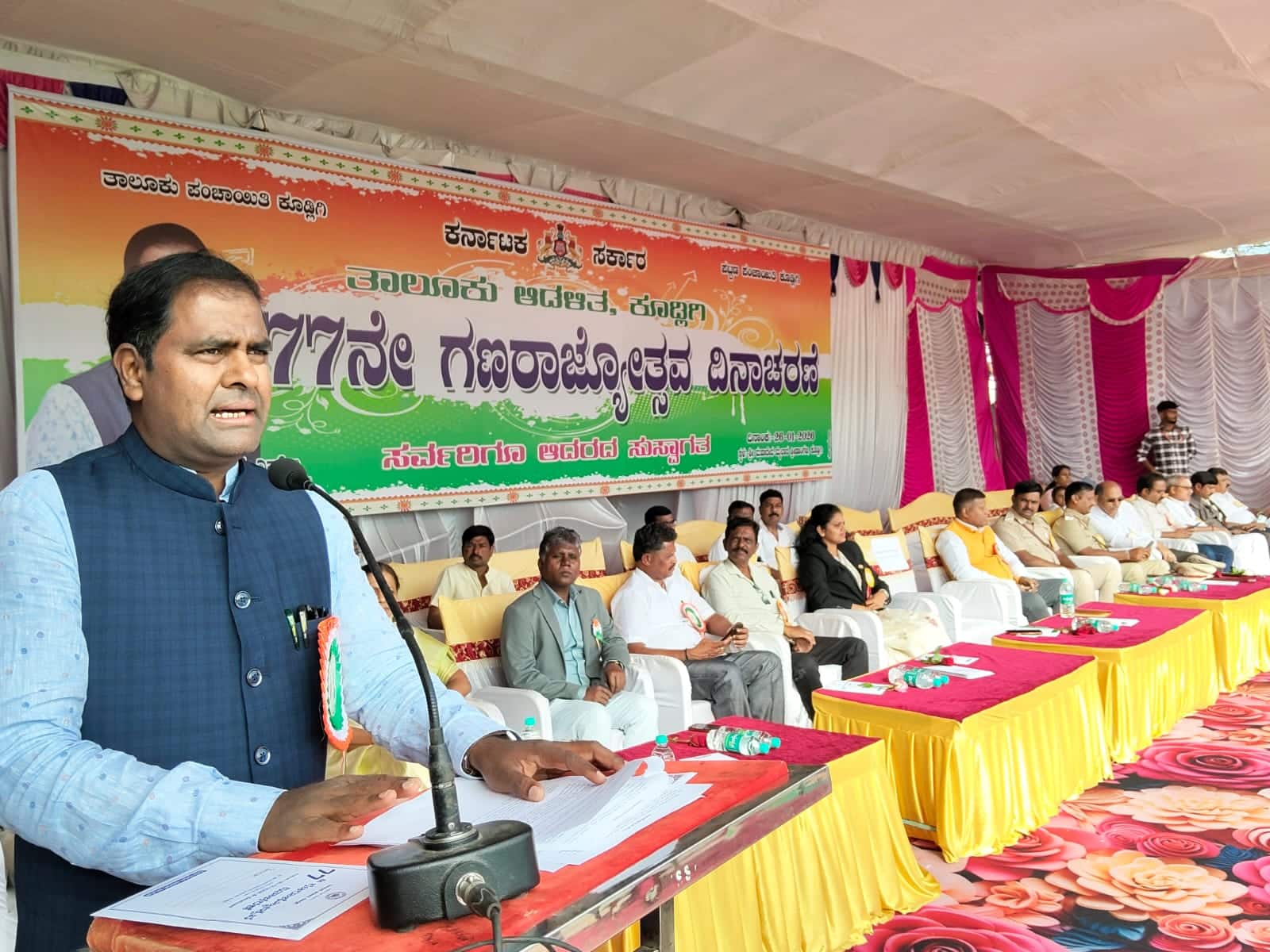 ಅವರು ಪಟ್ಟಣದ ಮಹದೇವ ಮೈಲಾರ ಕ್ರೀಡಾಂಗಣ ಬಯಲು ರಂಗಮಂದಿರ ವೇದಿಕೆಯಲ್ಲಿ ತಾಲೂಕು ಆಡಳಿತದಿಂದ ಆಯೋಜಿಸಿದ 77ನೇ ಗಣರಾಜ್ಯೋತ್ಸವದ ಕಾರ್ಯಕ್ರಮದಲ್ಲಿ ಅಧ್ಯಕ್ಷತೆ ವಹಿಸಿ ಮಾತನಾಡುತ್ತಿದ್ದರು. ದೇಶದ ಸ್ವಾತಂತ್ರ್ಯ ನಂತರ ದೇಶಕ್ಕೆ ಬೇಕಾದ ನ್ಯಾಯ ಸಮ್ಮತ ಕಾನೂನು ರೂಪಿಸುವ ಸಂವಿಧಾನವನ್ನು ರಚನೆ ಮಾಡಬೇಕೆಂದು ಕರಡು ಸಮಿತಿಯನ್ನು ರಚಿಸಿ ಡಾ.ಬಿ.ಆರ್. ಅಂಬೇಡ್ಕರ್ ನೇತೃತ್ವದಲ್ಲಿ ಲಿಖಿತ ಸಂವಿಧಾನ ರಚನೆ ಮಾಡಲಾಯಿತು. ನಮ್ಮ ದೇಶದ ಸಂವಿಧಾನವು ಇಡೀ ವಿಶ್ವಕ್ಕೆ ಮಾದರಿಯಾಗಿದೆ. ಕೂಡ್ಲಿಗಿ ಪಟ್ಟಣದ ಸರ್ಕಾರಿ ಆಸ್ಪತ್ರೆಯನ್ನು 100 ಹಾಸಿಗೆಯಿಂದ 150ಹಾಸಿಗೆ ಆಸ್ಪತ್ರೆಯಾಗಿ ಮೇಲ್ದರ್ಜೆಗೆ ಏರಿಸಲಾಗುತ್ತಿದೆ ಎಂದರು.ತಹಸೀಲ್ದಾರ್ ವಿ.ಕೆ. ನೇತ್ರಾವತಿ ಧ್ವಜಾರೋಹಣ ನೆರವೇರಿಸಿದ ನಂತರ ವೇದಿಕೆಯಲ್ಲಿ ಗಣರಾಜ್ಯೋತ್ಸವದ ಸಂದೇಶ ನೀಡಿದರು. ತಾಪಂ ಇಒ ಕೆ.ನರಸಪ್ಪ, ಸರ್ಕಾರಿ ನೌಕರರ ಸಂಘದ ತಾಲೂಕು ಅಧ್ಯಕ್ಷ ವೆಂಕಟೇಶ್, ಡಿವೈಎಸ್ಪಿ ಮಲ್ಲೇಶ ದೊಡ್ಡಮನಿ, ಬಿಇಒ ಮೈಲೇಶ ಬೇವೂರು, ಲೋಕೋಪಯೋಗಿ ಇಲಾಖೆಯ ಎಇಇ ನಾಗನಗೌಡ, ಬಿಸಿಎಂ ಅಧಿಕಾರಿ ಶ್ಯಾಮಪ್ಪ, ಗ್ಯಾರಂಟಿ ಸಮಿತಿ ತಾಲೂಕು ಅಧ್ಯಕ್ಷ ಜಿಲಾನ್, ಸರ್ಕಾರಿ ಸಂಯುಕ್ತ ಪದವಿ ಪೂರ್ವ ಕಾಲೇಜಿನ ಪ್ರಾಚಾರ್ಯರಾದ ಡಾ.ಟಿ ಕೊತ್ಲಮ್ಮ, ಕಾಲೇಜು ಅಭಿವೃದ್ಧಿ ಸಮಿತಿ ಅಧ್ಯಕ್ಷ ಉದಯ ಎಸ್ ಜನ್ನು, ಸಾವಜ್ಜಿ ರಾಜೇಂದ್ರ ಪ್ರಸಾದ್, ಜಯರಾಮ್ ನಾಯಕ ಉಪಸ್ಥಿತರಿದ್ದರು.
