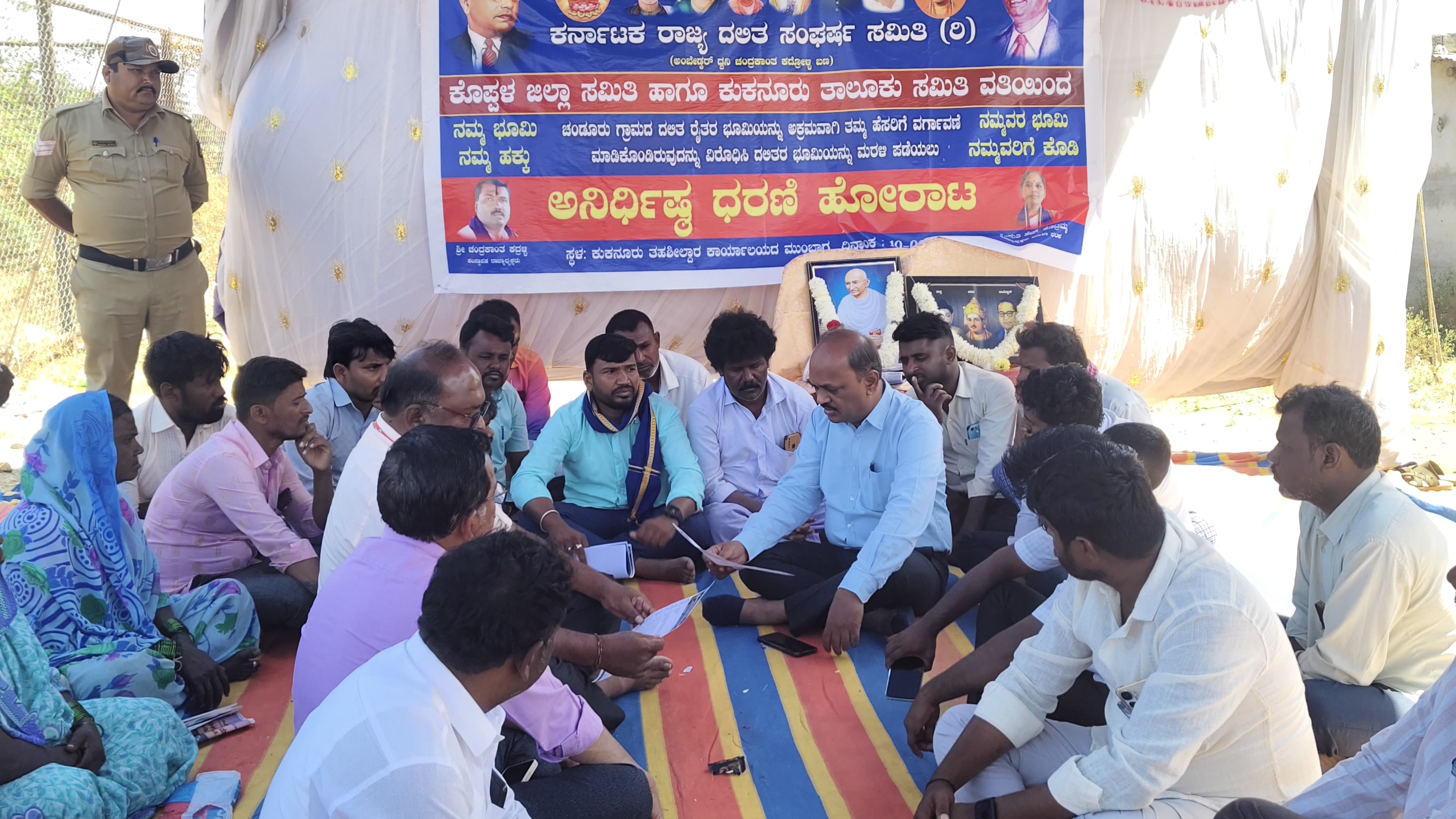 ಪಟ್ಟಣದ ತಹಸೀಲ್ದಾರ ಕಚೇರಿಯಲ್ಲಿ ಎದುರು ರಾಜ್ಯ ದಲಿತ ಸಂಘರ್ಷ ಸಮಿತಿ–ಅಂಬೇಡ್ಕರ್ ಧ್ವನಿ, ಚಂದ್ರಕಾಂತ ಎಸ್.ಕಾದ್ರೋಳ್ಳಿ ಬಣದವರು ತಾಲೂಕಿನ ಚಂಡೂರು ಗ್ರಾಮದಲ್ಲಿ ದಲಿತರ ಜಮೀನಿನಲ್ಲಿ ಸೋಲಾರ್ ಪ್ಯಾನಲ್ ಅಳವಡಿಕೆ ಕಾರ್ಯ ಆಗುತ್ತಿದ್ದು, ಅದನ್ನು ನಿಲ್ಲಿಸಿ ದಲಿತರಿಗೆ ಭೂಮಿ ವಾಪಸ್ ಮಾಡುವಂತೆ ಆಗ್ರಹಿಸಿ ಮಂಗಳವಾರ ಹಾಗೂ ಬುಧವಾರ ಹಮ್ಮಿಕೊಂಡಿದ್ದ ಅನಿರ್ಧಿಷ್ಟಾವಧಿ ಧರಣಿ ಸ್ಥಳಕ್ಕೆ ಬುಧವಾರ ಆಗಮಿಸಿ ಮಾತನಾಡಿದ ಅವರು, ದಲಿತರಿಗೆ ಅನ್ಯಾಯ ಆಗದಂತೆ ಕ್ರಮ ತೆಗೆದುಕೊಳ್ಳಲಾಗುವುದು. ಧರಣಿ ಕಾರ್ಯ ನ್ಯಾಯದ ಪರ ಧ್ವನಿ ಆಗಿದ್ದು ಧರಣಿ ಕೈ ಬಿಡುವಂತೆ ತಿಳಿಸಿದರು. ಅವರ ಮಾತಿನಂತೆ ಧರಣಿಕಾರರು ಕೈ ಬಿಟ್ಟರು.ಕರ್ನಾಟಕ ರಾಜ್ಯ ದಲಿತ ಸಂಘರ್ಷ ಸಮಿತಿ–ಅಂಬೇಡ್ಕರ್ ಧ್ವನಿ, ಚಂದ್ರಕಾಂತ ಎಸ್.ಕಾದ್ರೋಳ್ಳಿ ಬಣದ ಜಿಲ್ಲಾಧ್ಯಕ್ಷ ನಿಂಗಪ್ಪ ಬೆಣಕಲ್ಲ, ಕಾರ್ಯದರ್ಶಿ ಕರಿಯಪ್ಪ ಡಿ ಮಣ್ಣಿನವರ, ಜಿಲ್ಲಾ ಪ್ರಧಾನ ಸಂಚಾಲಕ ಮೈಲಾಪ್ಪ ಮಾದಿನೂರು, ಕುಕನೂರು ತಾಲೂಕಾಧ್ಯಕ್ಷ ಶ್ರೀಕಾಂತ ಹೊಸಮನಿ, ಕಾರ್ಯದರ್ಶಿ ಲೋಹಿತ್ ಬಳಗೇರಿ, ರೈತರಾದ ಈರಪ್ಪ ಹಿರೇಮನಿ, ಶಶಿಕಲಾ ಮಠದ, ಸಂಜೀವ ಮೂರ್ತಿ, ಯಲ್ಲಪ್ಪ ಮೆಳ್ಳಿಕೇರಿ, ಮಾರುತಿ ದೊಡ್ಡಮನಿ ಇತರರಿದ್ದರು.