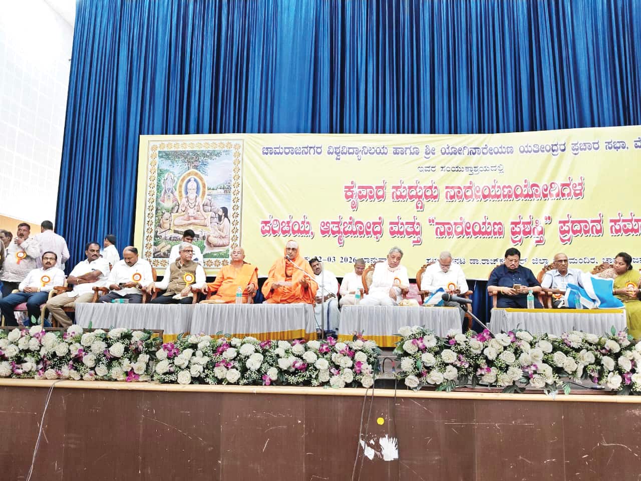 ---ಕನ್ನಡಪ್ರಭ ವಾರ್ತೆ ಚಾಮರಾಜನಗರಸಂತರು ಜೀವನದ ಮೌಲ್ಯಗಳು ಹಾಗೂ ತತ್ವಾದರ್ಶಗಳನ್ನು ಅನುಸರಿಸಿದರೆ ಜೀವನದಲ್ಲಿ ನೆಮ್ಮದಿ ಎಂದು ಸುತ್ತೂರು ಶ್ರೀ ಶಿವರಾತ್ರಿ ದೇಶಿಕೇಂದ್ರ ಸ್ವಾಮೀಜಿ ಹೇಳಿದರು.ಚಾಮರಾಜನಗರ ವಿವಿ ಹಾಗೂ ಶ್ರೀ ಯೋಗಿ ನಾರೇಯಣ ಯತೀಂದ್ರರ ಪ್ರಚಾರ ಸಭಾ ಮೈಸೂರು ಆಯೋಜಿಸಿದ್ದ ಕೈವಾರ ಸದ್ಗುರು ನಾರೇಯಣರ ಪರಿಚಯ, ಆತ್ಮಬೋಧನೆ ಮತ್ತು ನಾರೇಯಣ ಪ್ರಶಸ್ತಿ ಪ್ರದಾನ ಸಮಾರಂಭದಲ್ಲಿ ಮೈಸೂರು ರಾಮಕೃಷ್ಣ ಆಶ್ರಮದ ಅಧ್ಯಕ್ಷ ಸ್ವಾಮಿ ಮುಕ್ತಿದಾನಂದಾಜೀ ಮಹಾರಾಜ್ ಅವರಿಗೆ ನಾರೇಯಣ ಪ್ರಶಸ್ತಿ ಪ್ರದಾನ ಮಾಡಿ ಅವರು ಮಾತನಾಡಿದರು.ಇಂತಹ ಶ್ರೇಷ್ಠ ಸಂತರಲ್ಲಿ ಕೈವಾರ ತಾತಯ್ಯ ಯೋಗಿ ನಾರೇಯಣ ಗುರು ಒಬ್ಬರು. ಈ ನಾಡು ಕಂಡಂತಹ ಅಪರೂಪದ ಶ್ರೇಷ್ಠ ಸಂತರು ಎಂದರು.ಕೈವಾರ ತಾತಯ್ಯ ೧೯ನೇ ಶತಮಾನದ ಆರಂಭದಲ್ಲಿ ಪ್ರಸಿದ್ಧ ದ್ವಿಭಾಷಾ ಕವಿ ಸಂತ ಮತ್ತು ಜ್ಞಾನ ಯೋಗಿಯಾಗಿದ್ದರು. ಅವರು ಅಮರ ನಾರಾಯಣ ಅವರ ಪರಮ ಭಕ್ತರಾಗಿದ್ದರು. ಅಂದೇ ಇಂದಿನ ಭಯಾನಕ ಘಟನೆಗಳ ಬಗ್ಗೆ ಕಾಲಜ್ಞಾನ ಮತ್ತು ಭವಿಷ್ಯವಾಣಿ ತತ್ವ ಪದಗಳನ್ನು ರಚನೆ ಮಾಡಿದ್ದರು ಎಂದರು.ಪ್ರಸ್ತುತ ಜಗತ್ತಿನಲ್ಲಿ ನಡೆಯುತ್ತಿರುವ ಯುದ್ಧಗಳಿಂದ ಶಾಲಾ ಮಕ್ಕಳು ಧಾರುಣವಾಗಿ ಮೃತಪಡುತ್ತಿದ್ದಾರೆ. ತಂದೆ ತಾಯಿಗಳ ಆಕ್ರಂದನ ಎಂತಹ ಮನಸ್ಸನ್ನು ಕಲಕುತ್ತಿದೆ. ಇವೆಲ್ಲಕ್ಕೂ ಸಂತರ ಹಾಗೂ ತತ್ವಾದರ್ಶಗಳು ಪರಿಹಾರ ನೀಡಿ ಮಾನವ ಕುಲ ಒಂದೇ ಎಂದು ಸಾರಿ ಹೇಳುತ್ತವೆ ಎಂದರು.ಯೋಗಿ ನಾರೇಯಣ ಯತೀಂದ್ರರು ಕಠಿಣ ತಪಸ್ಸು ಮಾಡಿ, ಯೋಗ ಸಿದ್ಧಿ ಪಡೆದು ಬಳೆ ಮಾರುವ ಕಾಯಕದೊಂದಿಗೆ ಜನರಿಗೆ ಸನ್ಮಾರ್ಗ ತೋರಿದ ಮಹಾತ್ಮರು. ಇಂಥವರ ಹೆಸರಿನಲ್ಲಿ ಪ್ರಶಸ್ತಿ ನೀಡುವ ಮೂಲಕ ಸೇವಾ ಗುಣಗಳನ್ನು ಜಗತ್ತಿಗೆ ತಿಳಿಸುವ ಕಾರ್ಯ ಮಹತ್ವಪೂರ್ಣವಾಗಿದೆ ಎಂದರು.ಬಾಲ್ಯದಲ್ಲಿಯೇ ಹೆತ್ತವರನ್ನು ಕಳೆದುಕೊಂಡು ದೇವಸ್ಥಾನದ ಅರ್ಚಕರ ಆಶ್ರಯದಲ್ಲಿ ಬೆಳೆದು ತಾತಯ್ಯ ಅವರು ಹುಟ್ಟು ಪವಾಡವಾಗಿದೆ. ತಾತಯ್ಯ ಅವರು ಭೂವಿಗೆ ಬರಬಾರದೆಂದು ವಿಷವಿಕ್ಕಿ ಕೊಲ್ಲುವಂತಹ ಸನ್ನಿವೇಶ ಸೃಷ್ಠಿಯಾಯಿತು. ತಾತಯ್ಯನವರ ಜನನವಾದ ಬಳಿಕ ಮಗುವನ್ನು ಕಾಡಿಗೆ ಎಸೆಯಲು ಮುಂದಾದಾಗ ಸರ್ಪ ಅಡ್ಡ ಬಂದ ಪರಿಣಾಮ ಅವರು ವಾಪಸ್ ಹೋಗುತ್ತಾರೆ. ಹೀಗಾಗಿ ಅವರ ಜನನವೇ ಒಂದು ಪವಾಡ, ಸರಳ ವ್ಯಕ್ತಿತ್ವ ಕೈವಾರ ತಾತಯ್ಯ ಅವರ ಮಹಿಮೆ ಪವಾಡಗಳು ಅಪಾರವಾಗಿದೆ ಎಂದರು.ಕೈವಾರ ತಾತಯ್ಯ ವೃತ್ತಿಯ ಜೊತೆಗೆ ಸಾಮಾಜಿಕ ಸೇವೆಯಲ್ಲಿ ತೊಡಗಿಸಿಕೊಂಡು ಯೋಗ, ಧಾನ್ಯ ಮತ್ತು ಅಧ್ಯಾತ್ಮಿಕತೆಯನ್ನು ಬೆಳೆಸಿದರು. ಅಲ್ಲಿಂದ ೧೧೦ ವರ್ಷಬದುಕಿದ್ದ ಅವರು, ಜೀವಂತ ಸಮಾಧಿಯಾದರು. ತಾತಯ್ಯ ತಪಸ್ಸುಗೈದ ಪುಣ್ಯ ಭೂಮಿ ಕೈವಾರ ಪುಣ್ಯ ಕ್ಷೇತ್ರವಾಗಿ ಪರಿವರ್ತನೆಯಾಗಿದೆ. ಪ್ರಮುಖ ಪ್ರವಾಸಿ ತಾಣ ಮತ್ತು ಪುಣ್ಯ ಕ್ಷೇತ್ರವಾಗಿ ಬೆಳೆಯುತ್ತಿದೆ. ಈ ಪವಾಡ ಪುರುಷರ ತತ್ವ ಅದರ್ಶಗಳನ್ನು ಮೈಗೂಡಿಸಿಕೊಳ್ಳಬೇಕು ಎಂದರು.ನಂತರ ಎಂ.ಎಸ್. ರಾಮಯ್ಯ ಅವರ ಮಕ್ಕಳಾದ ಡಾ.ಎಂ.ಆರ್. ಜಯರಾಮ್ ಅವರು ಮತ್ತು ಸಹೋದರರರು ಕೈವಾರ ಕ್ಷೇತ್ರವನ್ನು ಅಭಿವೃದ್ಧಿಪಡಿಸುವ ಜೊತೆಗೆ ಹಳ್ಳಿ ಹಳ್ಳಿಗಳಲ್ಲಿ ನಾರೇಯಣರ ಭಜನೆ ಮತ್ತು ಕೀರ್ತನೆಗಳನ್ನು ಹಾಡುವ ಮೂಲಕ ಧರ್ಮ ಜಾಗೃತಿ ಮೂಡಿಸುತ್ತಿದ್ದಾರೆ ಎಂದು ಸ್ವಾಮೀಜಿ ಮೆಚ್ಚುಗೆ ವ್ಯಕ್ತಪಡಿಸಿದರು.ಮೈಸೂರಿನ ರಾಮಕೃಷ ಆಶ್ರಮದ ಅಧ್ಯಕ್ಷರಾದ ಸ್ವಾಮಿ ಮುಕ್ತಿದಾನಂದಾಜೀ ಮಹಾರಾಜ್ ಮಾತನಾಡಿ, ಪ್ರಶಸ್ತಿಯನ್ನು ನೀಡುತ್