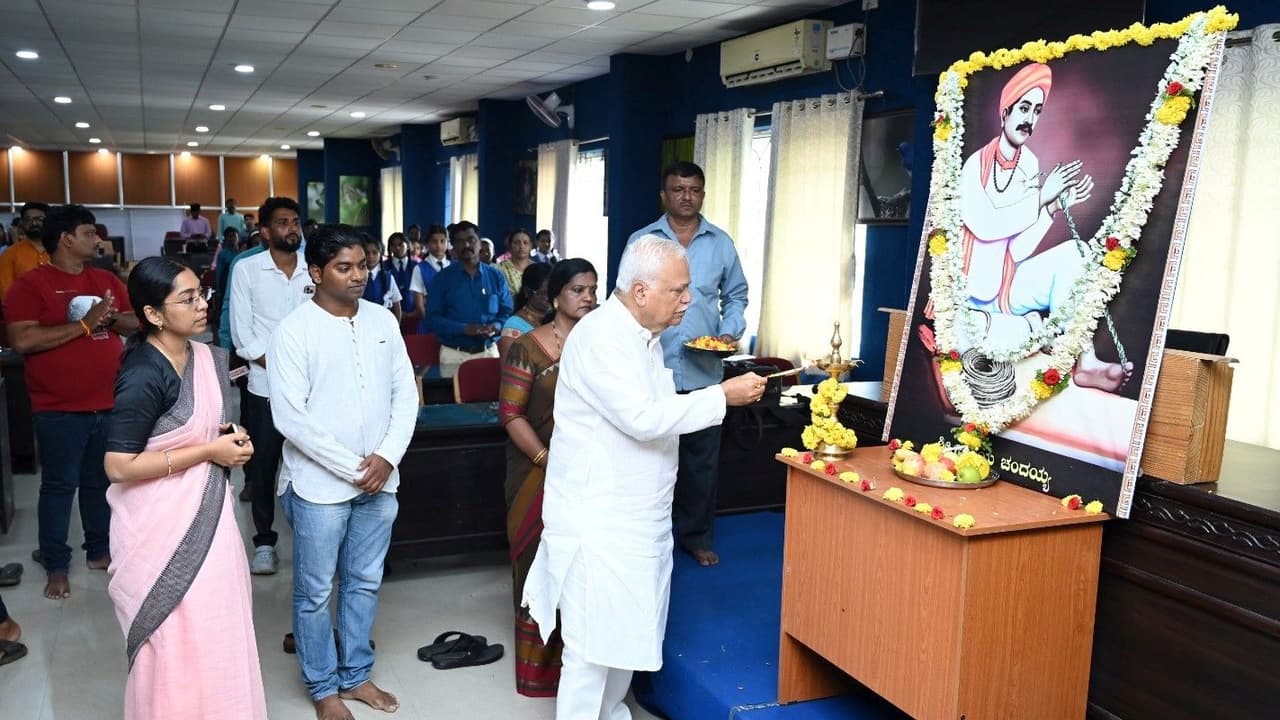 ಕಾರವಾರ: ಆಡಳಿತ ಸುಧಾರಣಾ ಆಯೋಗದ ಅಧ್ಯಕ್ಷ ಆರ್.ವಿ. ದೇಶಪಾಂಡೆ ಮತ್ತು ಜಿಲ್ಲಾಧಿಕಾರಿ ಲಕ್ಷ್ಮೀಪ್ರಿಯಾ ನುಲಿಯ್ಯ ಚಂದಯ್ಯ ಅವರ ಭಾವಚಿತ್ರಕ್ಕೆ ಪುಷ್ಪಾರ್ಚನೆ ಮಾಡುವ ಮೂಲಕ ನುಲಿಯ ಚಂದಯ್ಯ ಜಯಂತಿ ಉದ್ಘಾಟಿಸಿದರು.