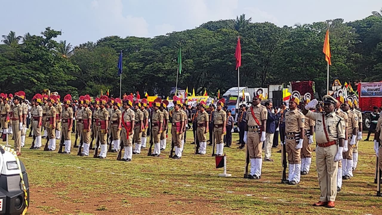 ಚಿಕ್ಕಮಗಳೂರಿನ ಜಿಲ್ಲಾ ಆಟದ ಮೈದಾನದಲ್ಲಿ ಶುಕ್ರವಾರ ನಡೆದ ಕನ್ನಡ ರಾಜ್ಯೋತ್ಸವ ಸಮಾರಂಭದಲ್ಲಿ ಜಿಲ್ಲಾ ಉಸ್ತುವಾರಿ ಸಚಿವ ಕೆ.ಜೆ. ಜಾರ್ಜ್ ಸಾಮೂಹಿಕ ಕವಾಯತಿನಲ್ಲಿ ಪಾಲ್ಗೊಂಡಿದ್ದ ತುಕಡಿಗಳಿಂದ ಗೌರವ ಸ್ವೀಕರಿಸಿದರು.